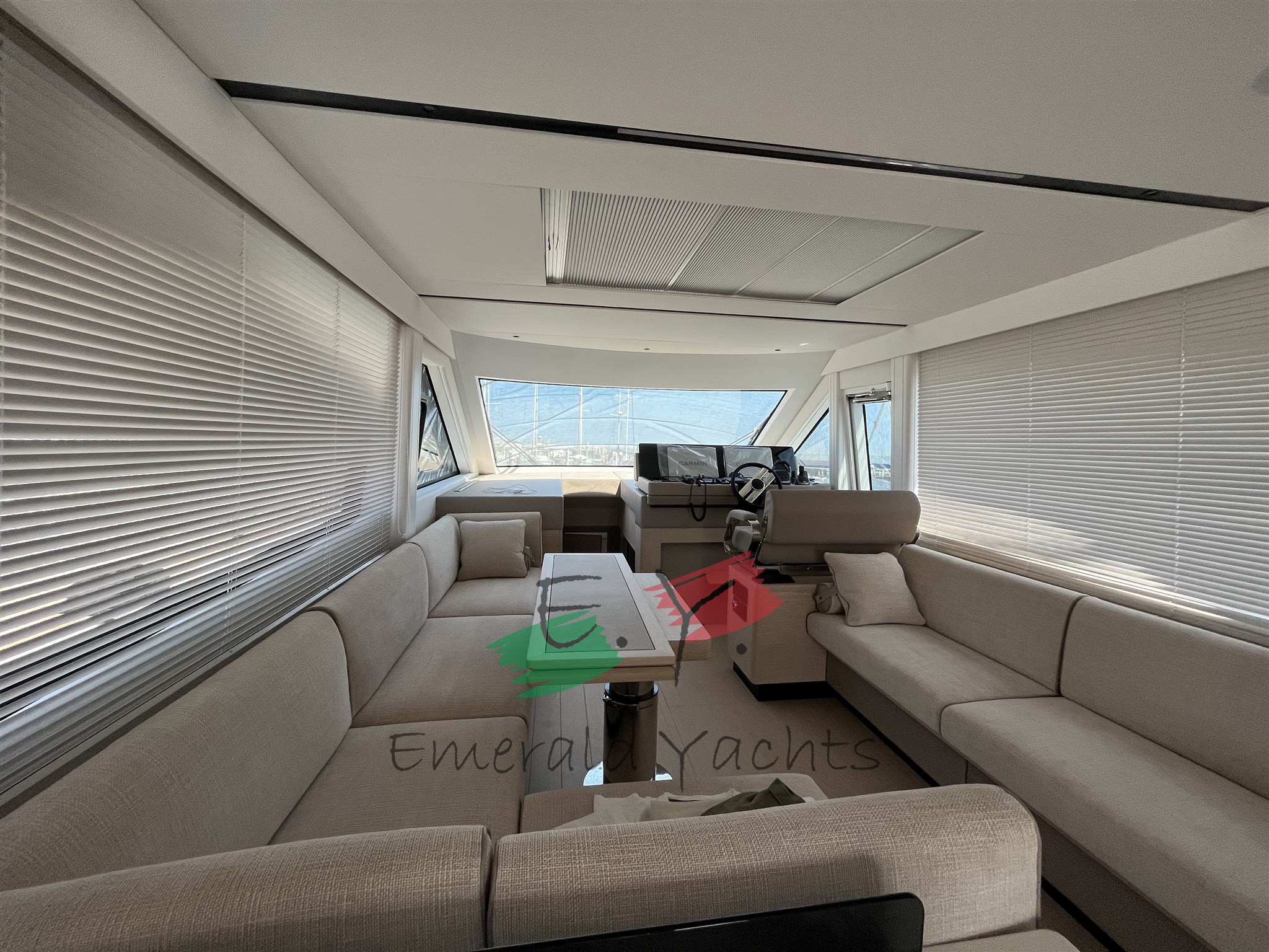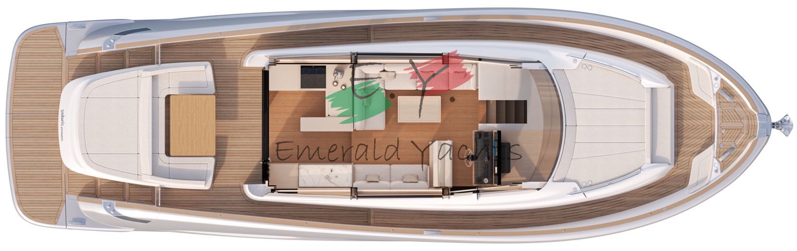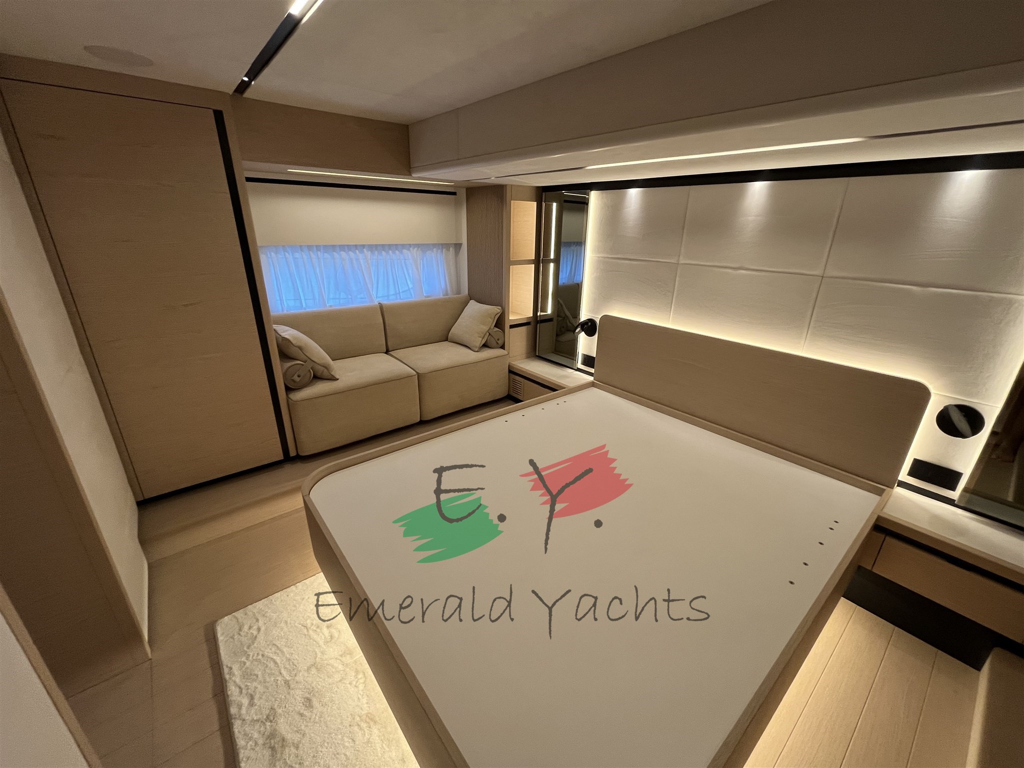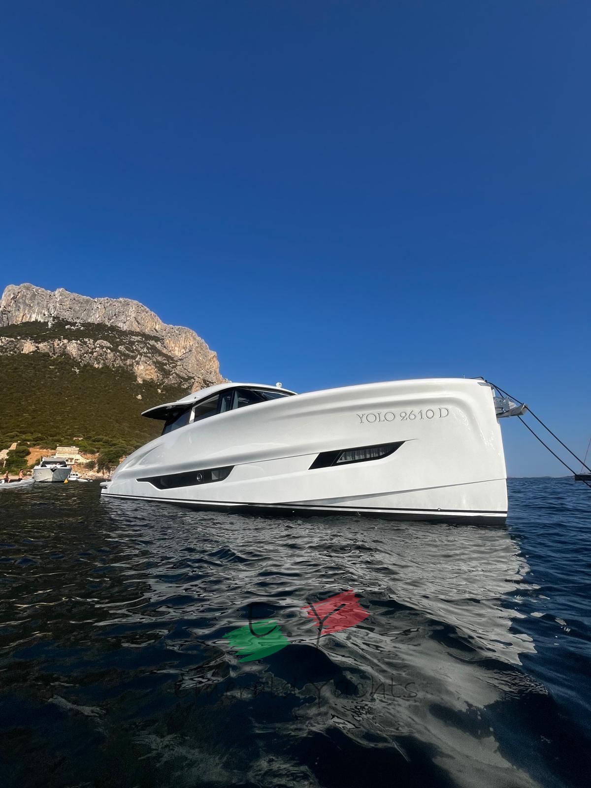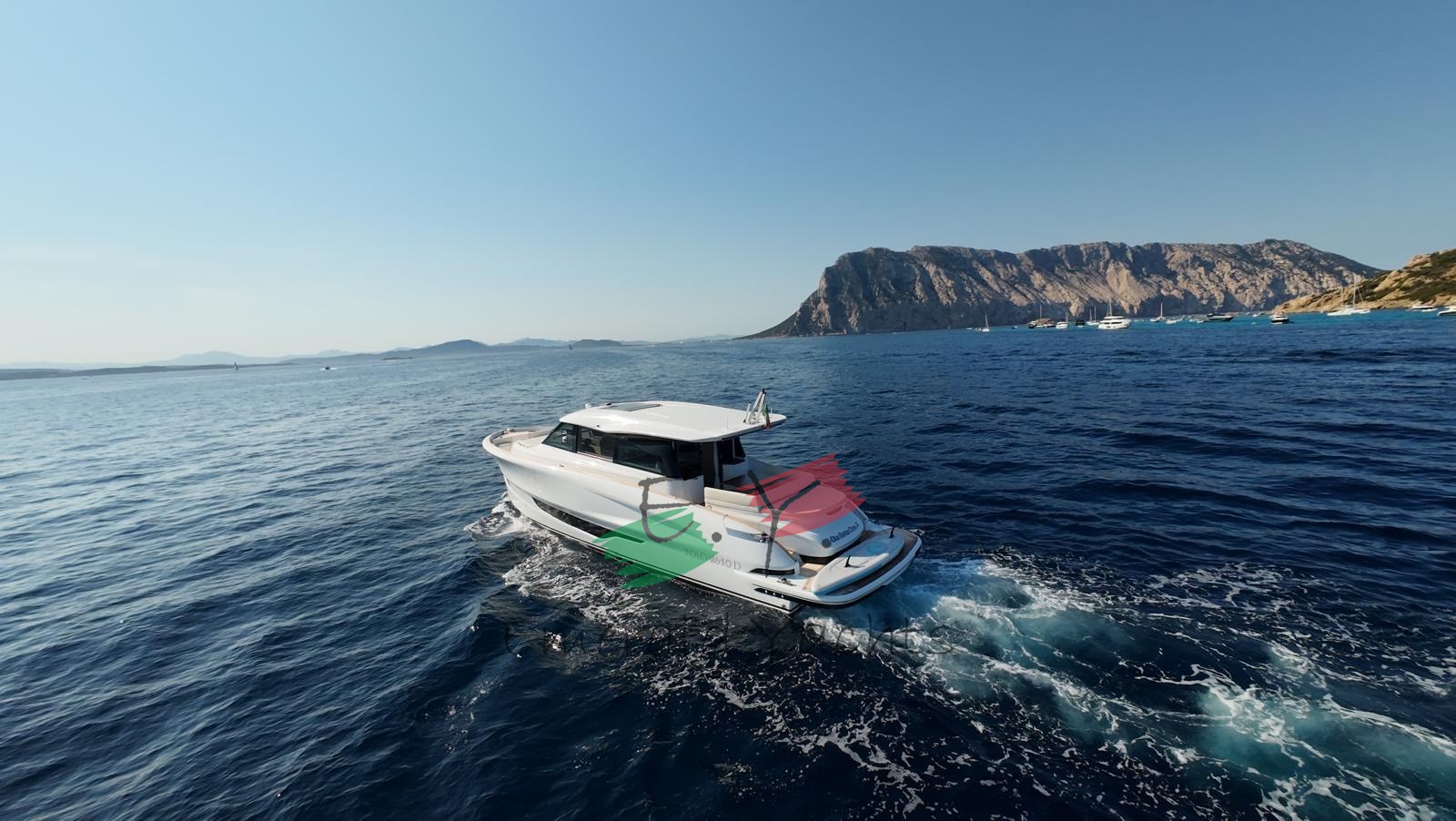 Innen-Dinette mit Minibar; eichenfarbenes Interieur; Eiscreme-Außenpolsterung; Wohnzimmer mit C-förmigem Sofa und Küche mit Säulenkühlschrank; Armaturenbrett im Dinette mit großem Fahrersitz; Öffnung des Bullaugenfensters zur hinteren Kabine des Rumpfes; Sonnendeck mit Edelstahlbecherhalter; eine überdimensionierte Schwimmplattform am Heck; Edelstahlkanone im Heck; Reling auf der Wakaround; Paket der öffnenden Fenster; Schiebedach auf Hauptdeck; Seitenkompasstür; Gehwegsteuerung per App; Ergänzung mit einem Diamant-Effekt-Design auf der Außenpolsterung; natürliches Teakdeck mit hellgrauem Comento; Cockpitmöbel für Stauraum und Entspannungsbereiche; Vollstrahl-Heckkabine mit Stauraum und Sofa; Hauptdeck-Tisch mit manuellem Hoch- und Runtersystem; Kessel aus Eichenlamellen auf dem unteren Deck; Kabinenbett des Besitzers mit Kolbenöffnung und Stauraum; Treppenhandläufe auf der linken Seite zum Absteigen der Kabinen; N.2 Steckdosen für den Lagerraum; Eismacher in den Kühlschrank integriert; dunkelgraues Coverpaket; Cockpittisch, hintere und Bug-Sonnendeckabdeckung; Windschutzscheibenabdeckung; Hecktore aus Edelstahl; zusätzliche Versorgungsbatterien; schwarzes Antifouling; Fernbedienung für den Bugtriebwerk.