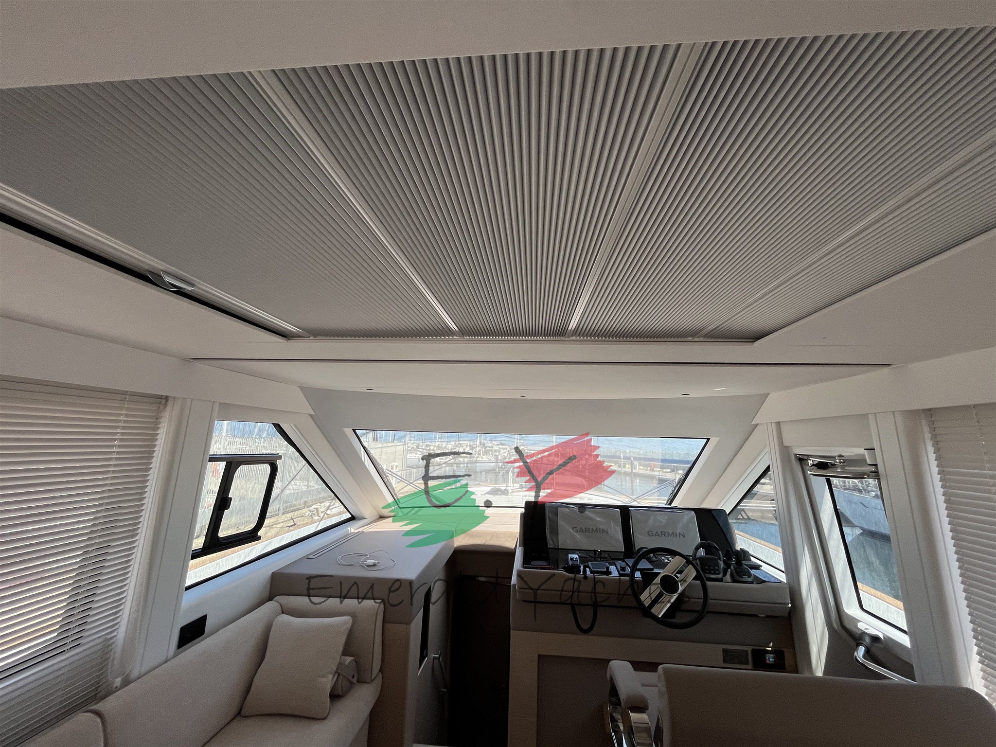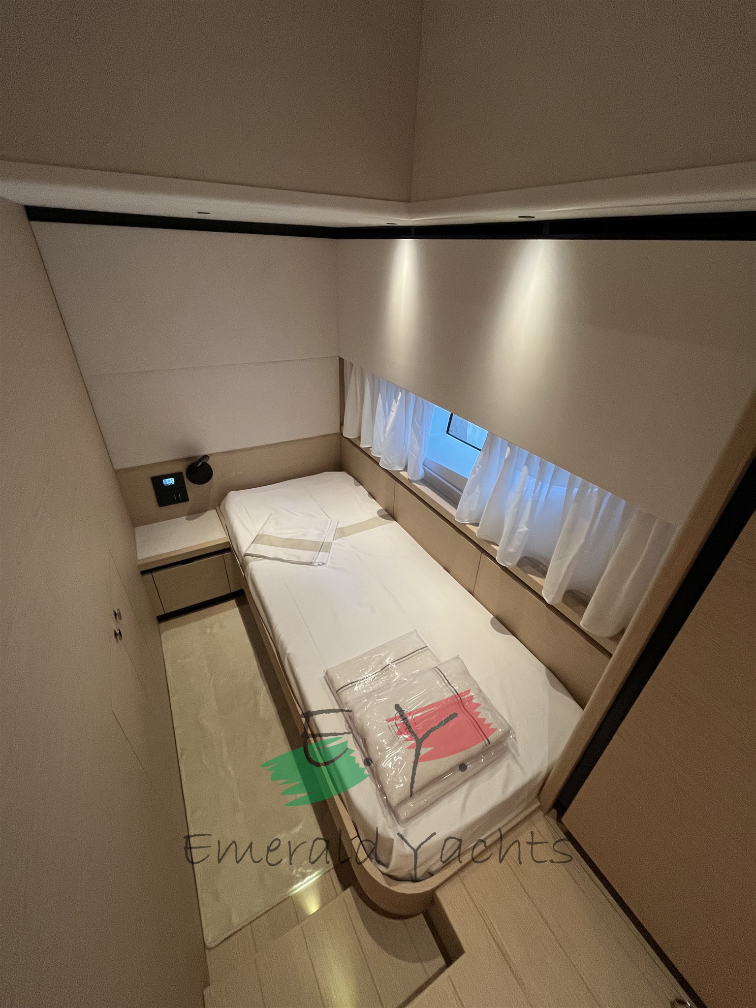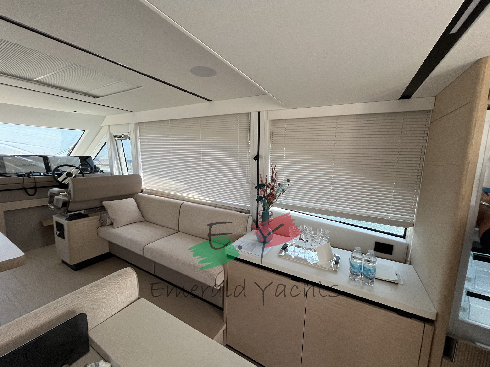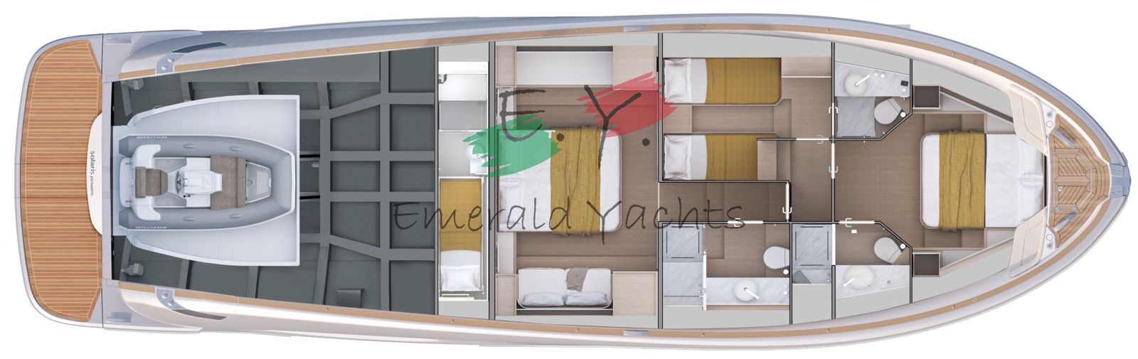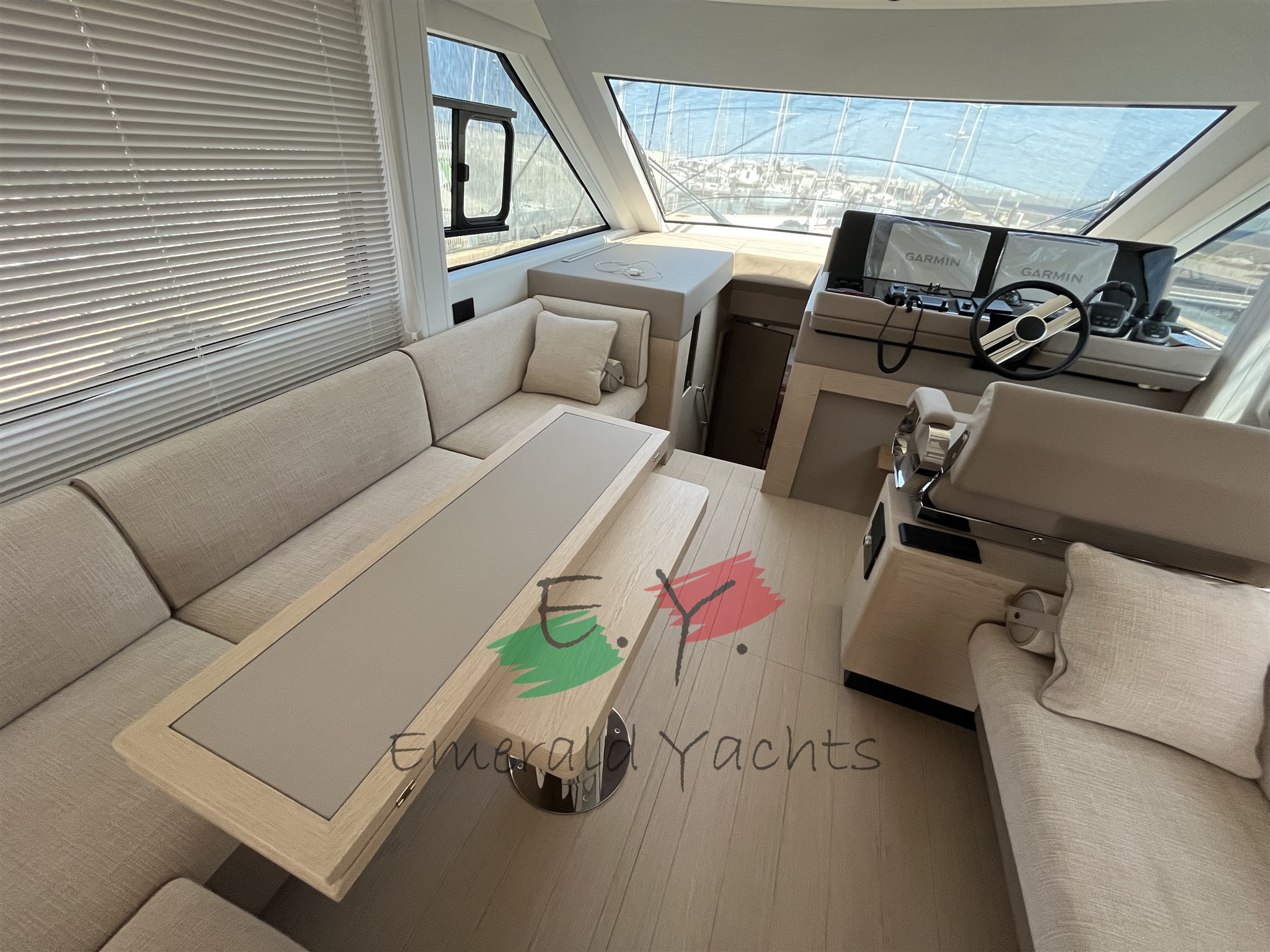Innen-Dinette mit Minibar; eichenfarbenes Interieur; Eiscreme-Außenpolsterung; Wohnzimmer mit C-förmigem Sofa und Küche mit Säulenkühlschrank; Armaturenbrett im Dinette mit großem Fahrersitz; Öffnung des Bullaugenfensters zur hinteren Kabine des Rumpfes; Sonnendeck mit Edelstahlbecherhalter; eine überdimensionierte Schwimmplattform am Heck; Edelstahlkanone im Heck; Reling auf der Wakaround; Paket der öffnenden Fenster; Schiebedach auf Hauptdeck; Seitenkompasstür; Gehwegsteuerung per App; Ergänzung mit einem Diamant-Effekt-Design auf der Außenpolsterung; natürliches Teakdeck mit hellgrauem Comento; Cockpitmöbel für Stauraum und Entspannungsbereiche; Vollstrahl-Heckkabine mit Stauraum und Sofa; Hauptdeck-Tisch mit manuellem Hoch- und Runtersystem; Kessel aus Eichenlamellen auf dem unteren Deck; Kabinenbett des Besitzers mit Kolbenöffnung und Stauraum; Treppenhandläufe auf der linken Seite zum Absteigen der Kabinen; N.2 Steckdosen für den Lagerraum; Eismacher in den Kühlschrank integriert; dunkelgraues Coverpaket; Cockpittisch, hintere und Bug-Sonnendeckabdeckung; Windschutzscheibenabdeckung; Hecktore aus Edelstahl; zusätzliche Versorgungsbatterien; schwarzes Antifouling; Fernbedienung für den Bugtriebwerk.