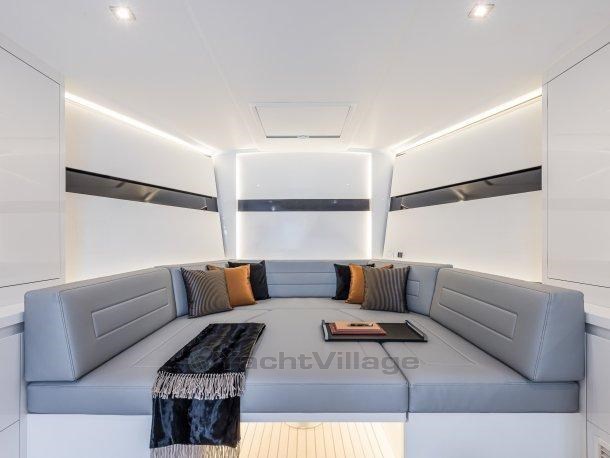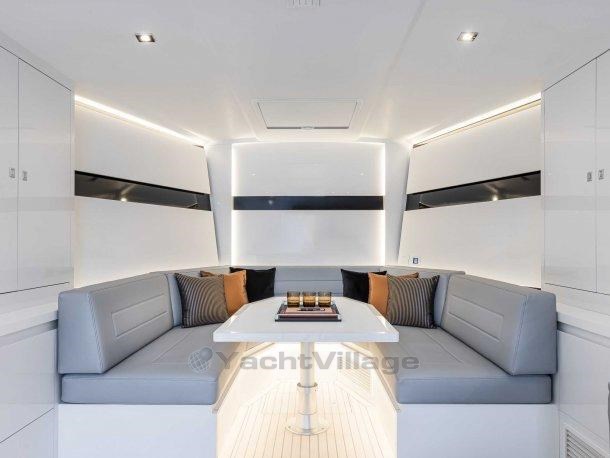 Das Interieur des VanDutch 56 hat eine doppelte Anordnung. Das "Lounge"-Layout ermöglicht es, das Boot als großen offenen Raum zu erleben, in dem ein gemütliches Sofa mit eigenem Tisch für den Anlass in ein Bett umgewandelt werden kann. Im Heck, auf der Backbordseite, befindet sich eine lineare Kombüse gegenüber dem L-förmigen Sofa. Die "Kabinen"-Version hingegen erlaubt eine Hauptkabine mit Doppelbett am Bug. Dieses zweite Layout bietet dieselbe Lösung mit einem L-förmigen Sofa und einer linearen Kombüse, mit der Möglichkeit, eine zweite Kabine mit Doppelbett hinzuzufügen.