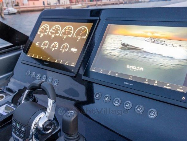 Die Bordinstrumente tragen die prestigeträchtige Signatur von Garmin Marine mit EmpireBus-Technologie. Die Steuerung des VanDutch 56 erfolgt über eine einzige Konsole, die zwei 16-Zoll-Displays enthält, von denen aus man die gesamte Hausautomation des Bootes koordinieren kann.