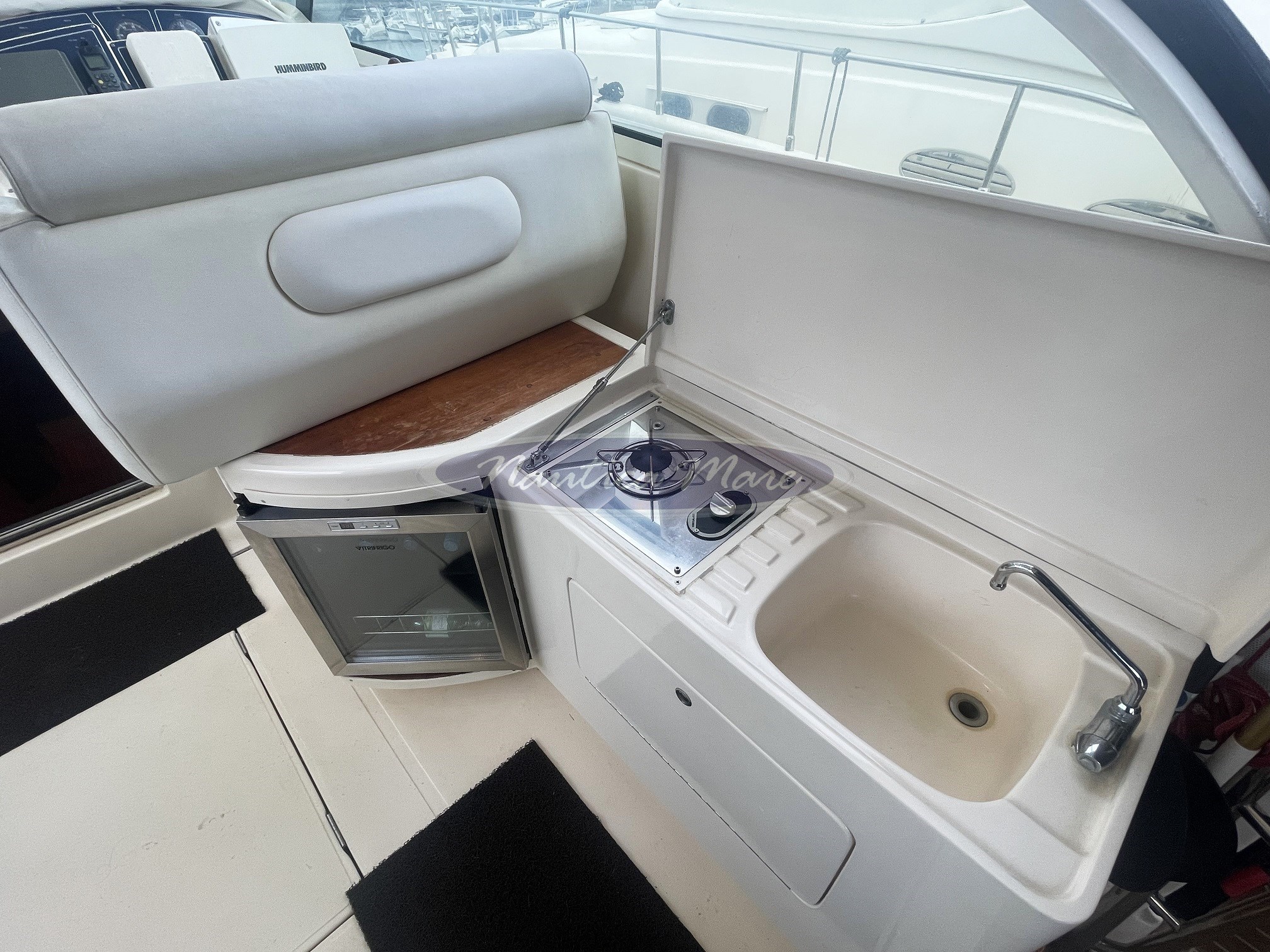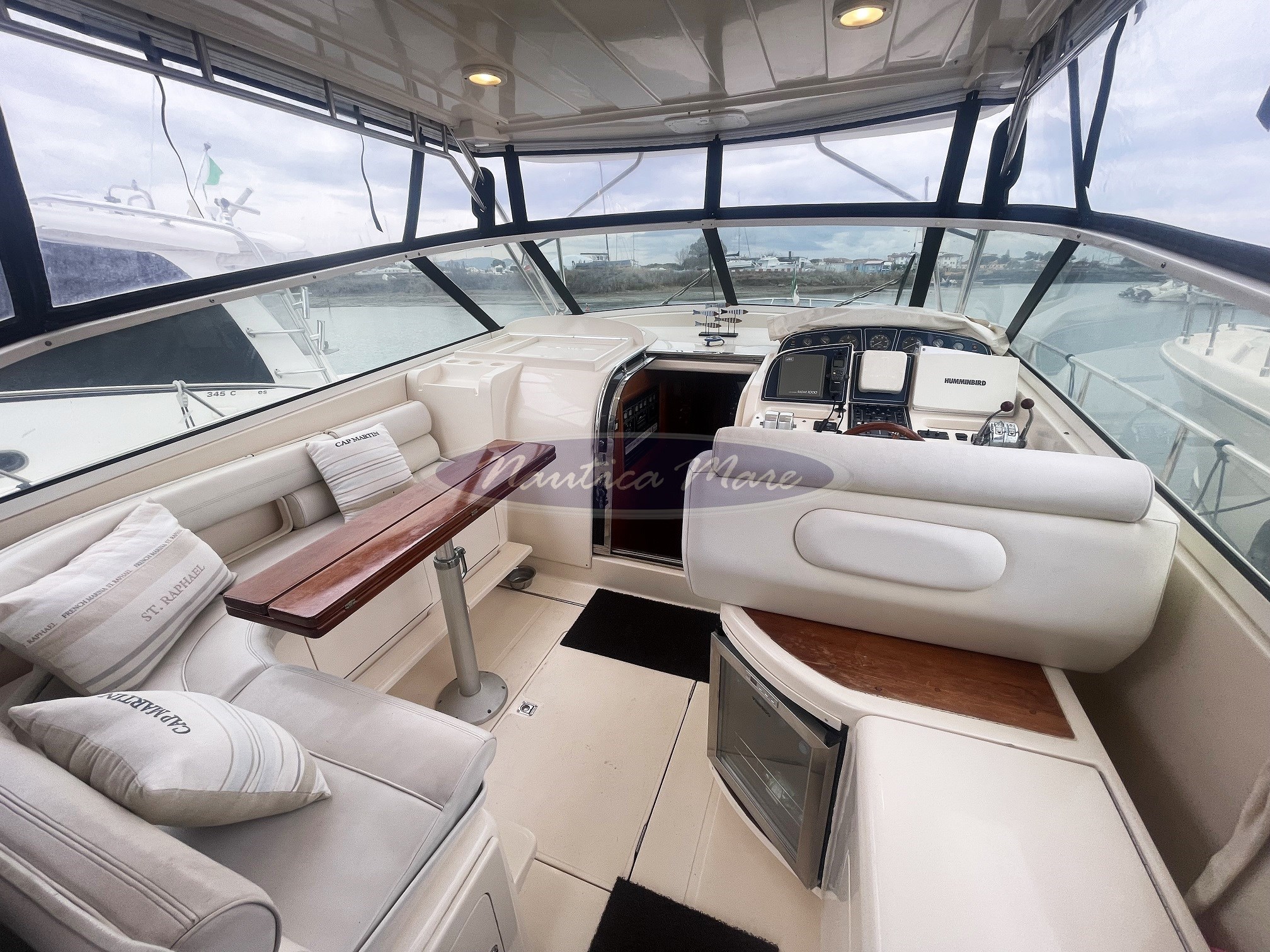 Das Cockpit (mit synthetischer Teakholzverkleidung), die großzügige Steuerposition mit Doppel-Steuersitz und das Außen-Esszimmer mit L-förmigem Sofa und Holztisch sind durch eine komplette Serie von Markisen (sowohl im Sommer als auch im Winter) geschützt, die auf einem stabilen Fiberglas-Hardtop auf einer Stahlkonstruktion montiert sind. Im Außen-Essbereich gibt es außerdem Platz für eine sehr komfortable Wetbar mit Kühlschrank, Waschbecken und Gasfeuer.