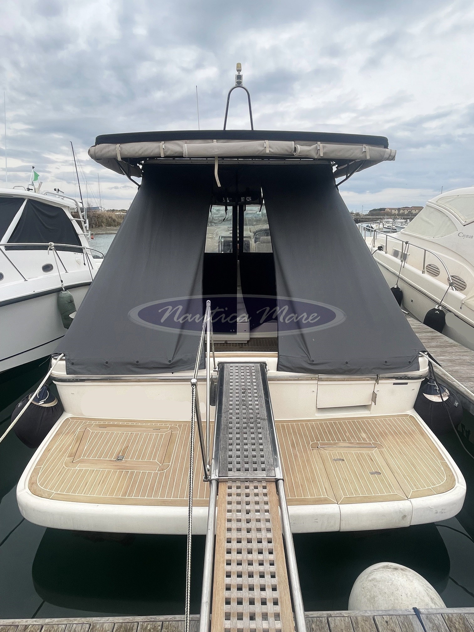 Ein Marineboot mit großzügigen Räumen: große Schwimmplattform achtern mit synthetischer Teakholzverkleidung, hydraulischer Gang aus Stahl und Teakholz, Thunfischtür für den Zugang zum Cockpit und ein großer Rundgang für eine komfortable, schnelle und sichere Passage zum Bug.