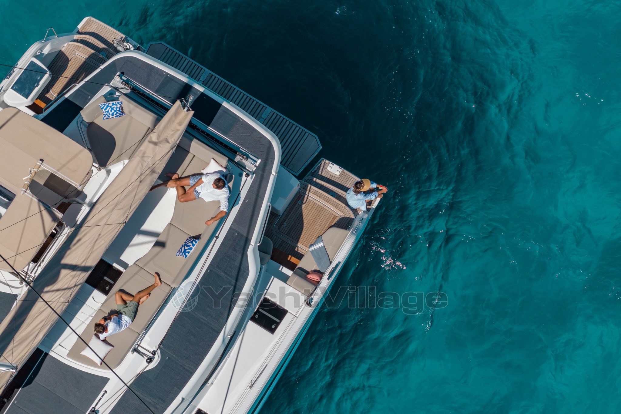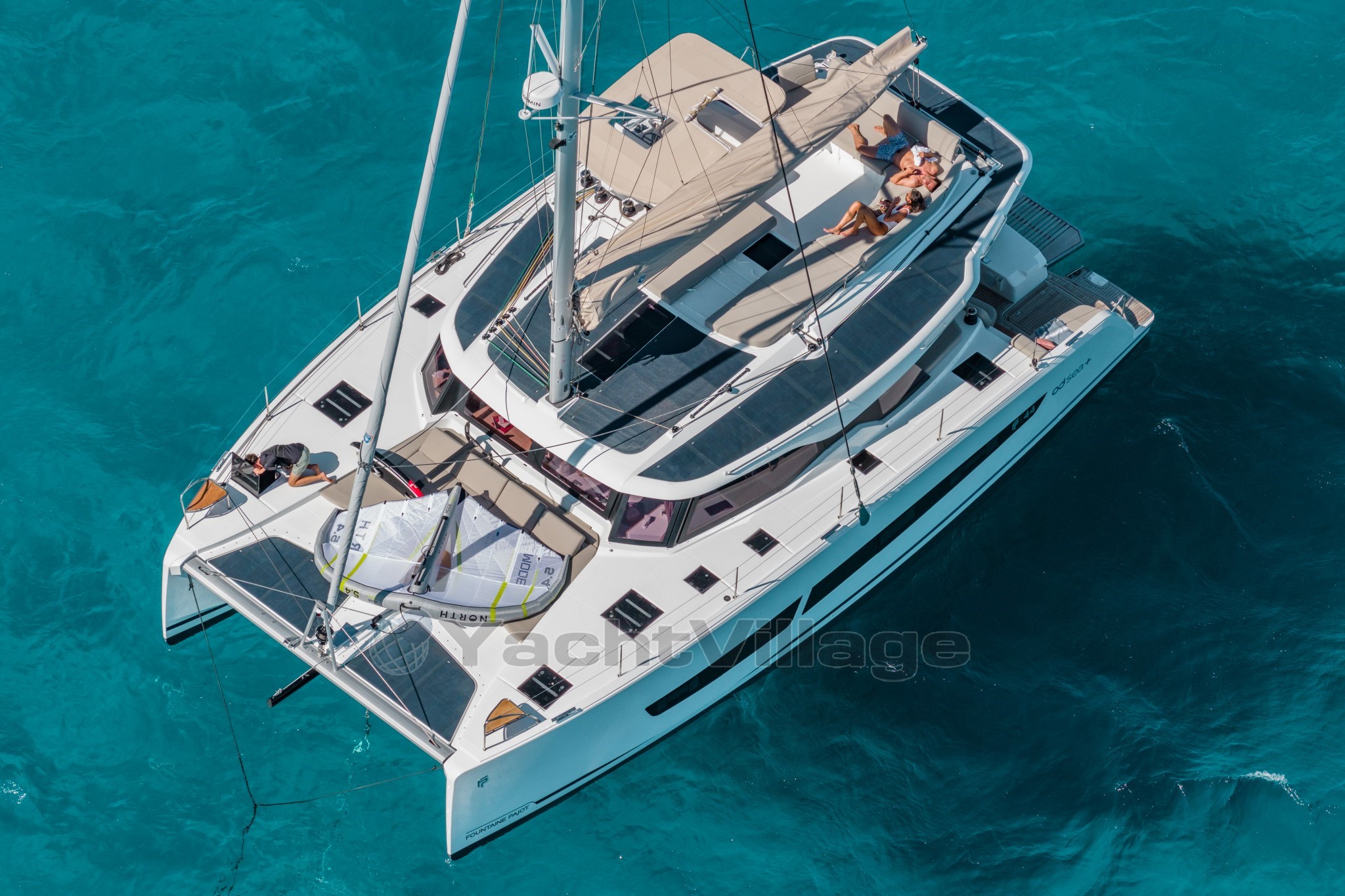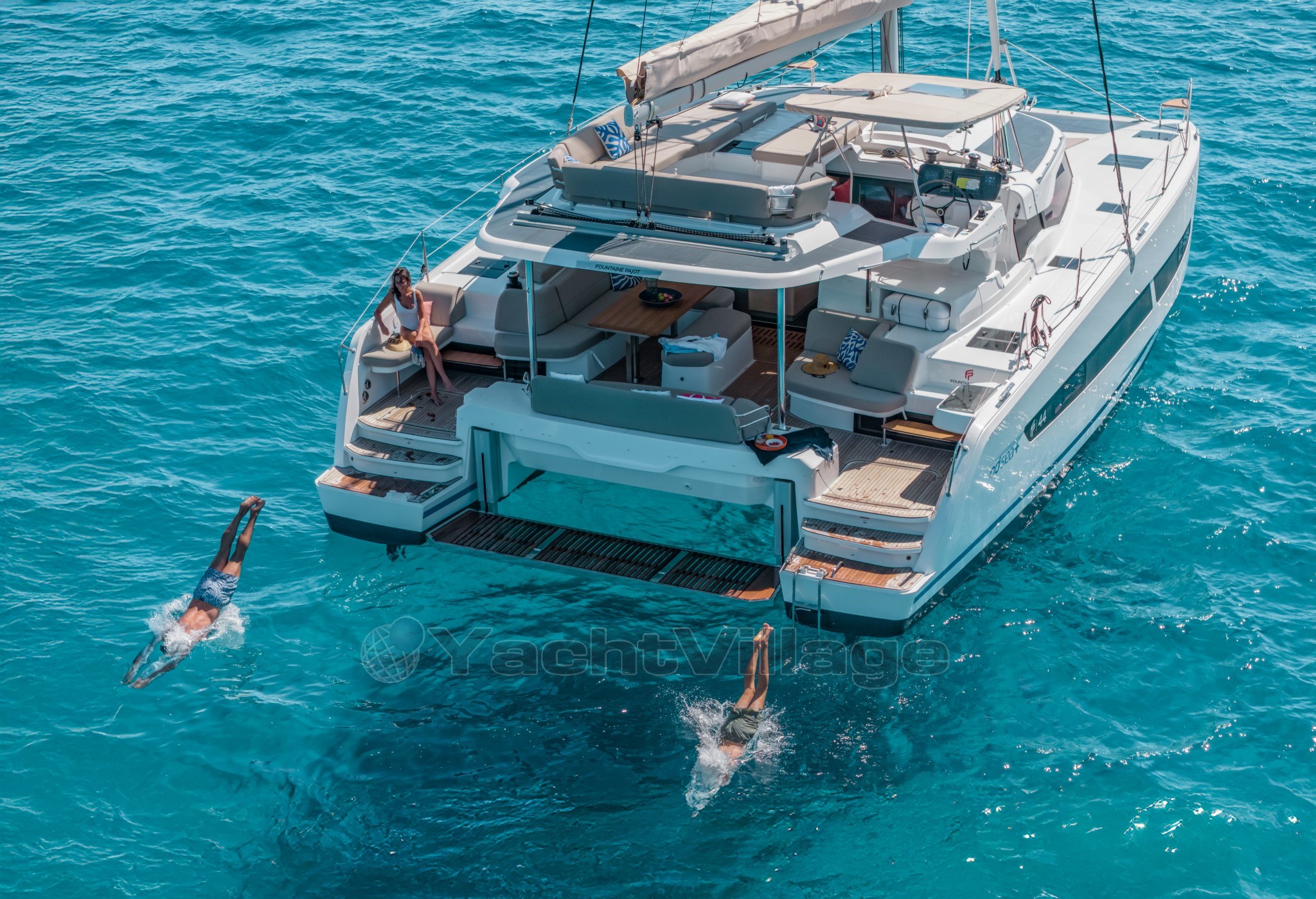 Modern design by Fountaine Pajot. Spacious cockpit directly connected to the saloon. Flybridge with raised helm station and sunbathing area. Generous forward trampoline. Secure gangways.