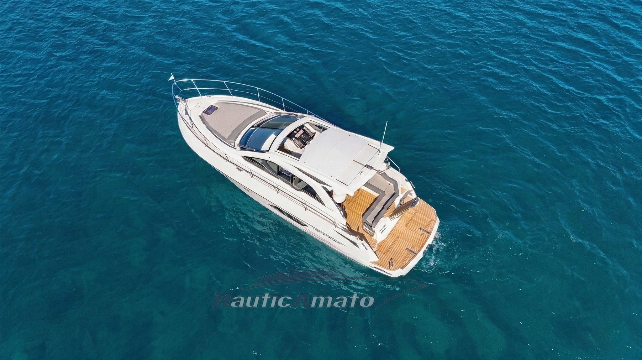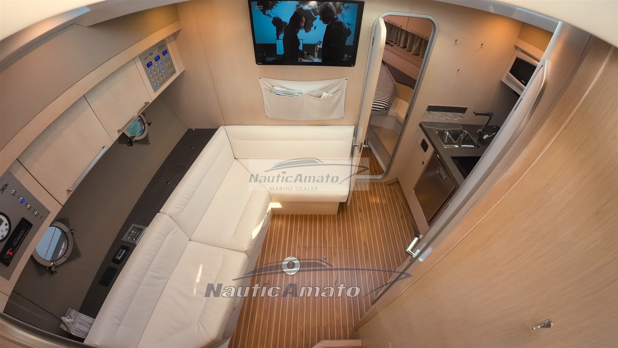 Viele intelligente Lösungen wurden eingeführt, darunter eines der größten externen Cockpits der Kategorie, das mit einem großzügigen 8-Sitzer-"C"-förmigen Sofa ausgestattet ist, das in einen elektro-pneumatisch gesteuerten Tisch integriert werden kann, der – falls nötig und dank einer Verlängerung und einem (nicht vorhandenen) vorhandenen Kissen – zu einem großen achteren Sonnendeck wird, das dem ohnehin schon sehr großzügigen im Bug hinzugefügt wird. Ebenfalls mit verstellbaren Rückenlehnen konzipiert!