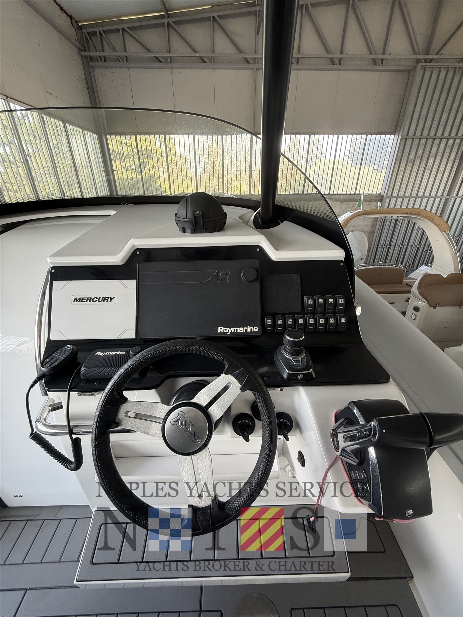 digitale Motorinstrumente auf dem VESSELVIEW-Display, elektronische Gashebel mit 1 STUFE, MANÖVRIERENDER JOYSTICK mit digitalem Anker und Autopiloten, RAYMARINE HYBRIDTOUCH GPS mit PROFNDIMETER verbunden, RAYMARINE RAY 53 VHF, PLASTICTIMO-Kompass, Navigationslichter, Hupe, FUSION-Stereoanlage mit Lautsprechern, QUICK-Kettenzähler, Staubsauger,