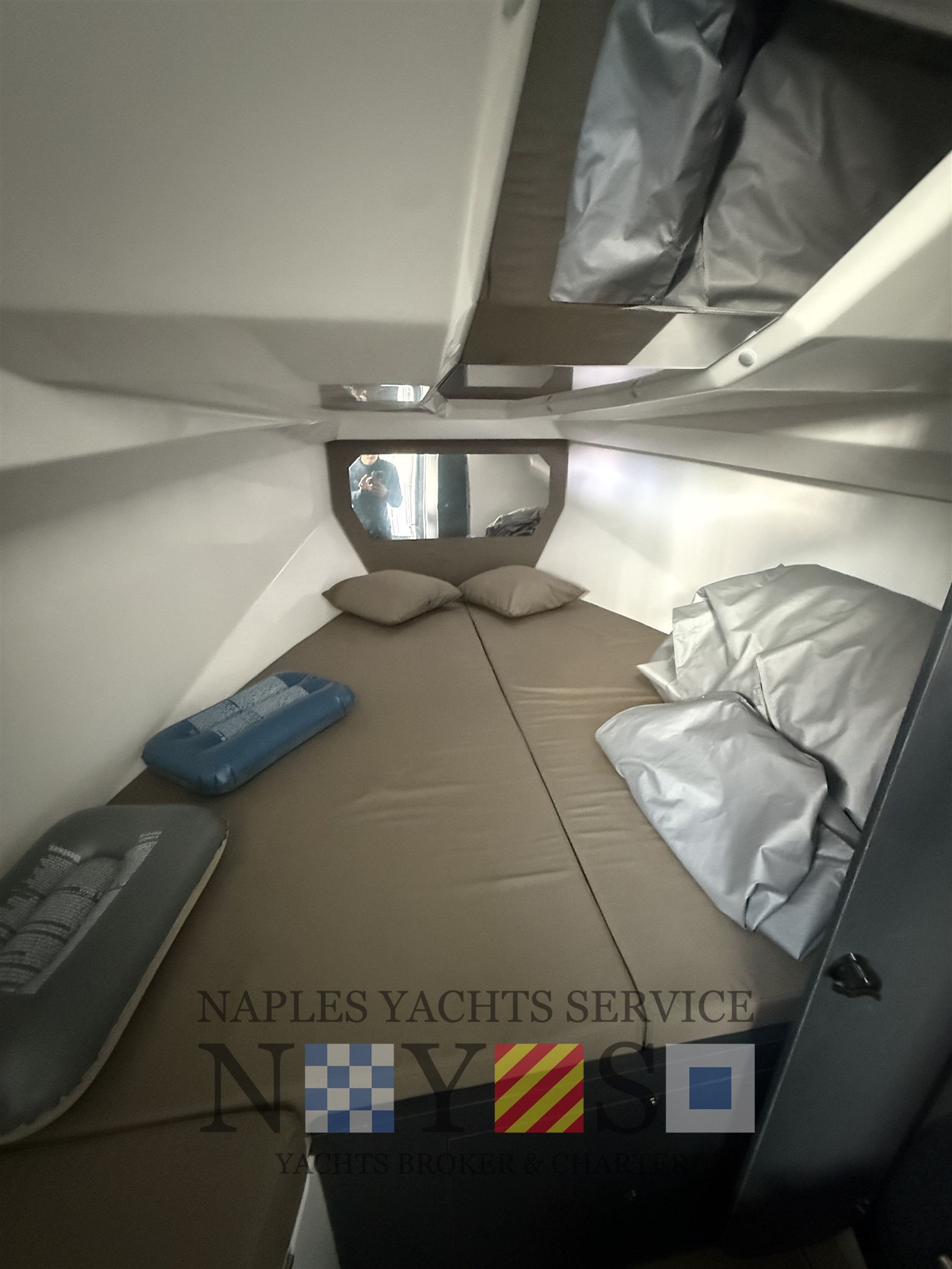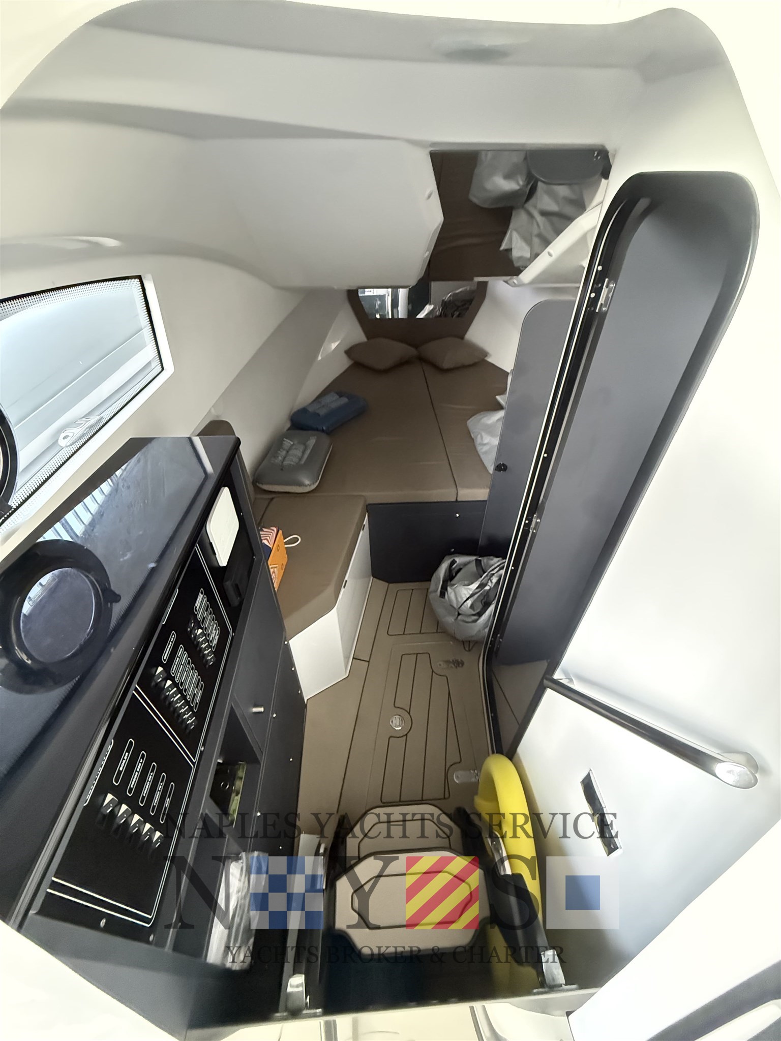 OFFENE RAUMKABINE mit V-förmigem Bett im Bug, Kleiderschränken, Schließfächern, ähnlich der hinteren Kabine zur Geräteaufbewahrung, separater Toilettenraum: großes achteres Sonnendeck mit Schließfach, das in eine achtere Kabine umgebaut werden kann, Cockpit mit U-förmigem Sofa mit kompletter Polsterung und Tisch, Wohnzimmer im Cockpit mit n* 2 VITIFRIGO Kühlschrankmodifikation: Schublade DW90KF0CXZTD mit Stahltür, Waschbecken und Stützfläche, N* 3 Sitze auf der Steuerstation, großes Bug-Sonnendeck