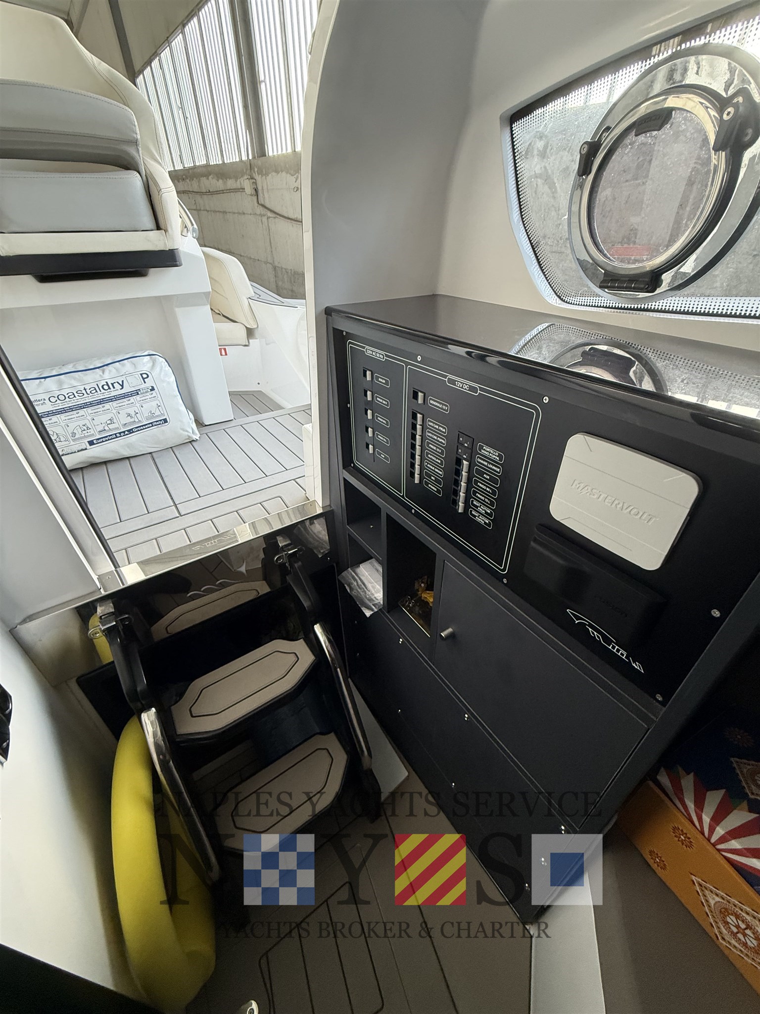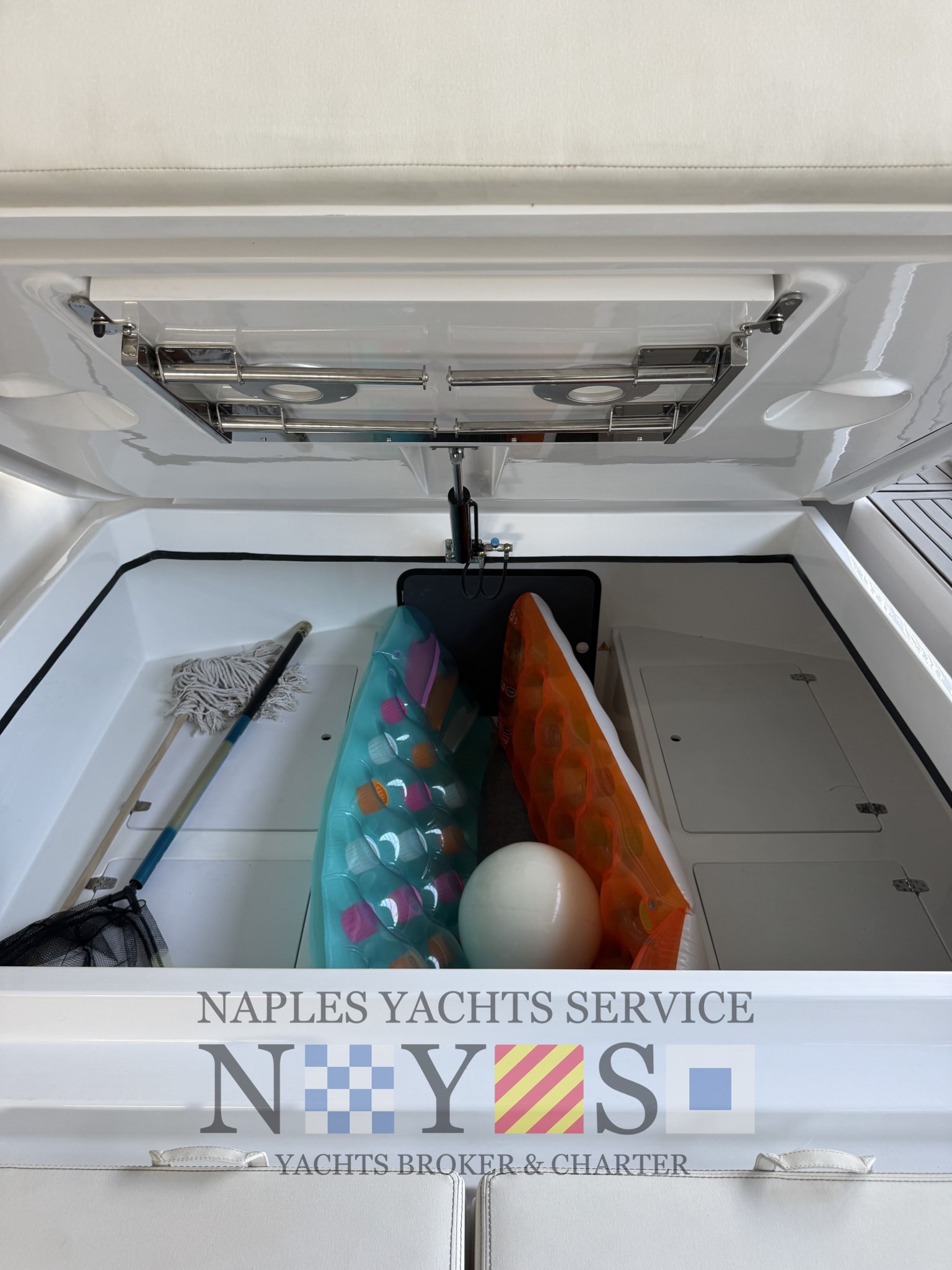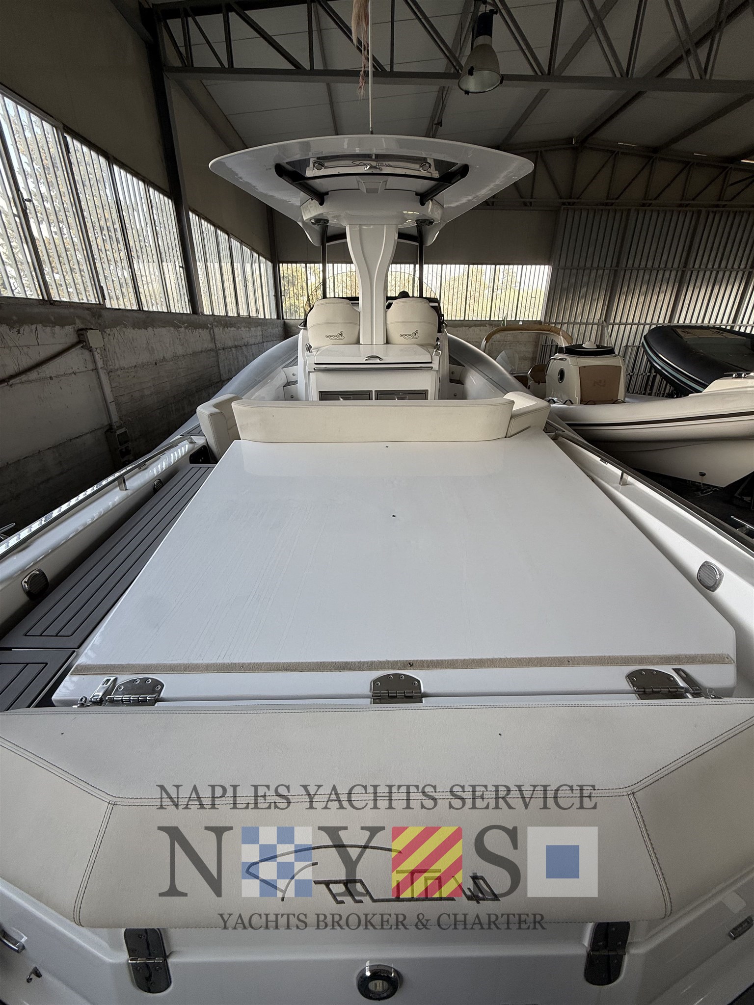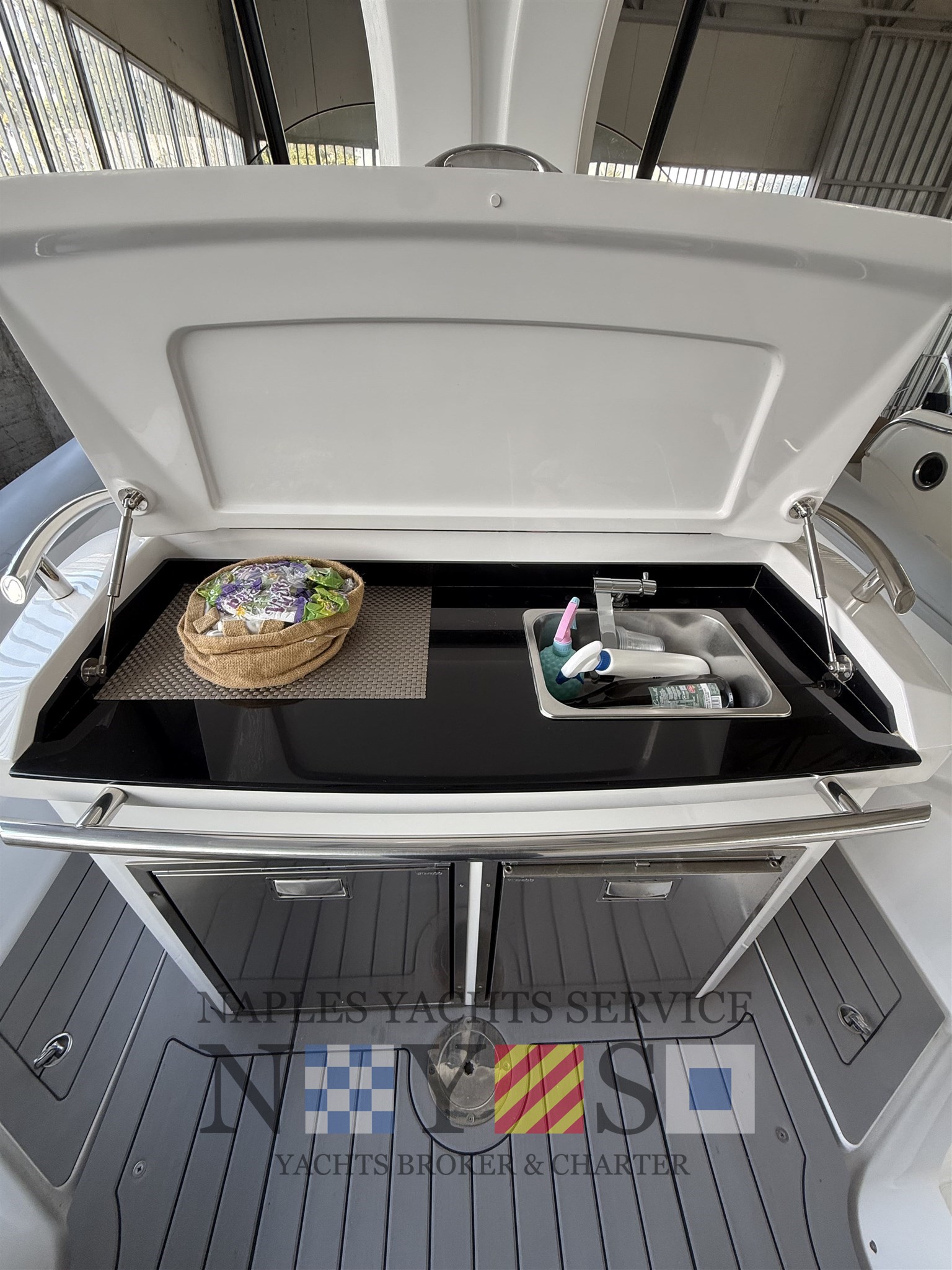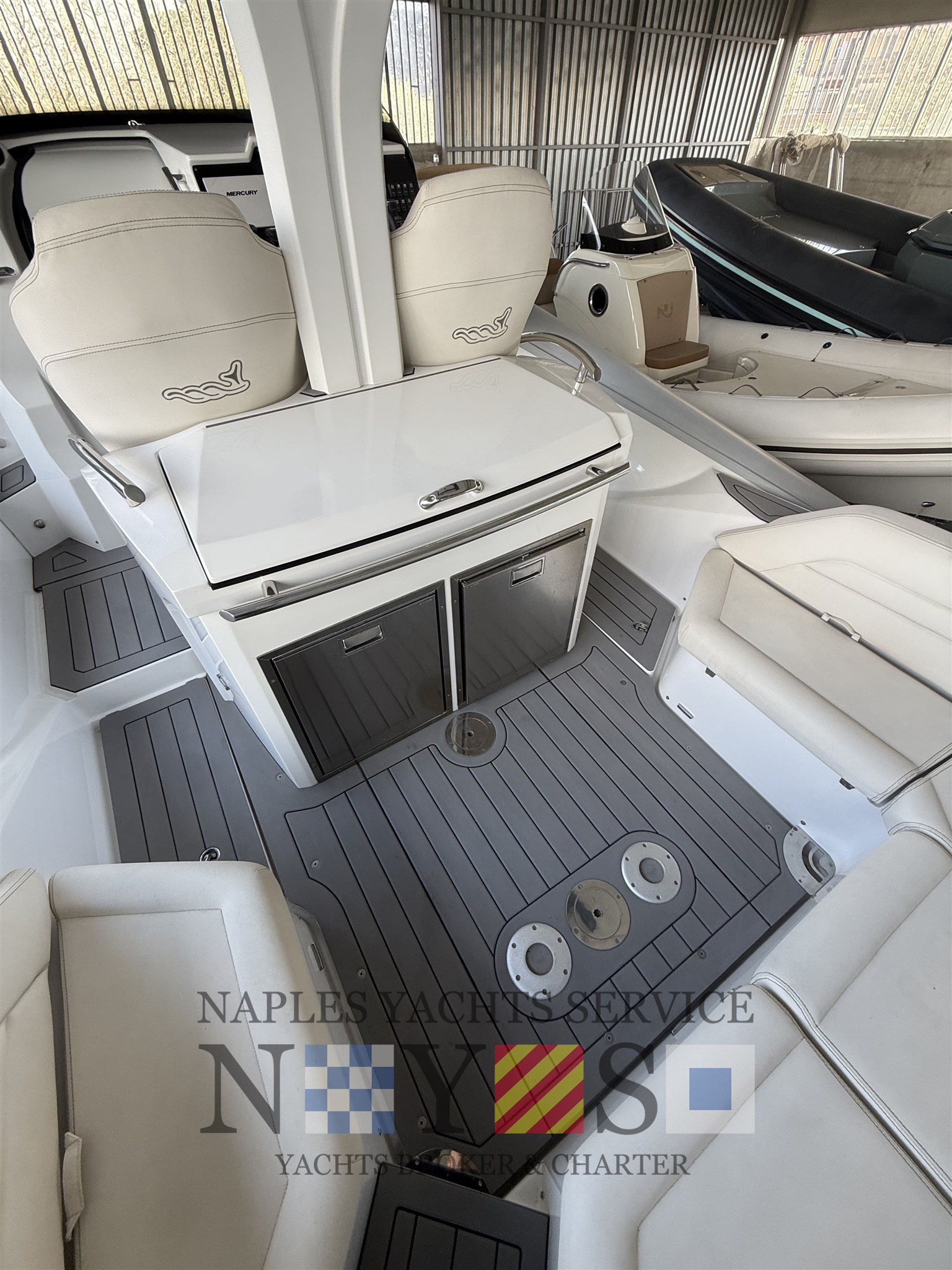 Bord- und Sicherheitsausrüstung, Sonnenmarkis mit Stützen, Heckplattform mit SYNTHETISCHEM TEAK, Konsolenabdeckung, elektrohydraulischer Hebestuhl für das hintere Spindelfach mit Cockpittischgehäuse, mobiler elektrischer Inflator, gegengeformte Spinde.