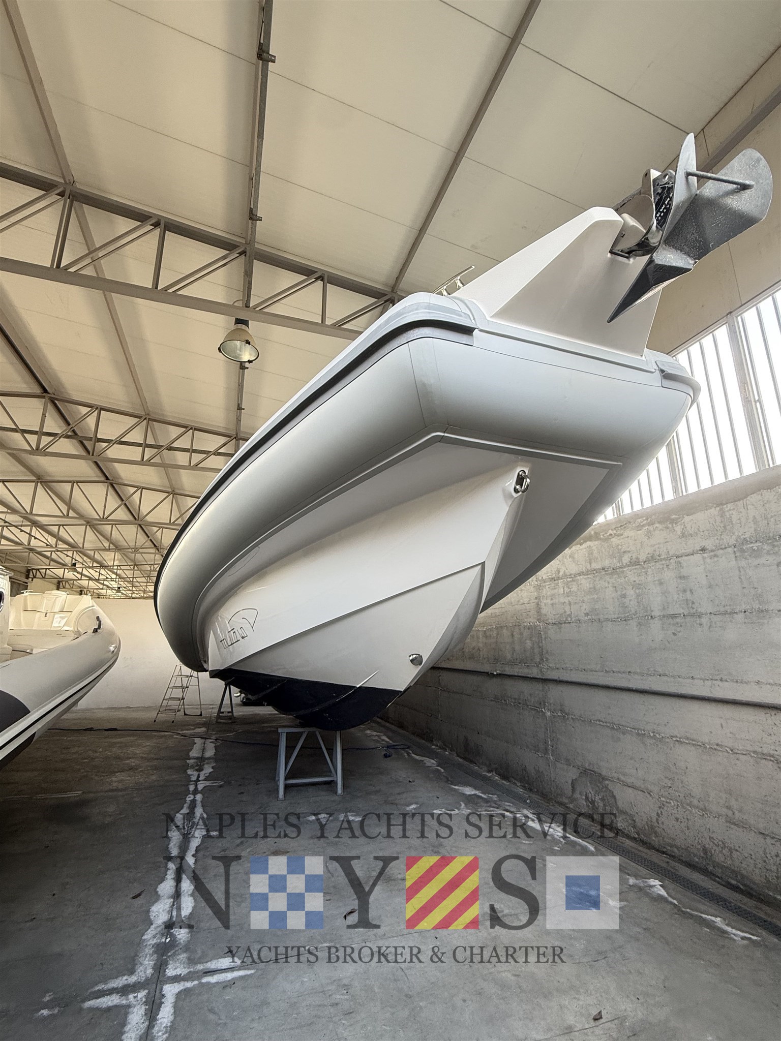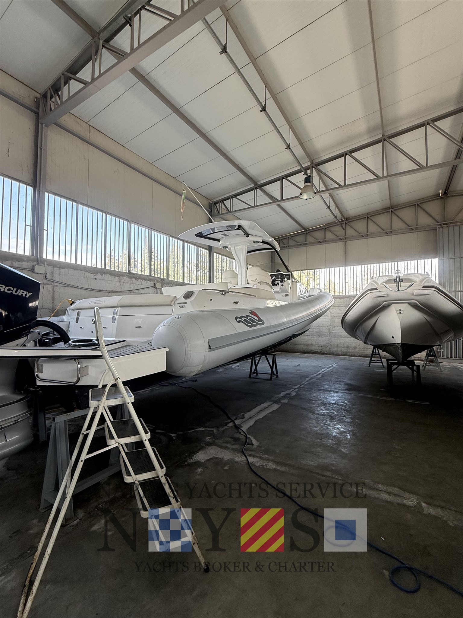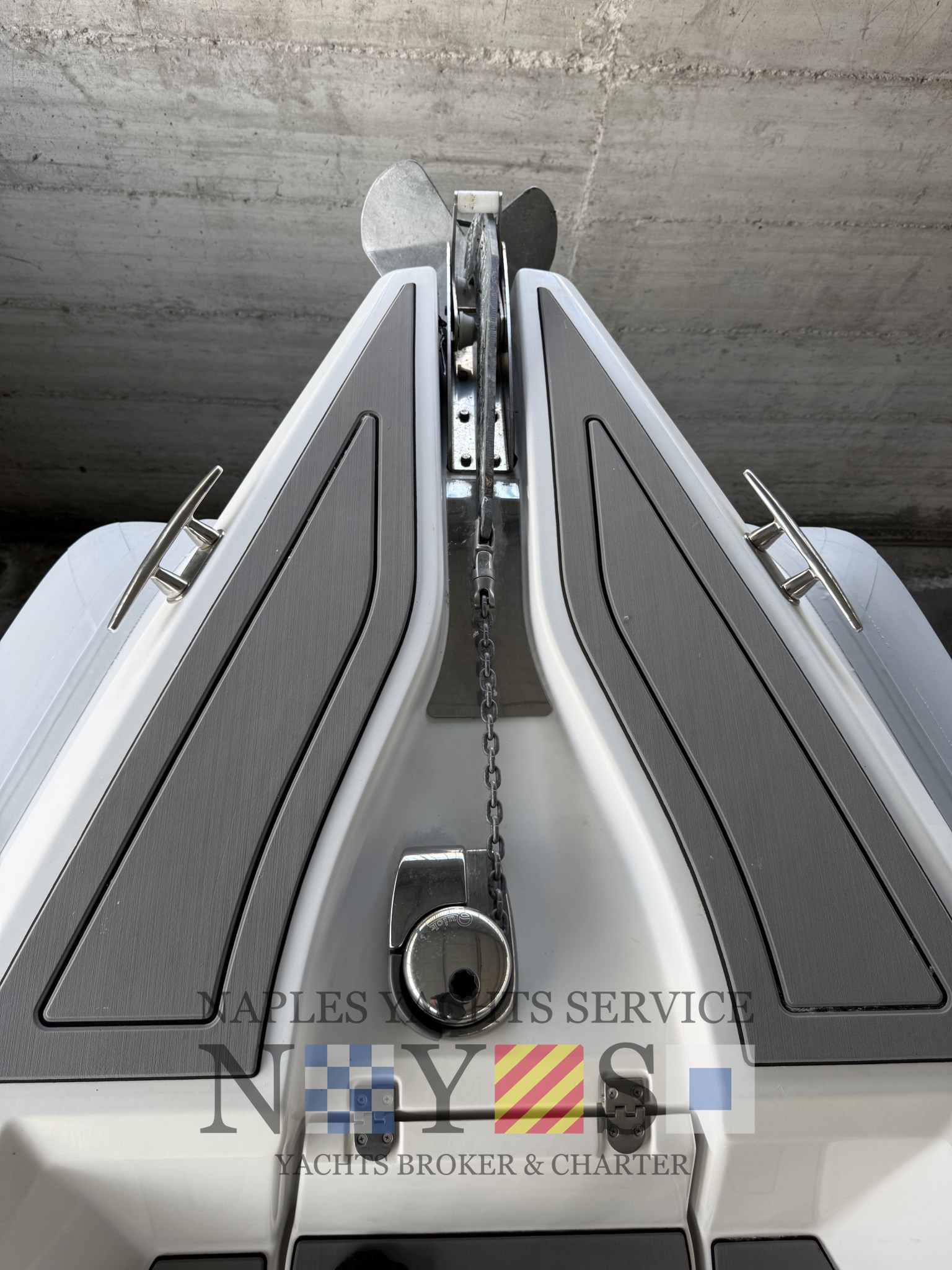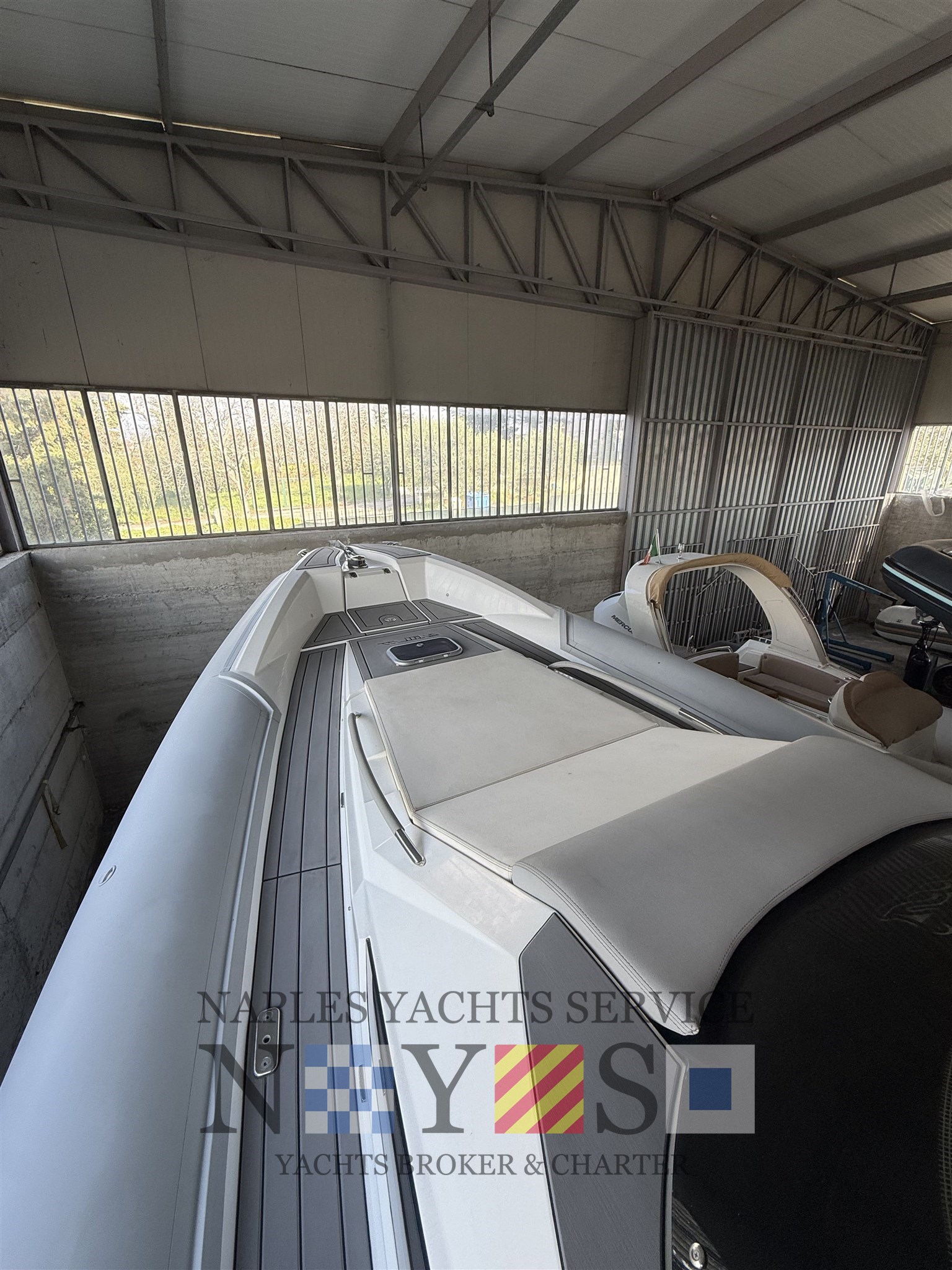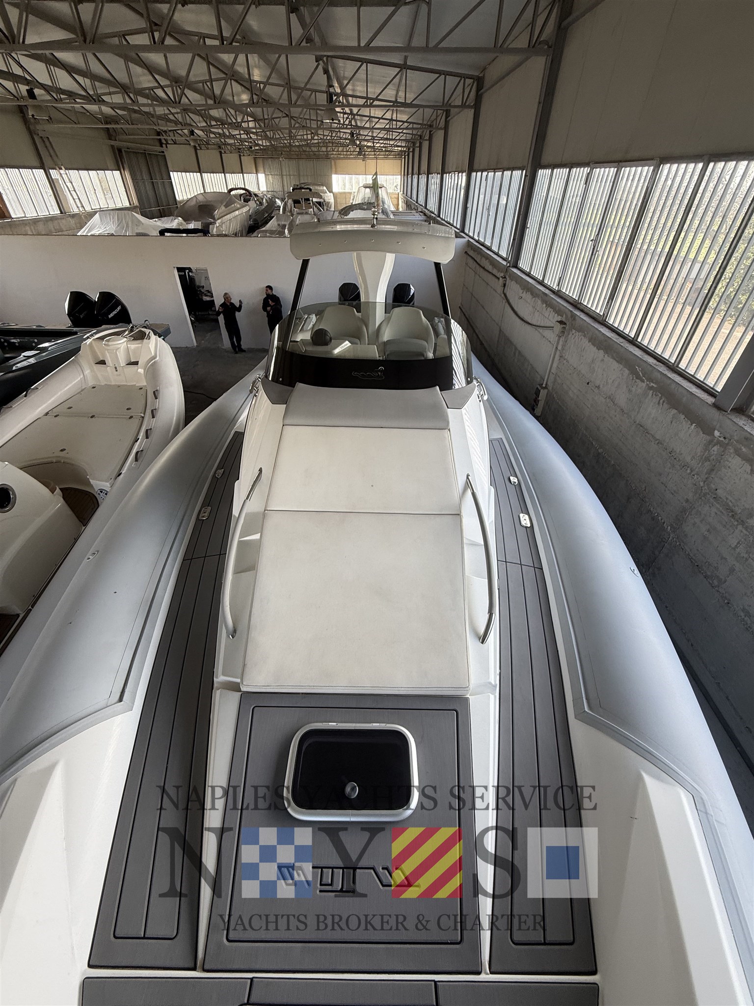 Bord- und Sicherheitsausrüstung, Sonnenmarkis mit Stützen, Heckplattform mit SYNTHETISCHEM TEAK, Konsolenabdeckung, elektrohydraulischer Hebestuhl für das hintere Spindelfach mit Cockpittischgehäuse, mobiler elektrischer Inflator, gegengeformte Spinde.