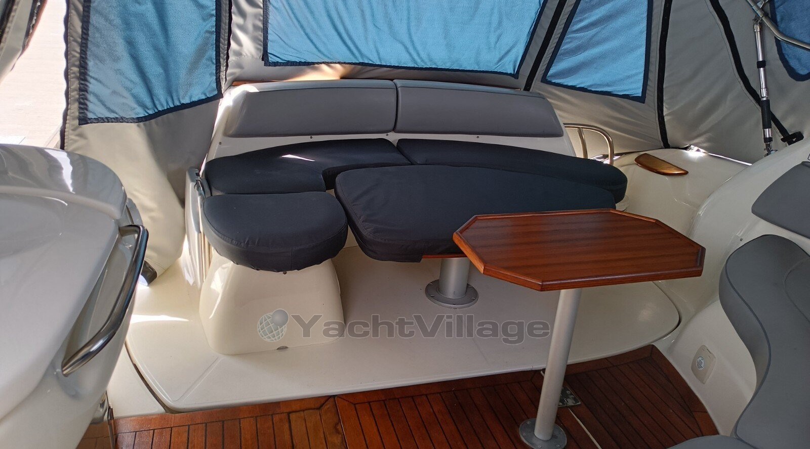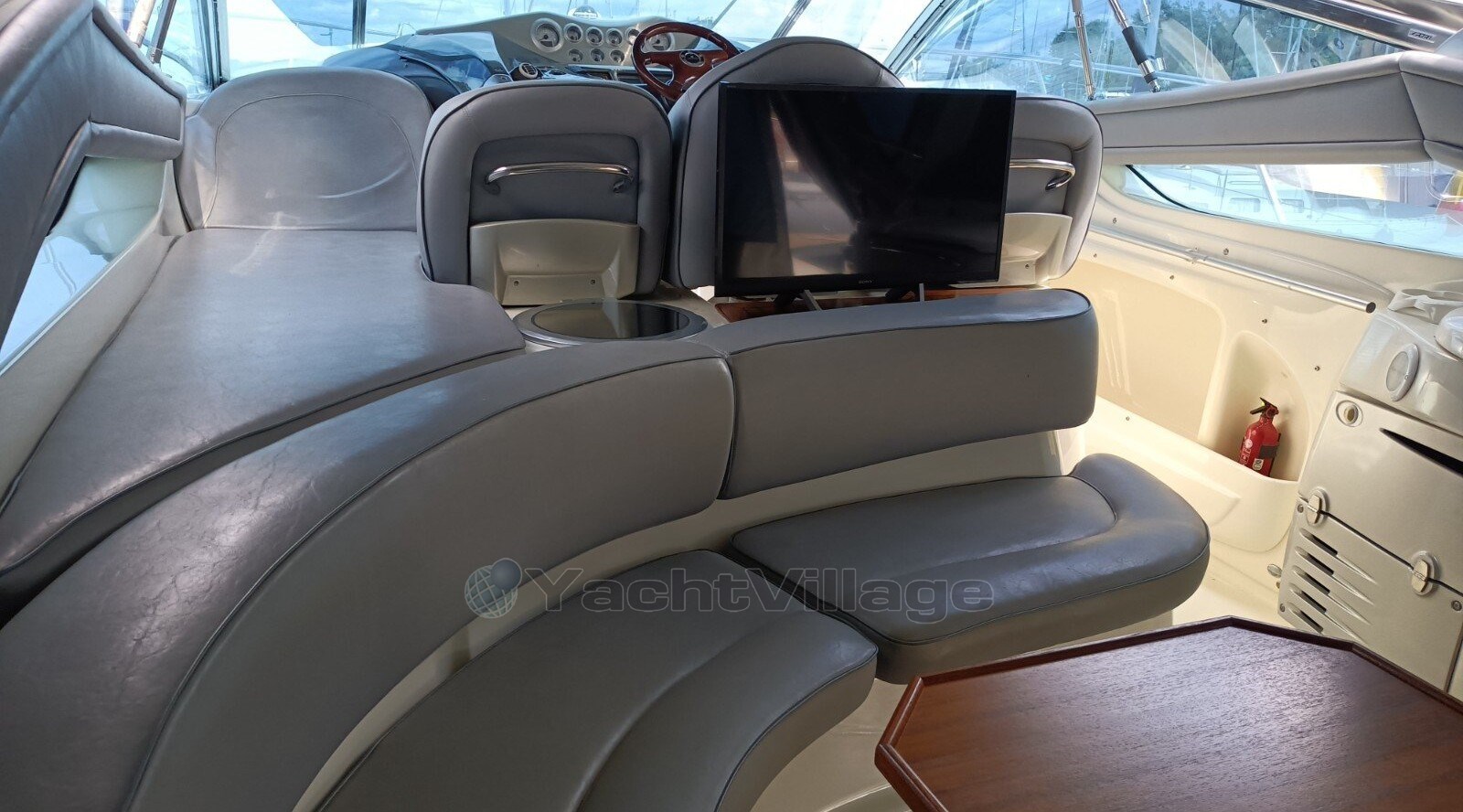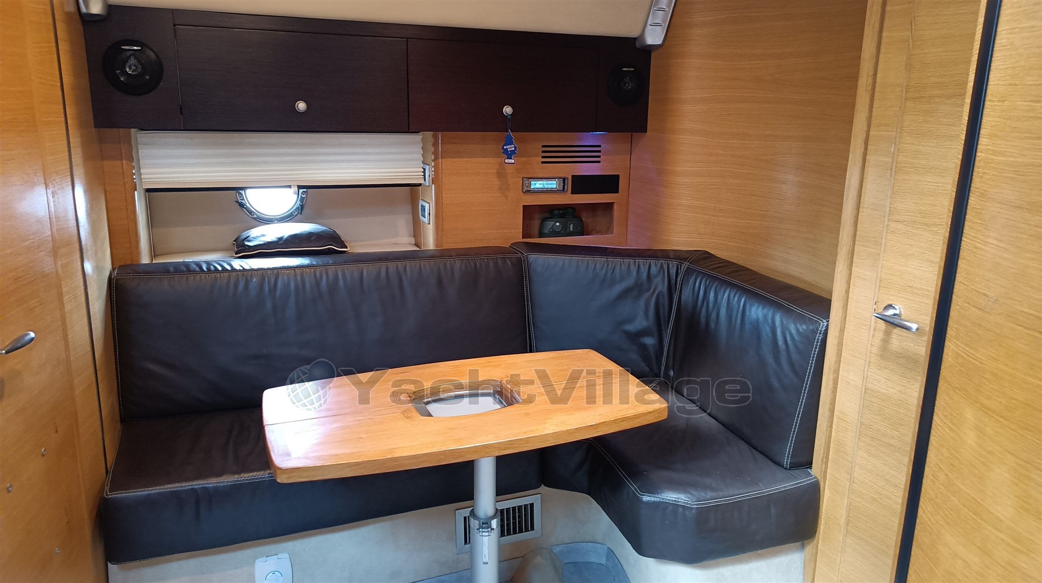 Bei offenen Yachten dieser Größe ist es fast selbstverständlich, dass sich die Hauptkabine im Bug befindet, während eine Kabine in der Mitte des Rumpfes, die oft nur über begrenzte Stehhöhe verfügt, unter dem Brückendeck versteckt ist.