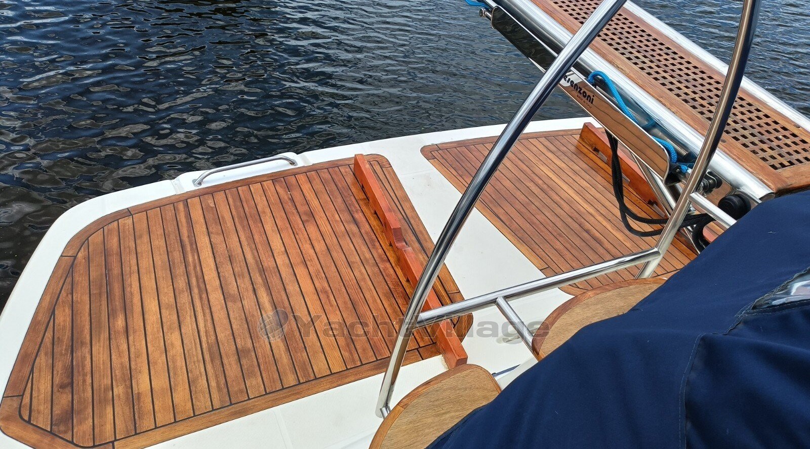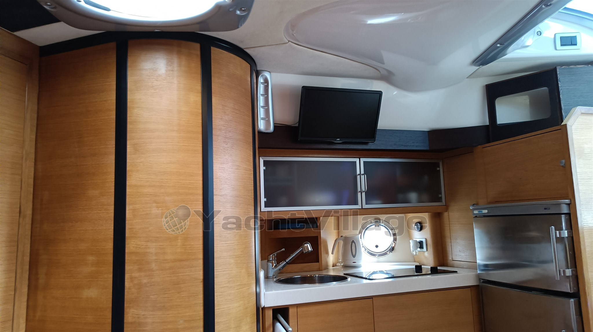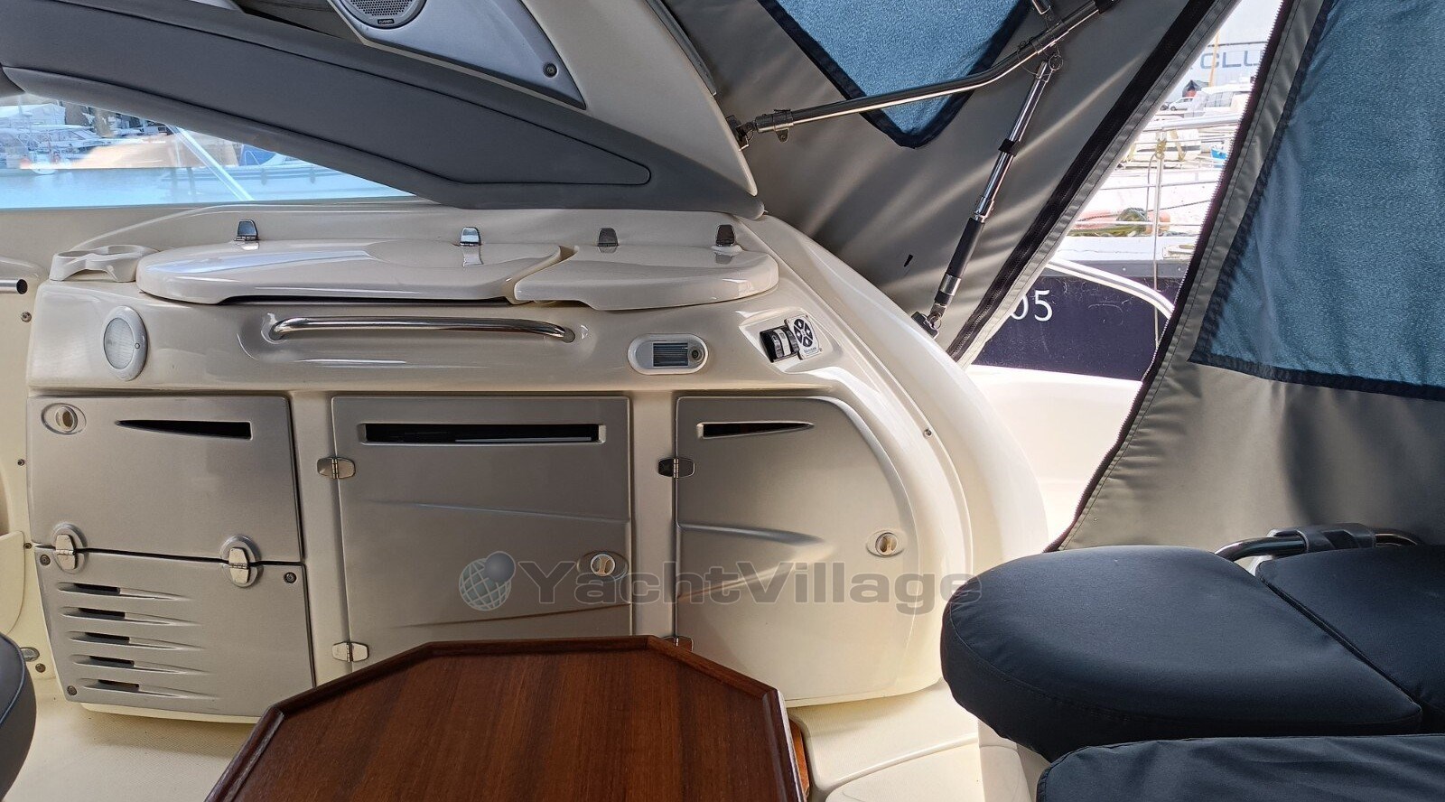 Bei offenen Yachten dieser Größe ist es fast selbstverständlich, dass sich die Hauptkabine im Bug befindet, während eine Kabine in der Mitte des Rumpfes, die oft nur über begrenzte Stehhöhe verfügt, unter dem Brückendeck versteckt ist.