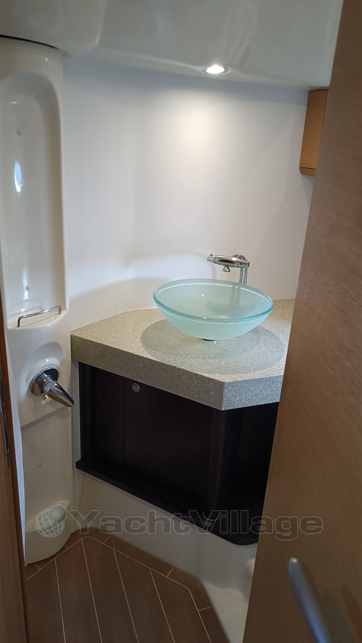 Zwischen den beiden Kabinen befindet sich ein gemütlicher Salon- und "Kombüsenbereich" am Fuße einer Teakholztreppe zum Deck. Die Stufen auf den Treppen sind bequem voneinander entfernt und werden jeweils von einer blauen LED beleuchtet, die auch bei gedämpftem Licht einen sicheren Zugang gewährleistet. Die Salonböden sind aus mattem Teakholz, eine passende Abkehr von dem traditionelleren Teakholz und der Stechpalme, angesichts des zeitgenössischen Stils des Bootsinnenraums. Die Kombüse bringt alles Wichtige in Reichweite; Die Corian-Arbeitsplatte verfügt über ein Zwei-Flammen-Kochfeld und eine Edelstahlspüle mit einem Durchmesser von 14 Zoll und einer Tiefe von sechs Zoll, die groß genug ist, um nützlich zu sein. Daneben befindet sich