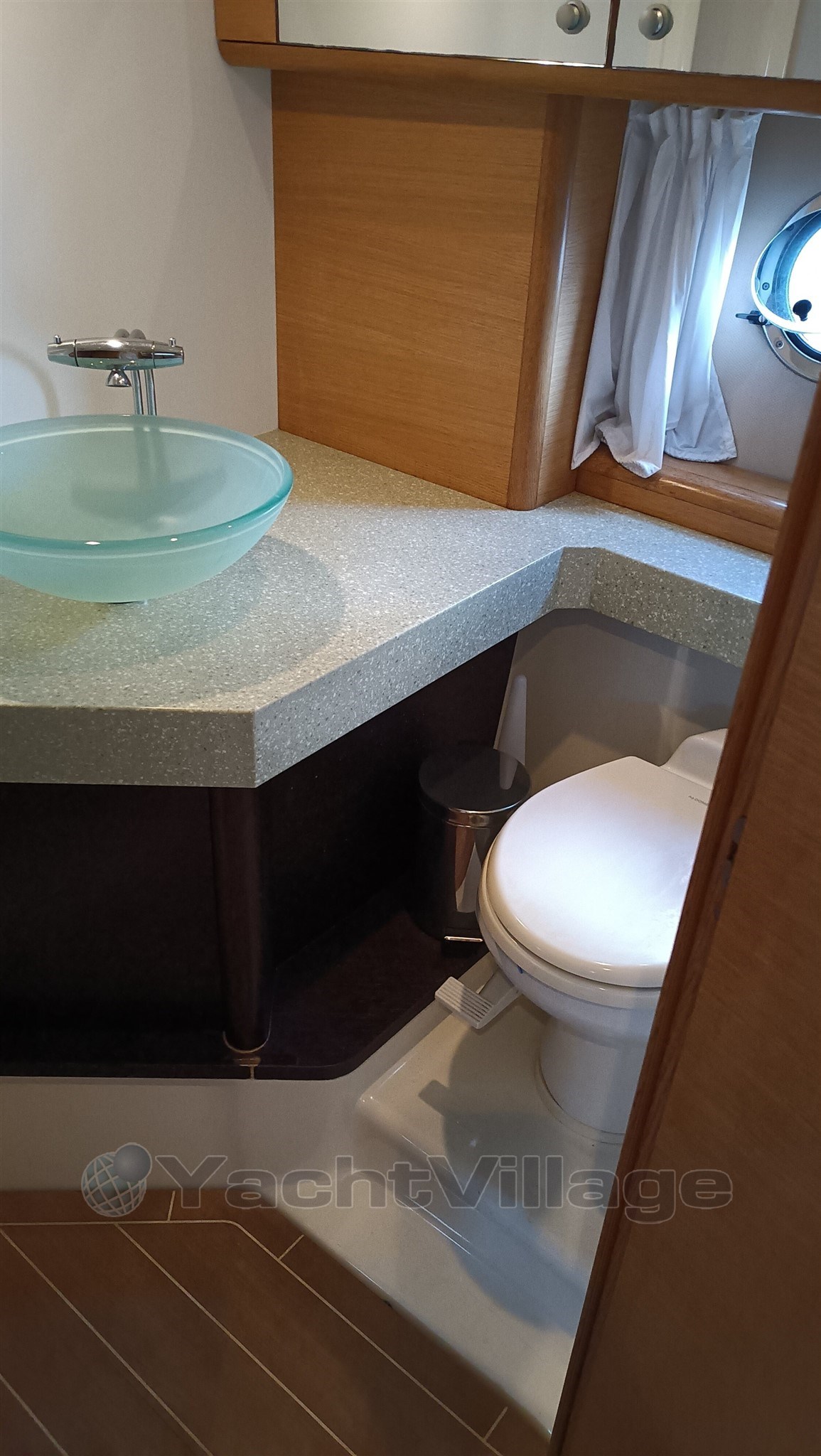 Aber die Kabine in der Mitte der Kabine ist ein echter Hingucker. Dank der Platzierung der Motoren bietet es eine Queen-Size-Koje quer übers Schiff in einem Raum mit voller Breite, der 6'10" in Längs- und Längsrichtung misst und mehr als 13 Fuß breit ist. Gegenüber dem Liegeplatz, entlang der Backbordseite, gibt es einen Hängeschrank, ein Sofa, einen Waschtisch und einen versenkten Flachbildfernseher. Aufgrund des erhöhten Steuerdecks direkt darüber gibt es mehr als sieben Fuß Kopffreiheit am Fuße der Koje und 6'1" Stehhöhe an der Tür. Es gibt auch einen privaten Eingang zu einem WC Raum mit Waschbecken und Dusche; Eine zweite Tür vom Salon aus ermöglicht es den Gästen, die Nasszelle zu betreten, ohne in die Kabine einzudringen. Überraschenderweise ist diese Nasszelle in der Mitte der Kabine größer als der neben der Bugkabine, was die Frage aufwirft, welche Kabine die des Kapitän ist. Man bemerkt jedoch, dass die Dusche nur einen Vorhang hat, da der WC Raum in der Mitte der Kabine zwei Türen hat, nicht wie der WC Raum im Bug.