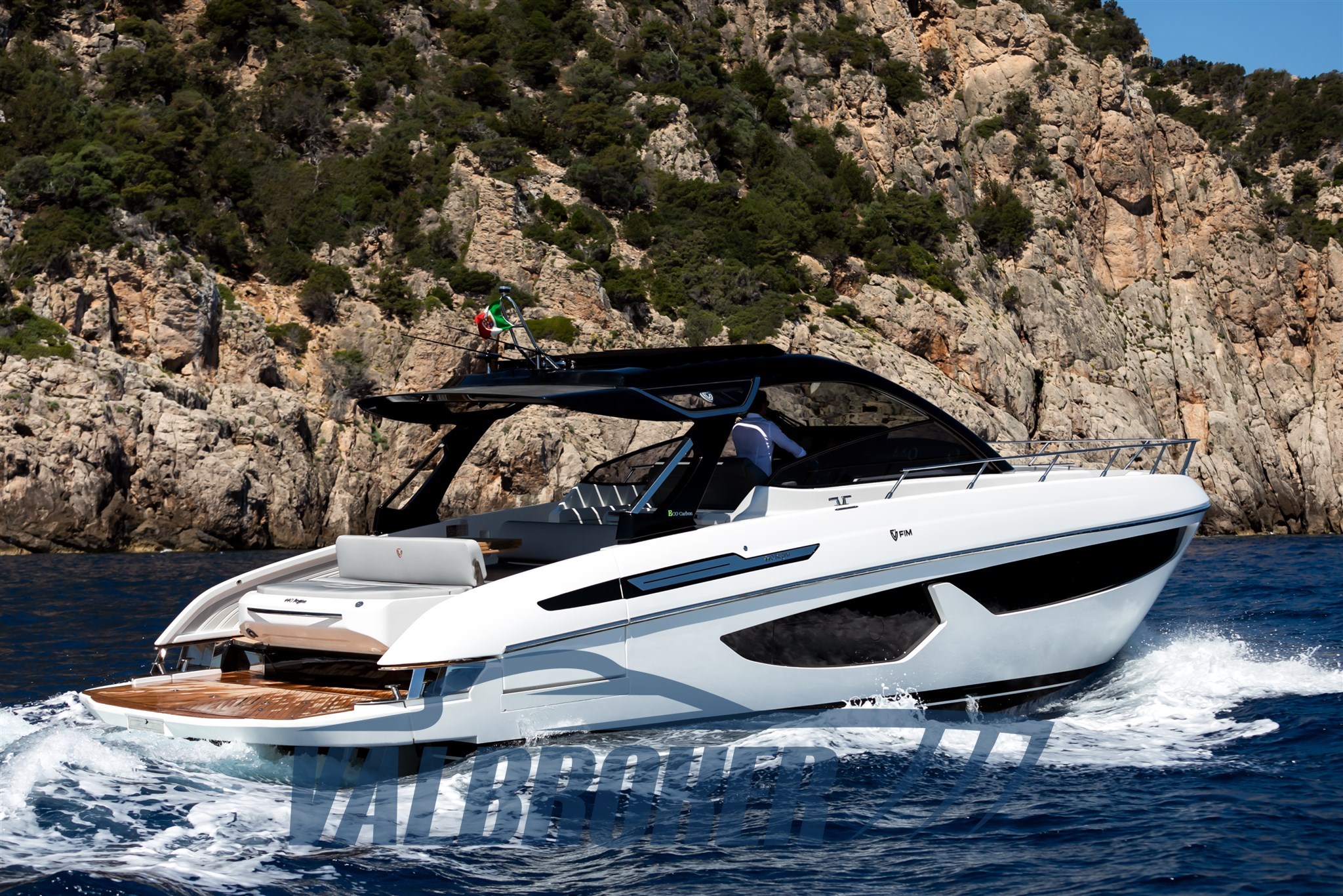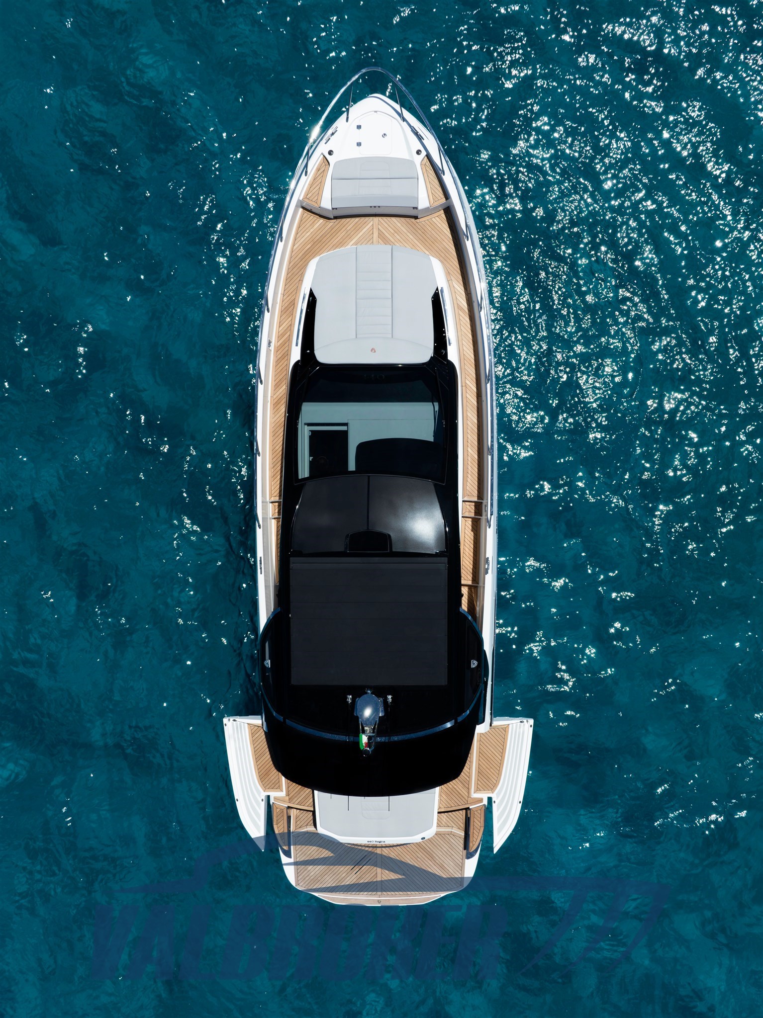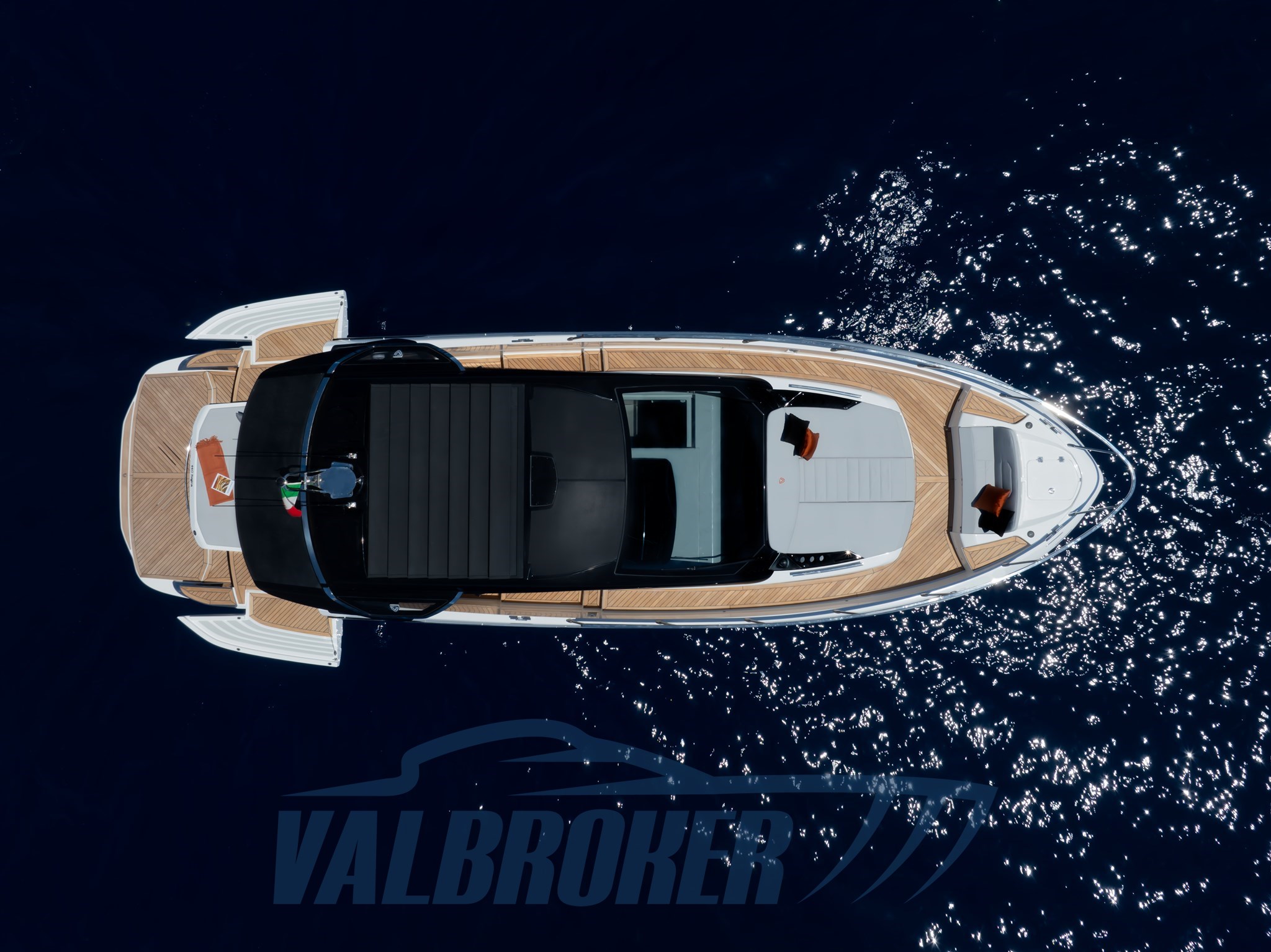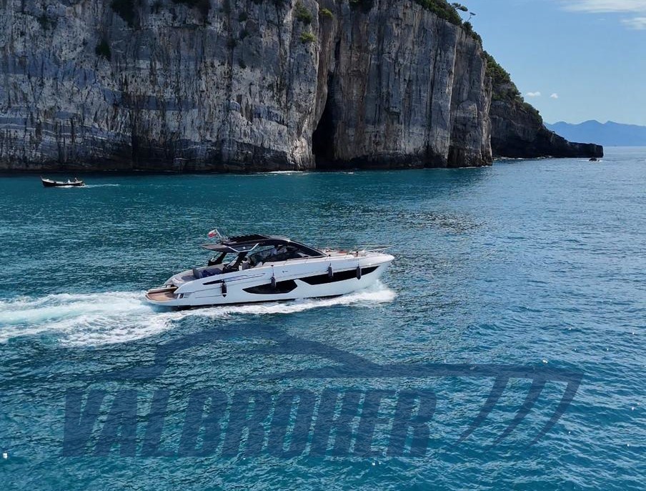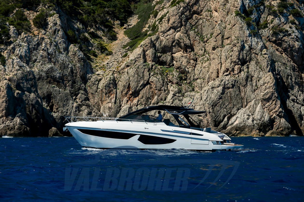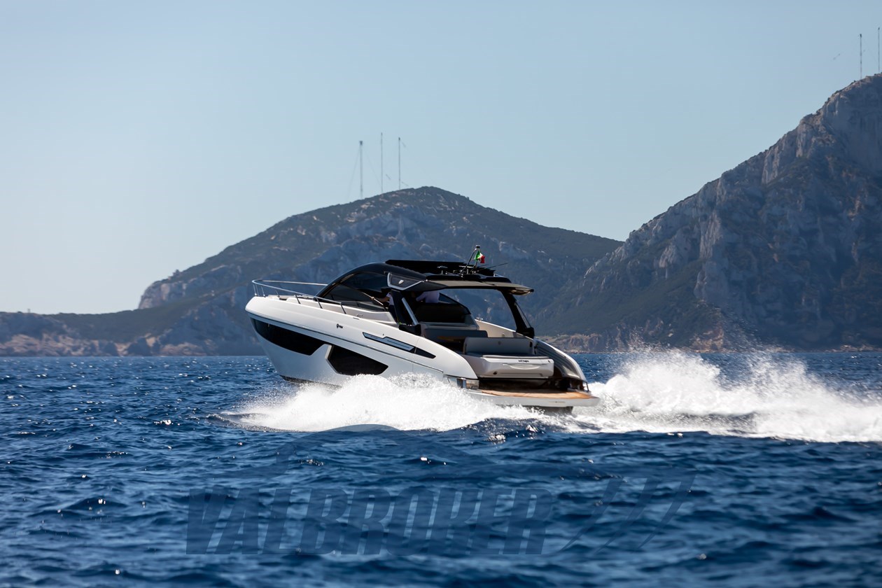 Faszinierende Linien kombiniert mit einer großen Windschutzscheibe und exzellenter Luftzirkulation im Cockpit dank des Hard Top mit Lamellenöffnung. Es verfügt über eine große, vollstrahlige hintere Hauptkabine, eine elegante Essgruppe im Bug, die die Besitzer durch Hinzufügen einer Falttür und zwei Badezimmer in eine Kabine umgewandelt haben. Außen fügt sich die Eleganz des Designs perfekt in den sportlichen Geist dieses neuen 100% Made in Italy-Modells ein.