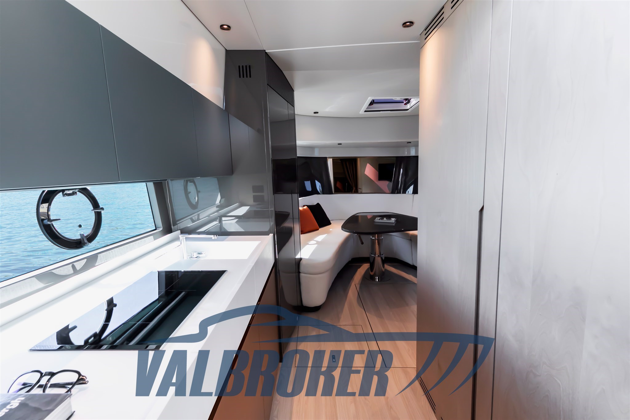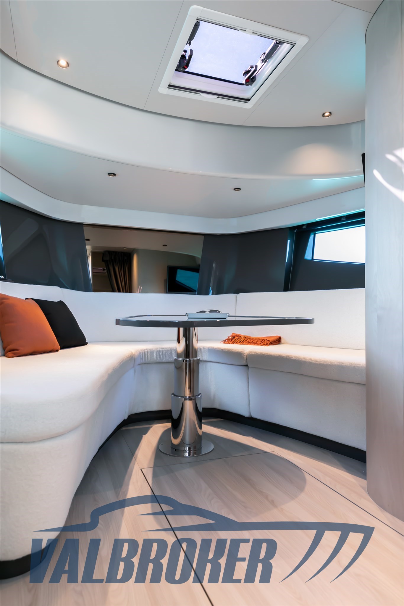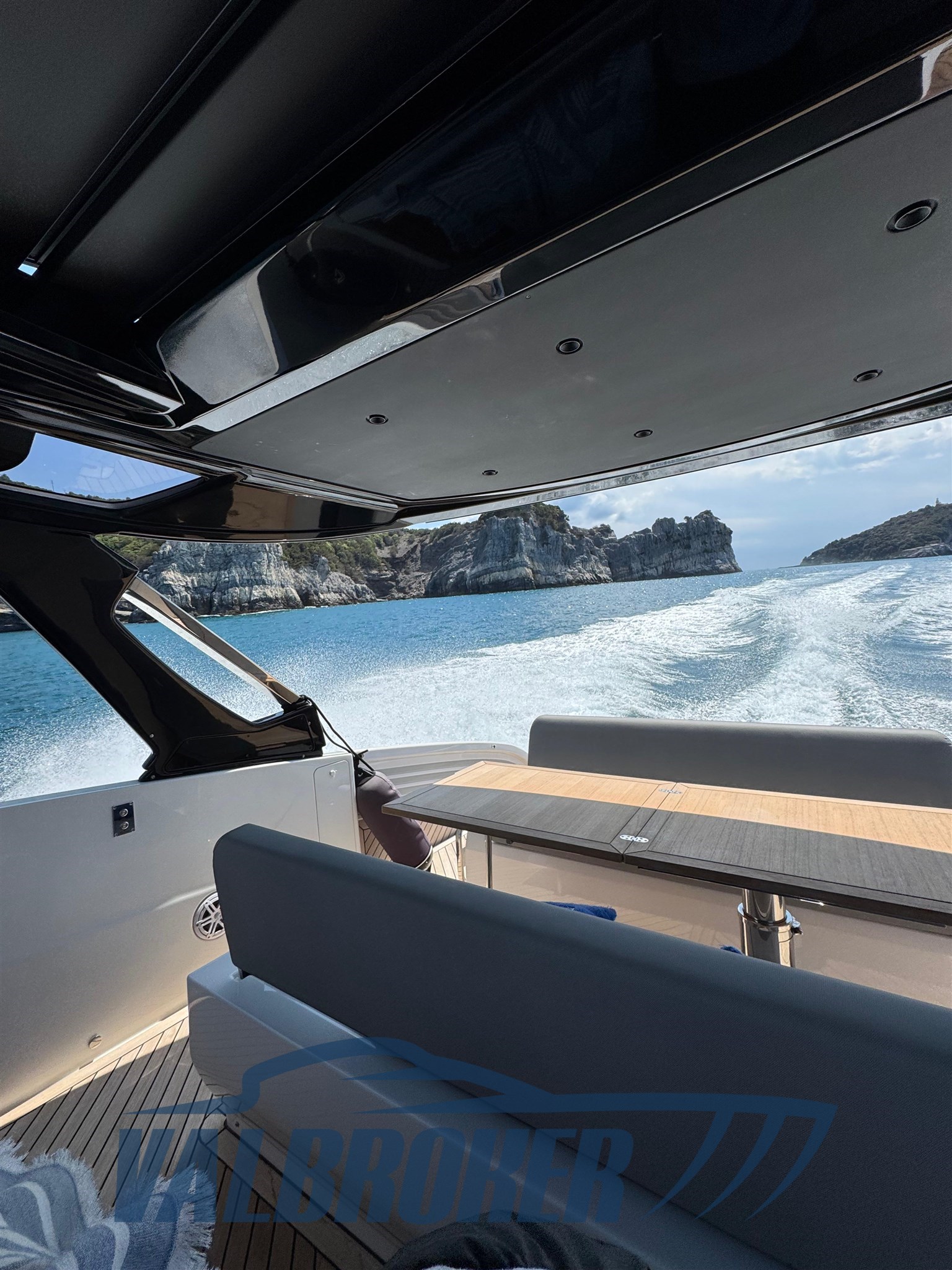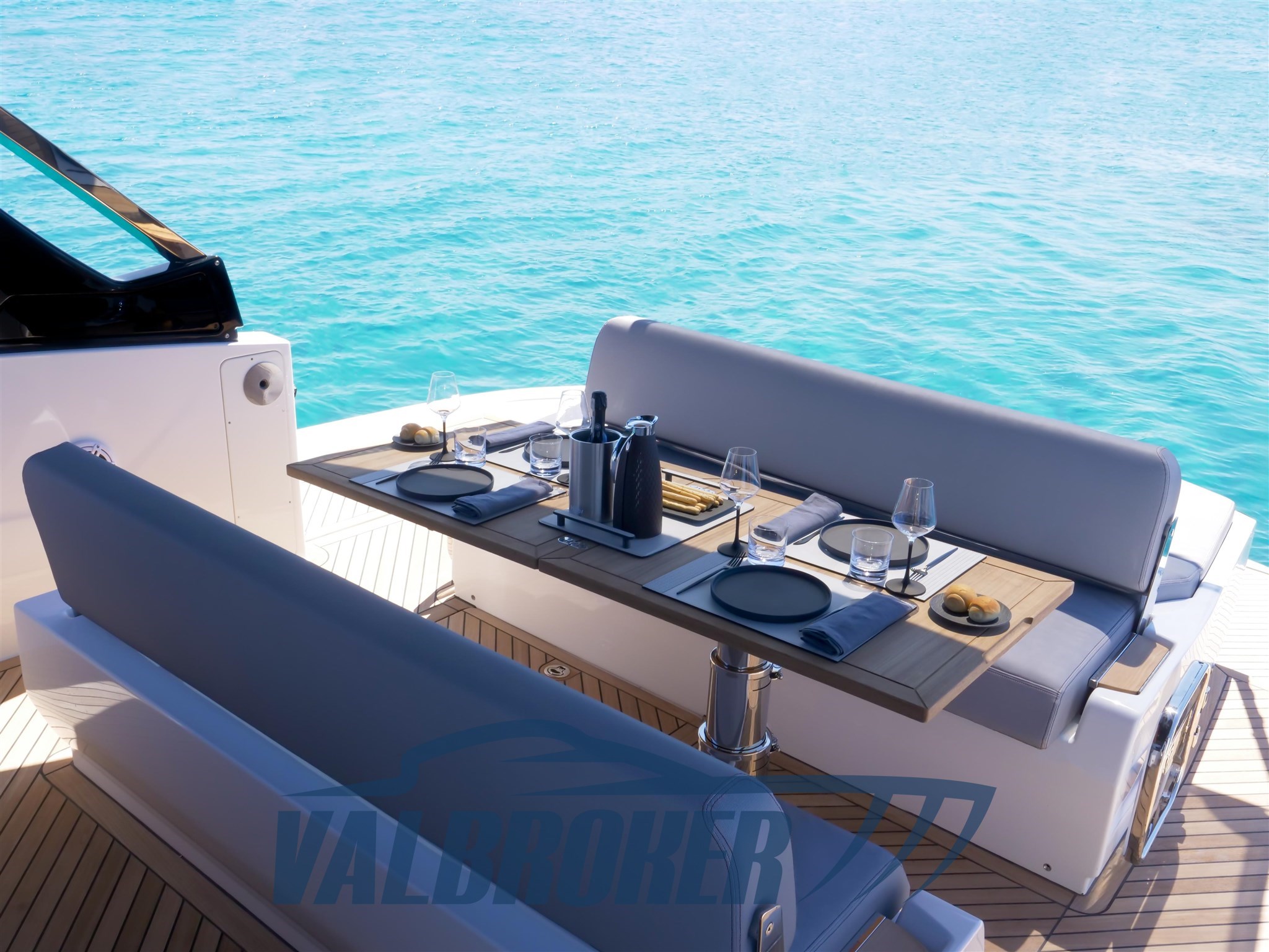 Faszinierende Linien kombiniert mit einer großen Windschutzscheibe und exzellenter Luftzirkulation im Cockpit dank des Hard Top mit Lamellenöffnung. Es verfügt über eine große, vollstrahlige hintere Hauptkabine, eine elegante Essgruppe im Bug, die die Besitzer durch Hinzufügen einer Falttür und zwei Badezimmer in eine Kabine umgewandelt haben. Außen fügt sich die Eleganz des Designs perfekt in den sportlichen Geist dieses neuen 100% Made in Italy-Modells ein.