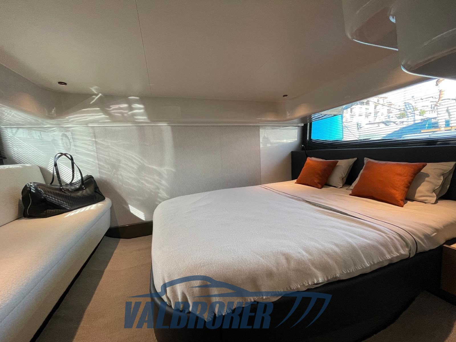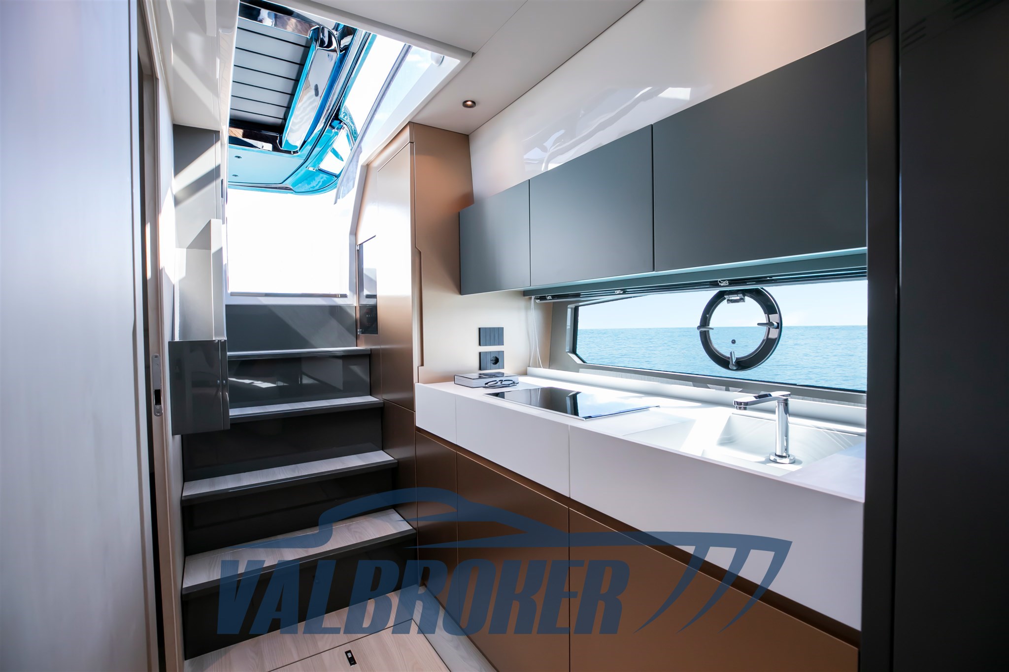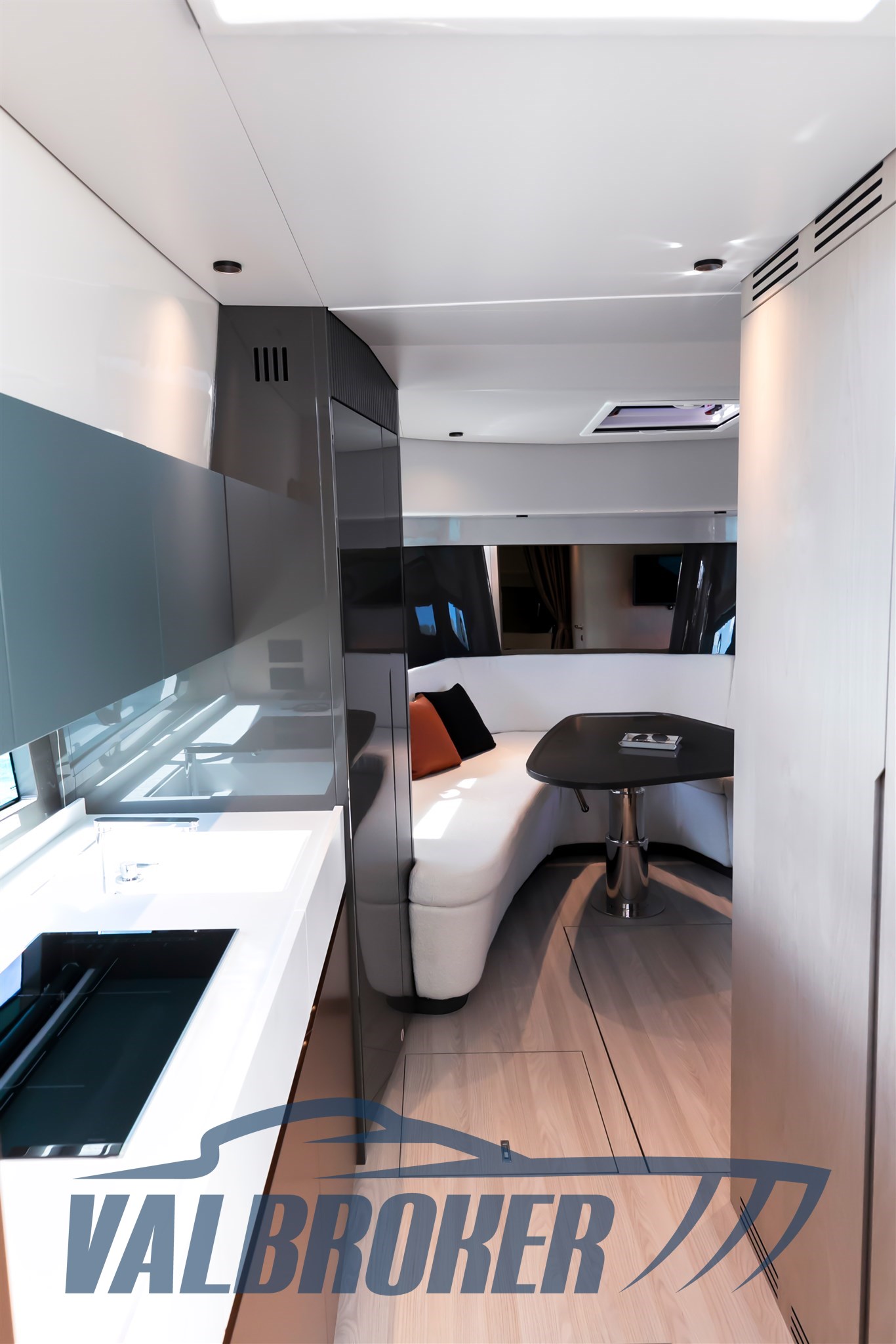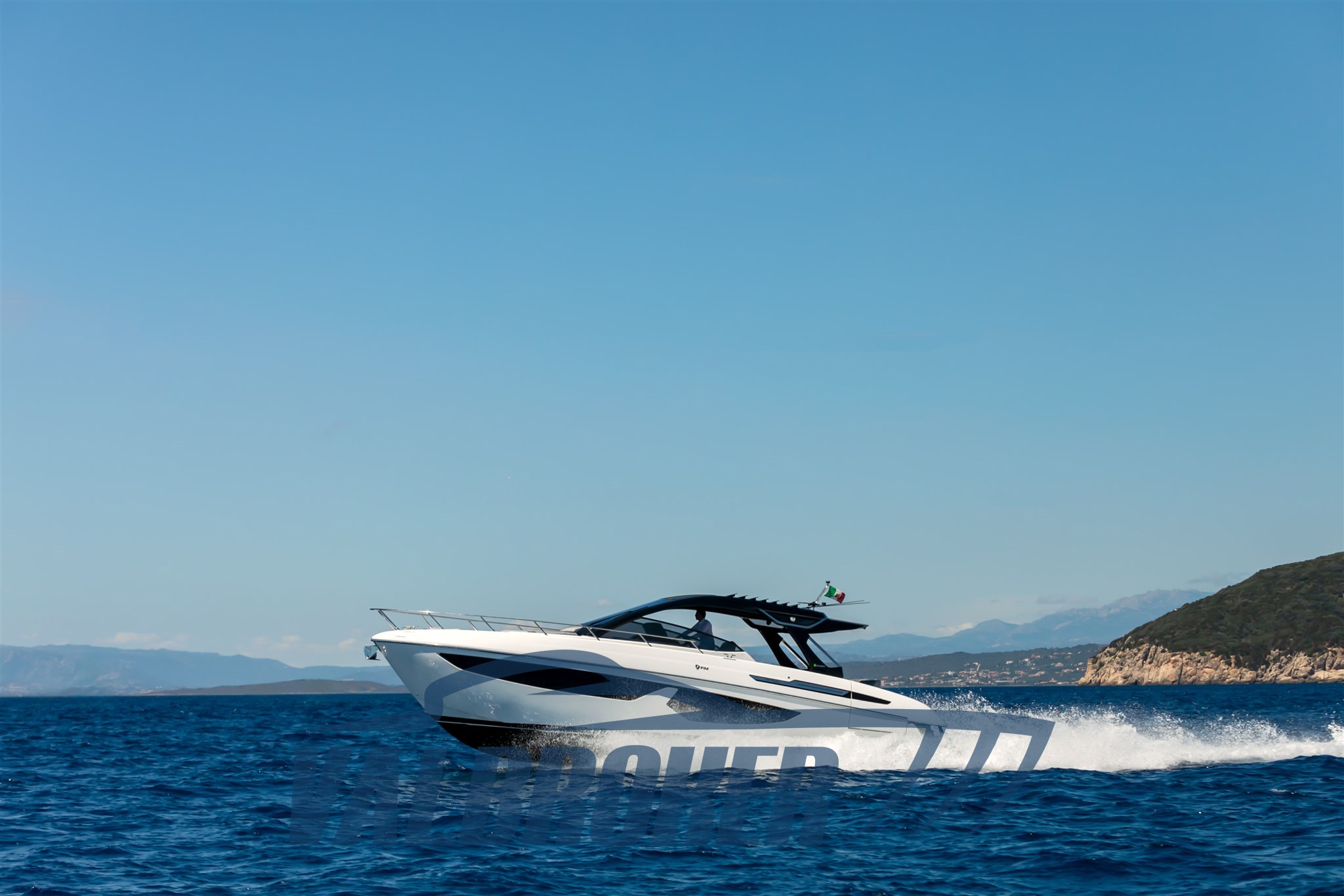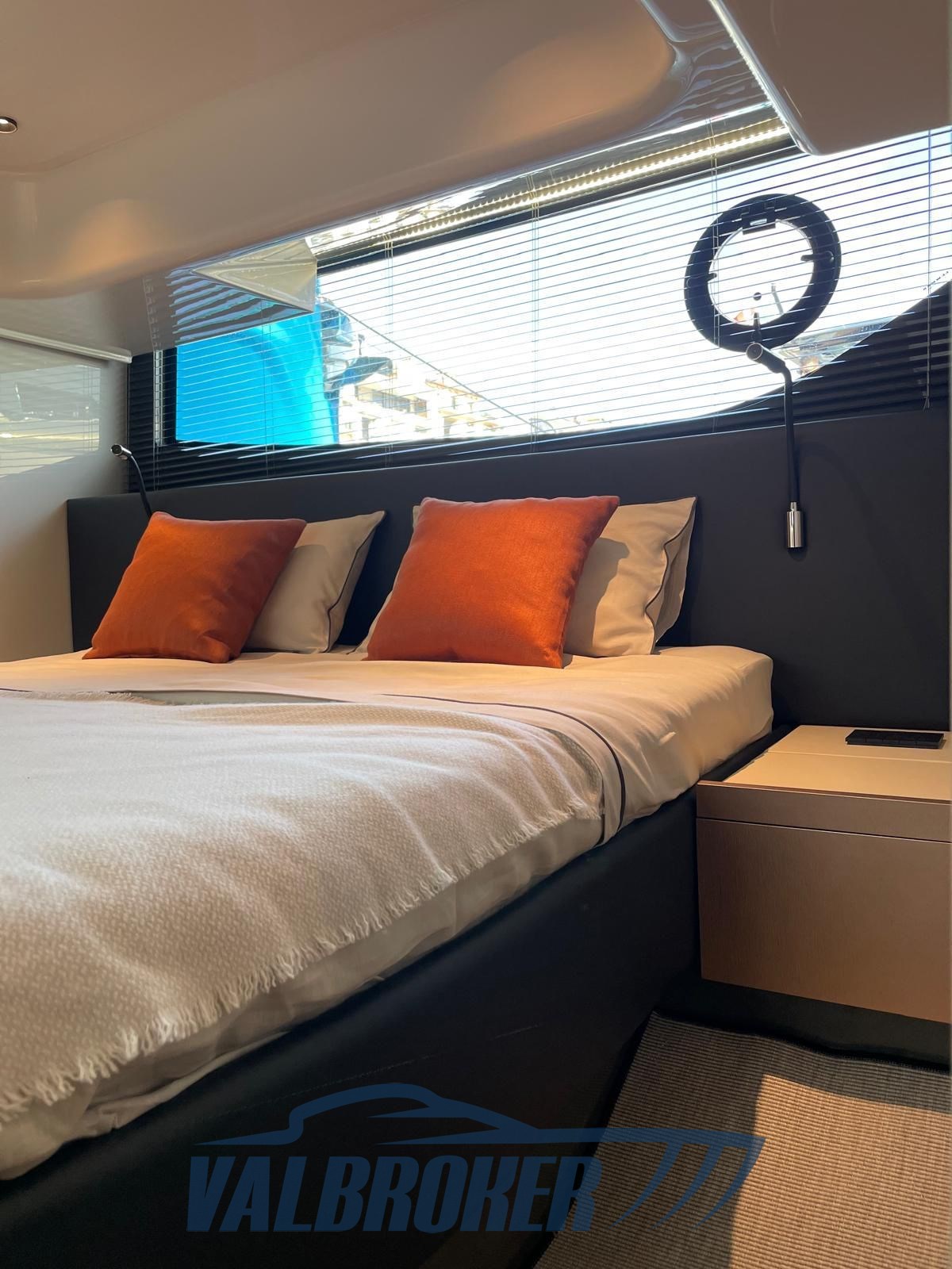 Faszinierende Linien kombiniert mit einer großen Windschutzscheibe und exzellenter Luftzirkulation im Cockpit dank des Hard Top mit Lamellenöffnung. Es verfügt über eine große, vollstrahlige hintere Hauptkabine, eine elegante Essgruppe im Bug, die die Besitzer durch Hinzufügen einer Falttür und zwei Badezimmer in eine Kabine umgewandelt haben. Außen fügt sich die Eleganz des Designs perfekt in den sportlichen Geist dieses neuen 100% Made in Italy-Modells ein.