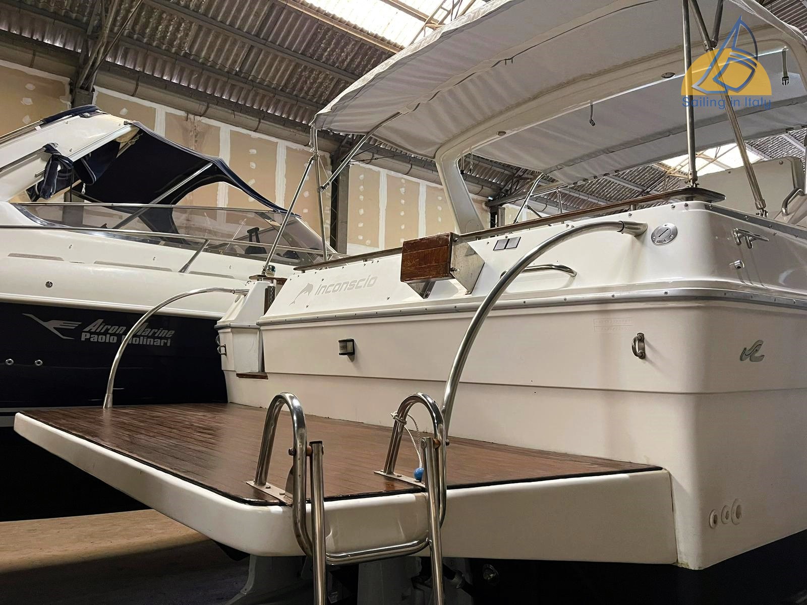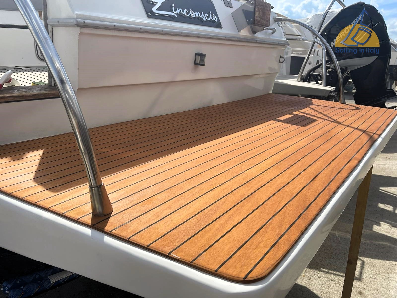 Teakholz-Cockpit; Heckplattform mit Teakholz; Schwimmleiter; Elektrische Winde; Anker + Kette ; Hydraulische Klappen (2); Außendusche; Überrollbügel ; Vordach und Vordach; Feste hintere Scheinwerfer; Tender enthalten