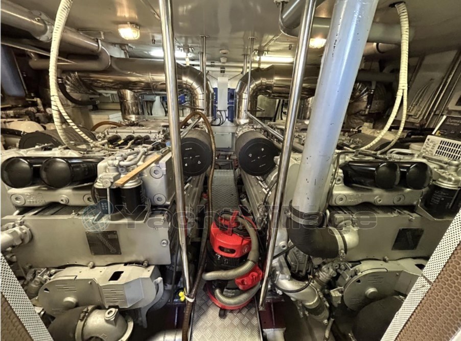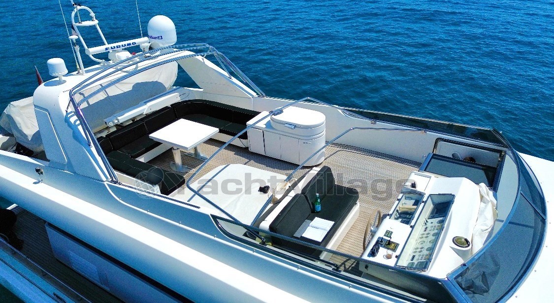 Weitere Ausstattungen sind Bug- und Hecktriebwerke, hydraulische Klappen sowie fortschrittliche Navigationselektronik mit dualem Raymarine-GPS, Radar, AIS und Autopilot.
