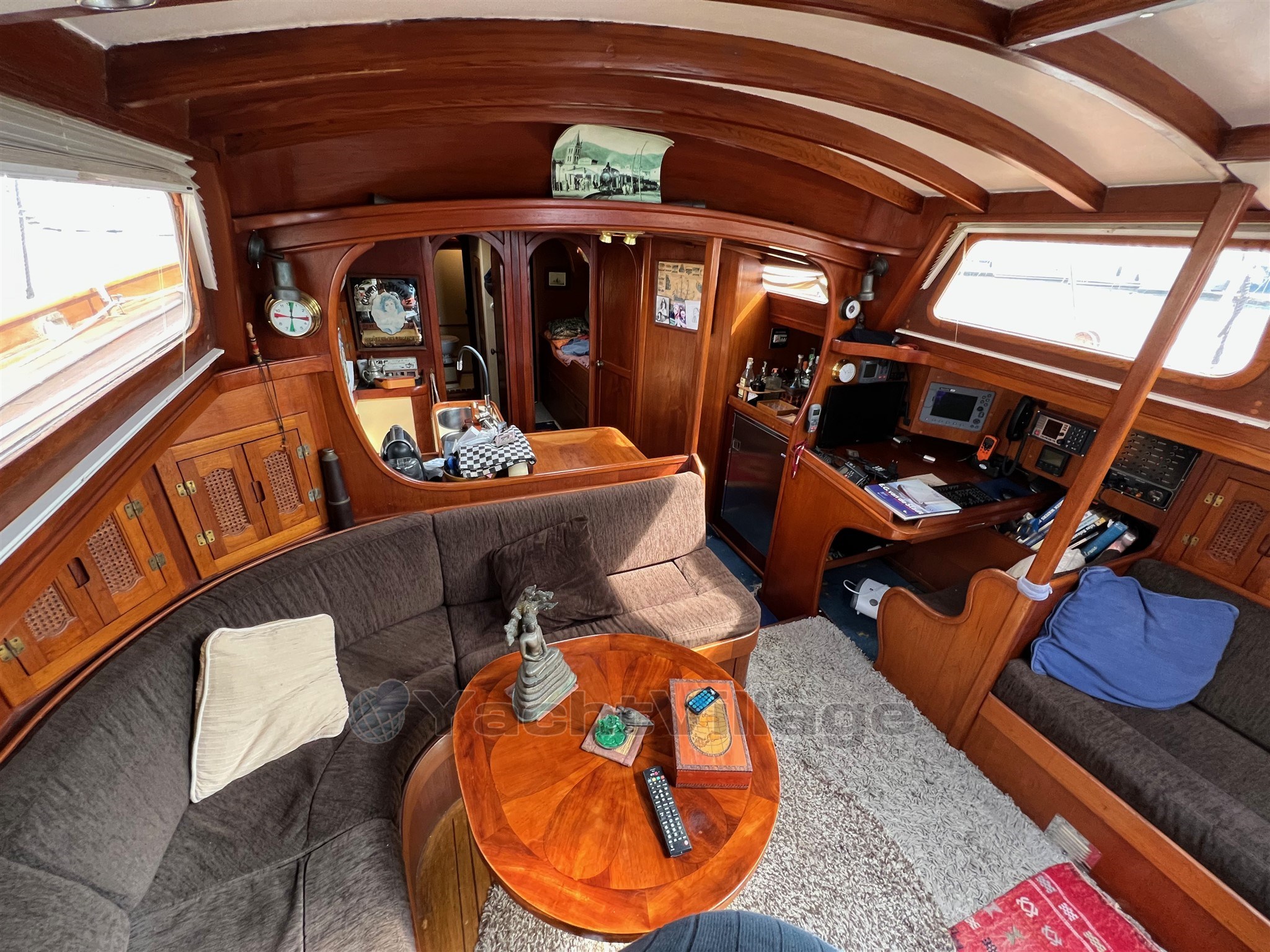 Sandwich/aluminium hull, 2 water tanks communicating by depression to serve as ballast. Electric water heater + gas water heater which serves as heating. Standing rigging changed 6 years ago. New engine in 2017. Mooring available, 5000 euros/year
