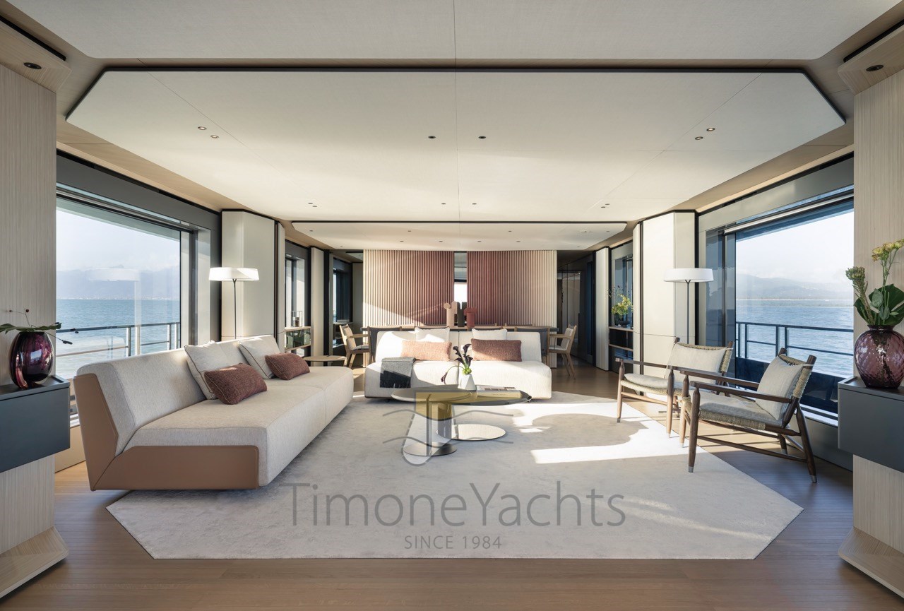 Zwischen dem 270-Grad-Blick auf das Meer und dem geformten Kombüsenschott, das kunstvoll Wellen imitiert, folgt das Arrangement der nautischen Tradition mit radikaler Offenheit.