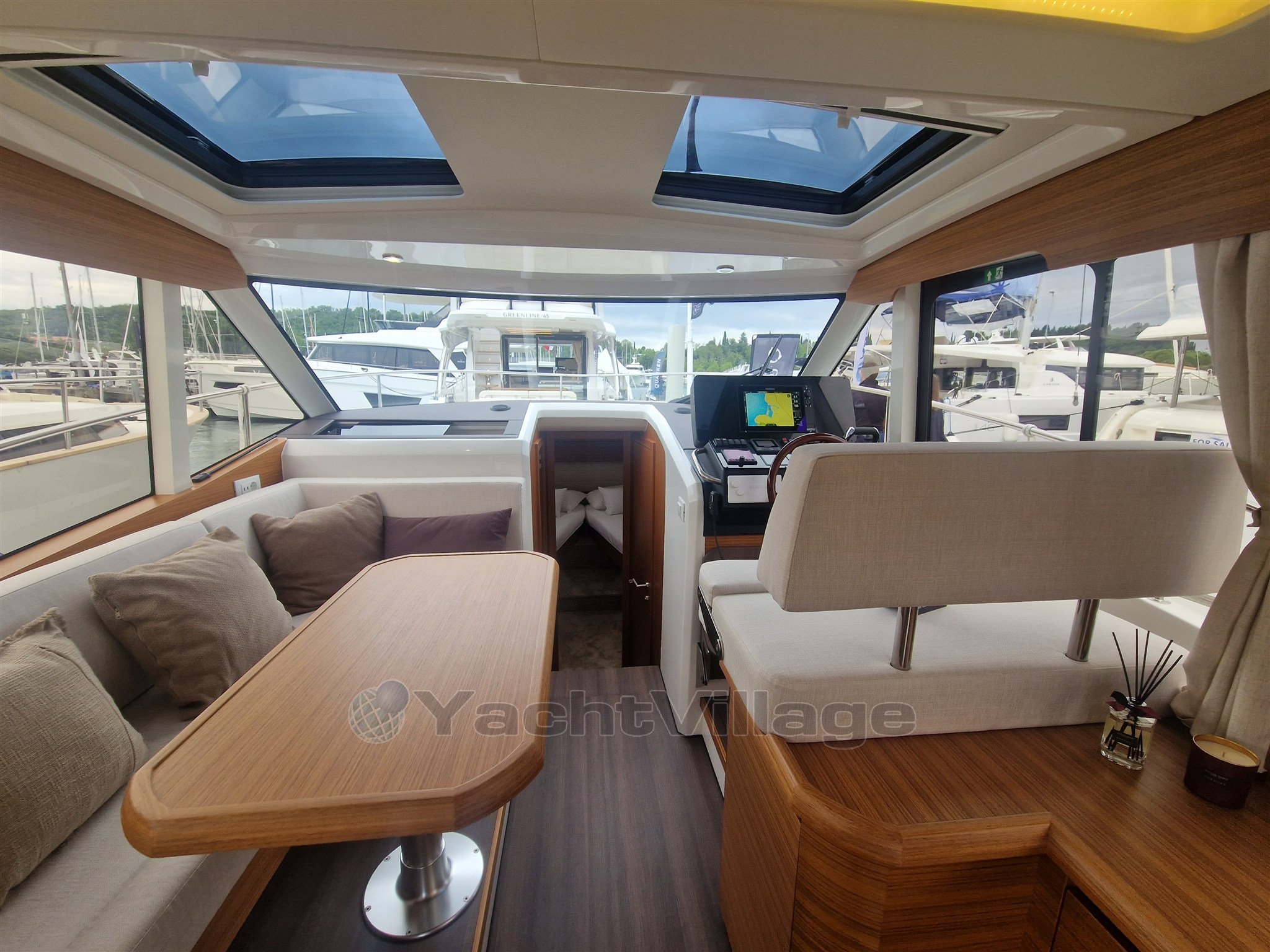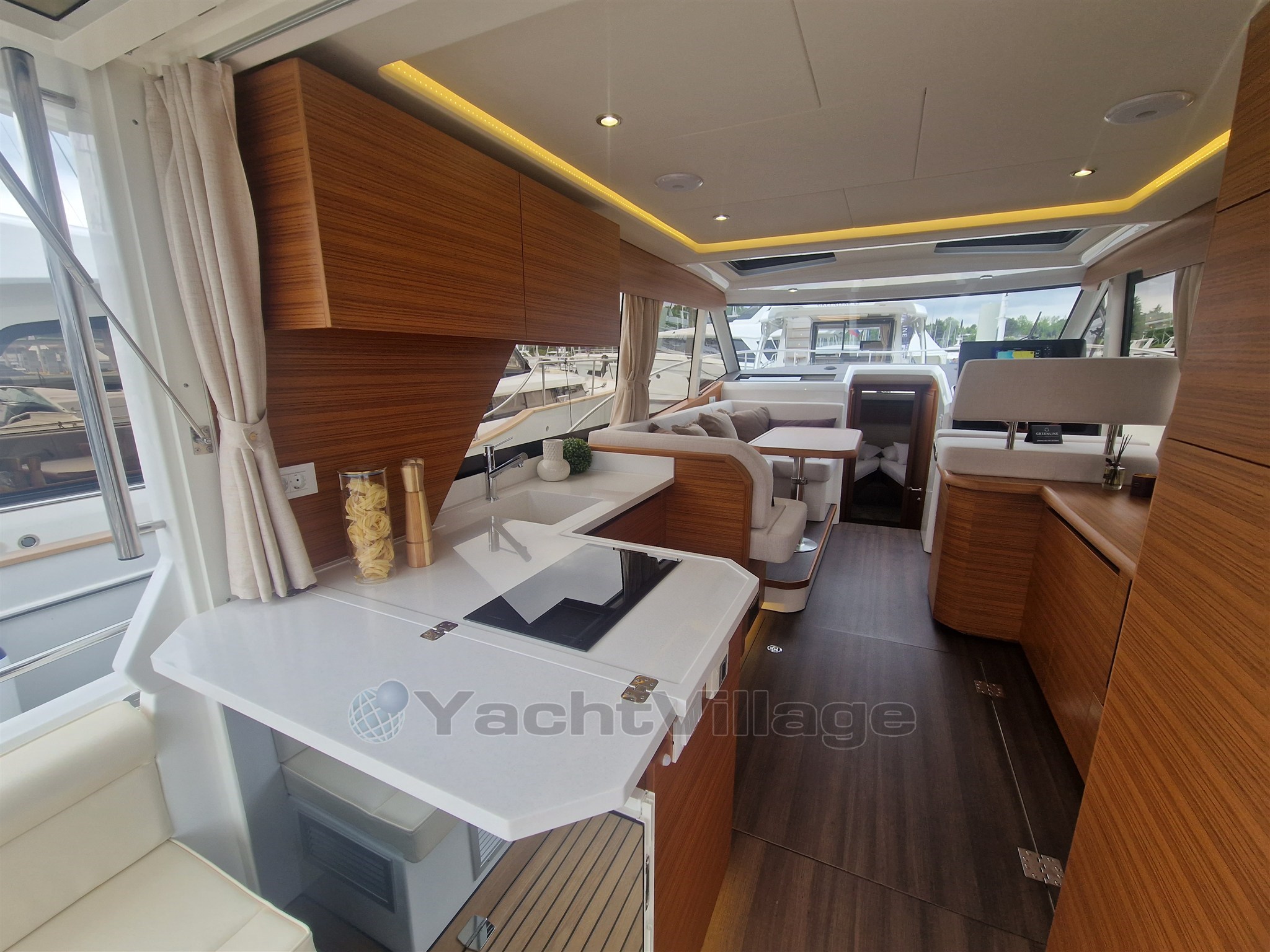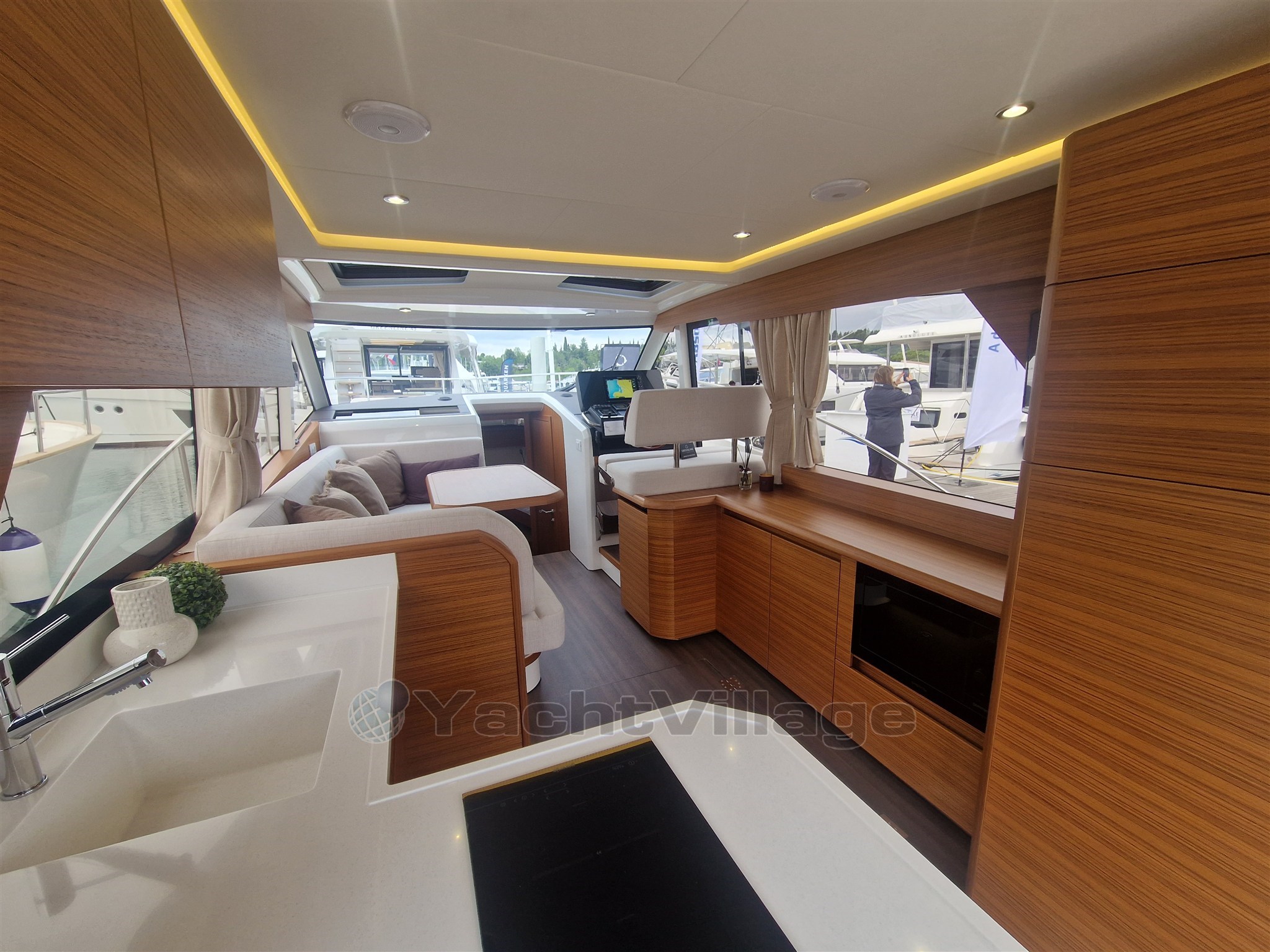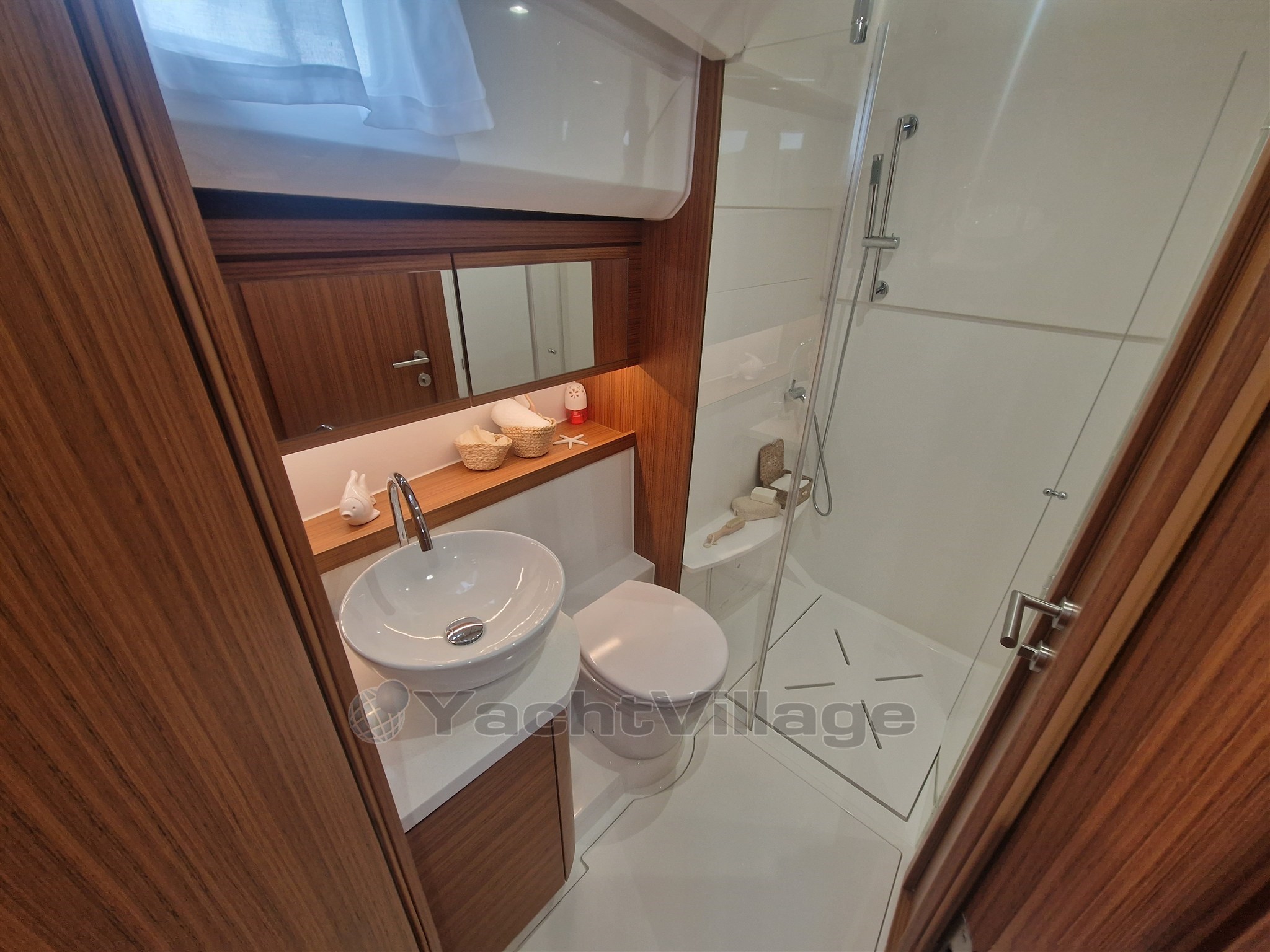 4 x Photovoltaic panels integrated in the coachroof, 1.32 kW. Solar battery charge management system. 2 x 160Ah LiFePo Victron service battery (4.1 kW), Automatic inverter charger 12V / 3000W / 120A (permanent 230V on board system). Hull + cabin colour Pure White (RAL 9010). Furniture in Golden Teak, Dark laminated salon floor, Kerrock counter top, Kerrock sink, mirror effect door. Bow Thruster, hot water, anchor windlass, full size fridge and freezer compartment, induction stove. Two opening hatches on the roof, electric . Electric microwave with grill function 230V in galley. Reverse cycle air conditioning, 10.000BTU (only 230V AC). COLREG certified - LED navigation lights. Bow anchor, Sun cushions on the cockpit seats. Electric swimming platform with wireless remote control.