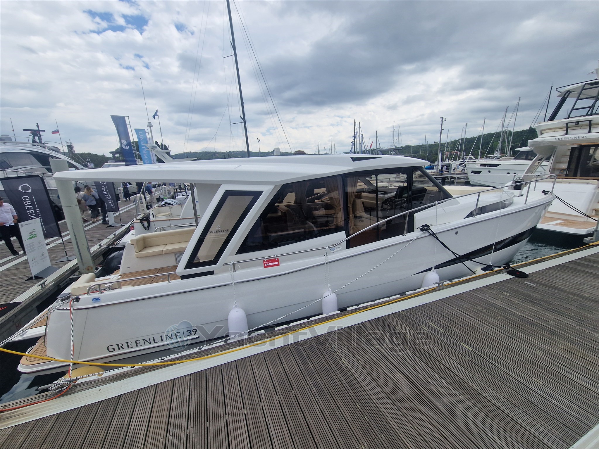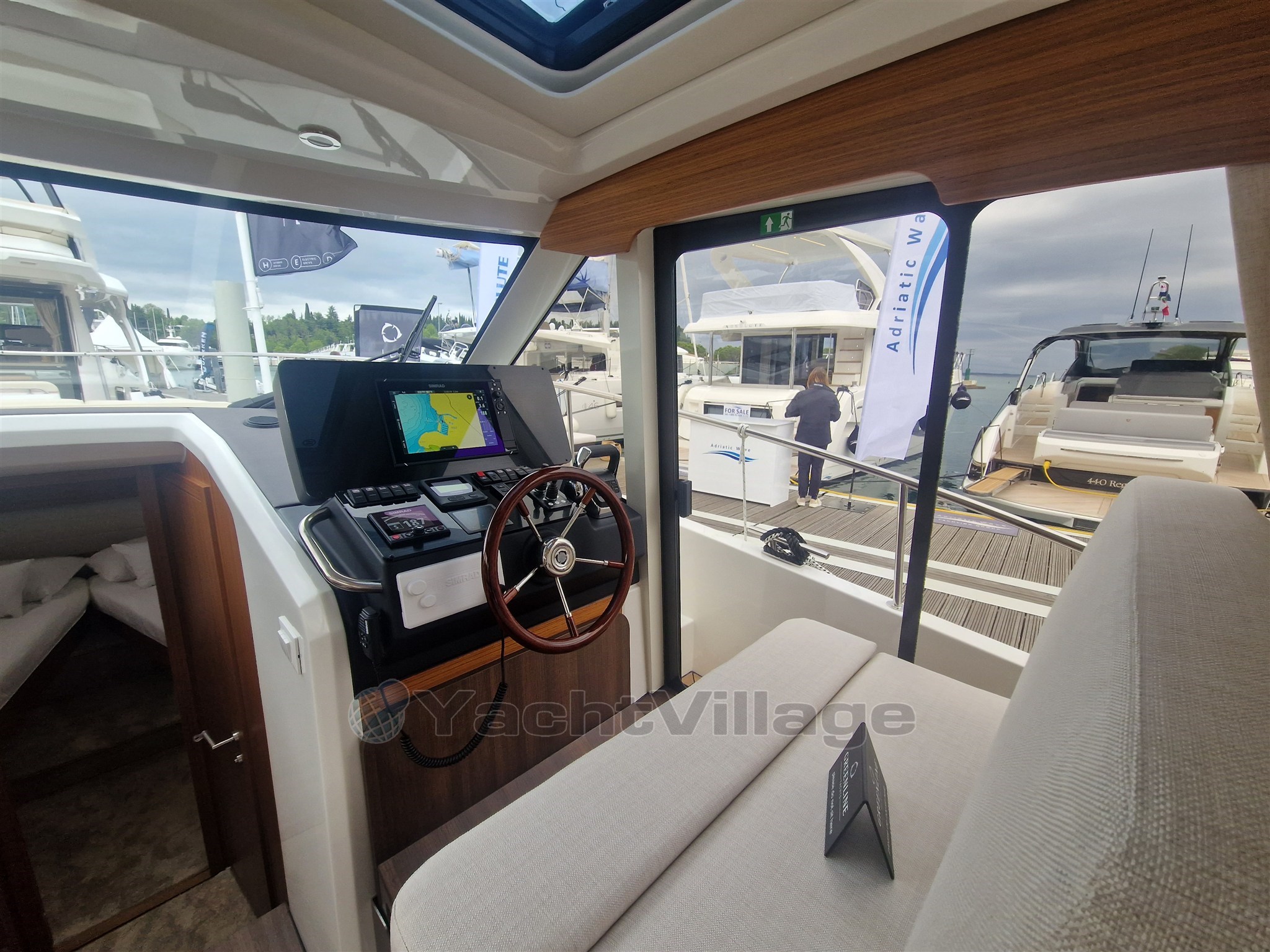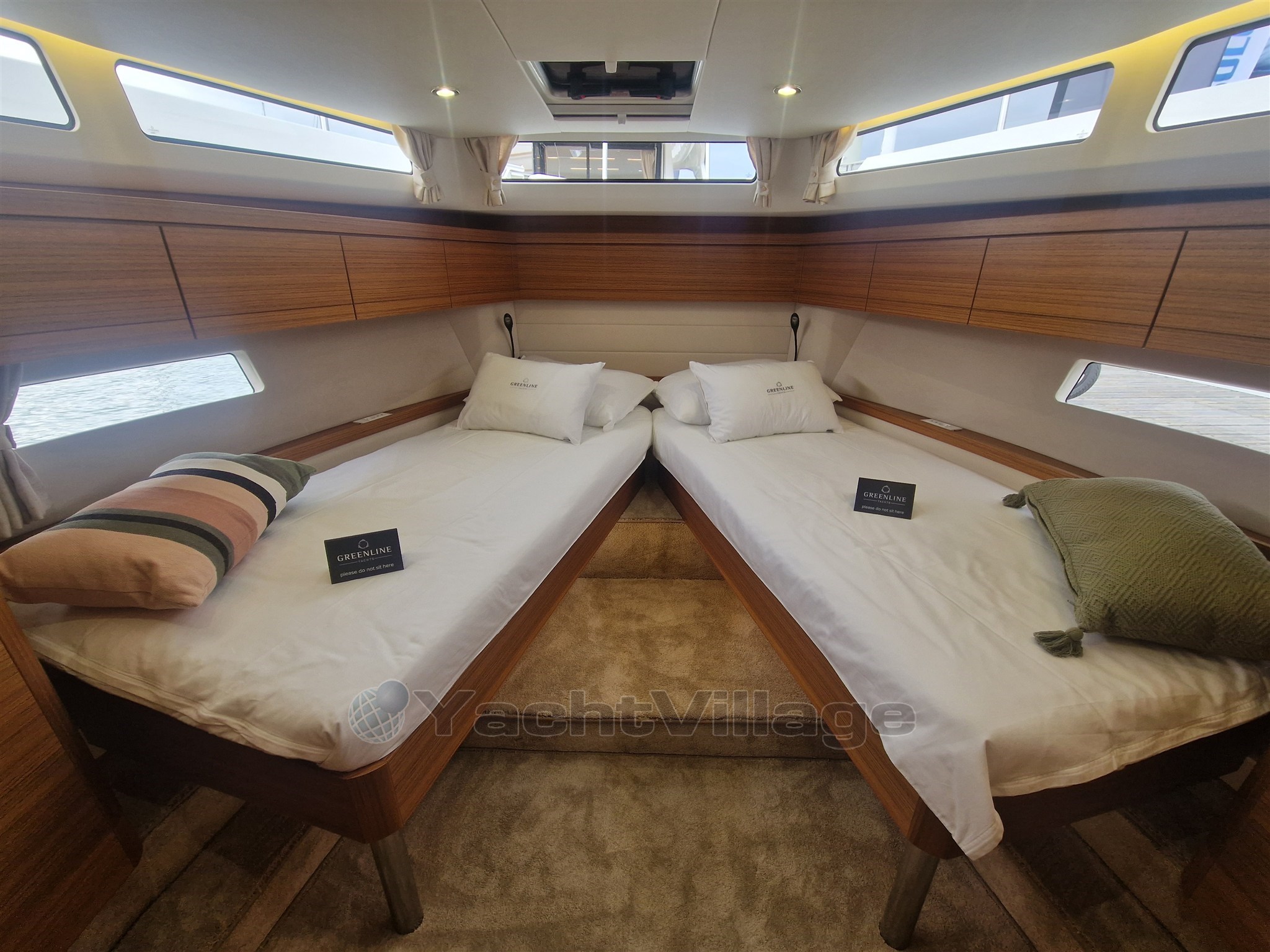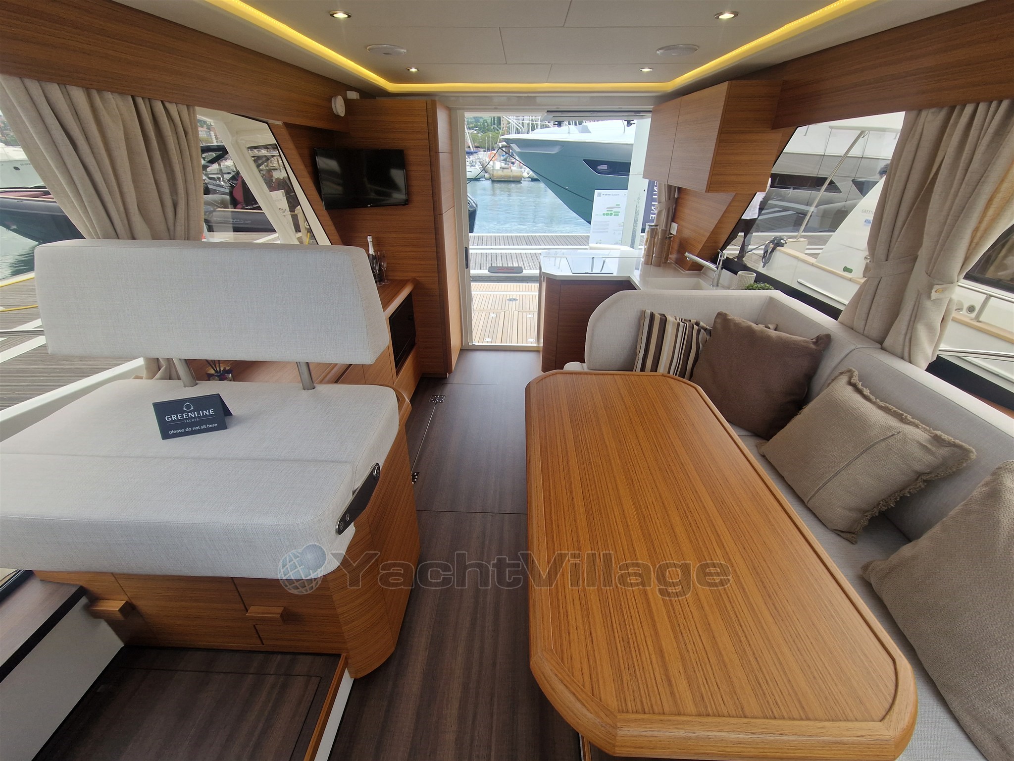 4 x Photovoltaic panels integrated in the coachroof, 1.32 kW. Solar battery charge management system. 2 x 160Ah LiFePo Victron service battery (4.1 kW), Automatic inverter charger 12V / 3000W / 120A (permanent 230V on board system). Hull + cabin colour Pure White (RAL 9010). Furniture in Golden Teak, Dark laminated salon floor, Kerrock counter top, Kerrock sink, mirror effect door. Bow Thruster, hot water, anchor windlass, full size fridge and freezer compartment, induction stove. Two opening hatches on the roof, electric . Electric microwave with grill function 230V in galley. Reverse cycle air conditioning, 10.000BTU (only 230V AC). COLREG certified - LED navigation lights. Bow anchor, Sun cushions on the cockpit seats. Electric swimming platform with wireless remote control.