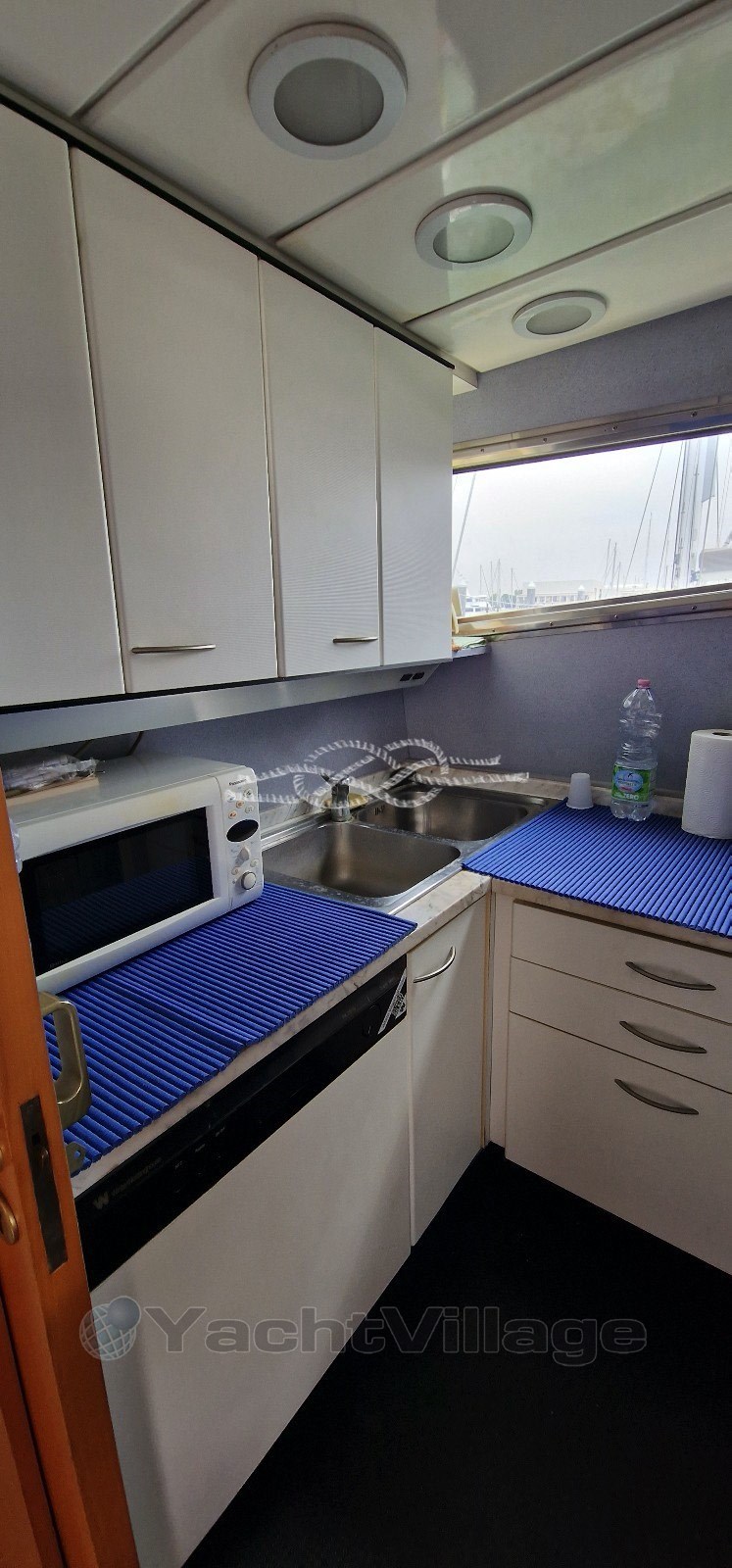 Electric bow and stern thruster - PSS axle seals - Kohler 27 kW generator set - Condaria air conditioning (2020) - Glomex TV antenna - Glomex SAT TV antenna - LCD TV in the living room - Besenzoni gangway - freezer fridge - 4-burner induction hob - icebox and ice maker in the living room - fly fridge - dishwasher - stereo in each cabin - hi-fi in the lounge and fly - Arimar tender 2.60 m with Evinrude 3.5 hp outboard - gray and black water tanks.