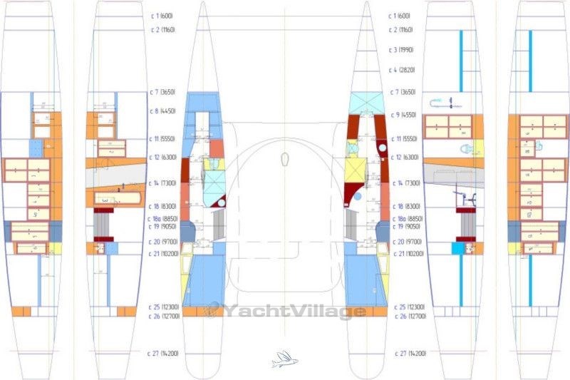 Aft cabin, Bow cabin, Owner's cabin, Guest cabin, Salon, Marine WC + Wash basin + Shower