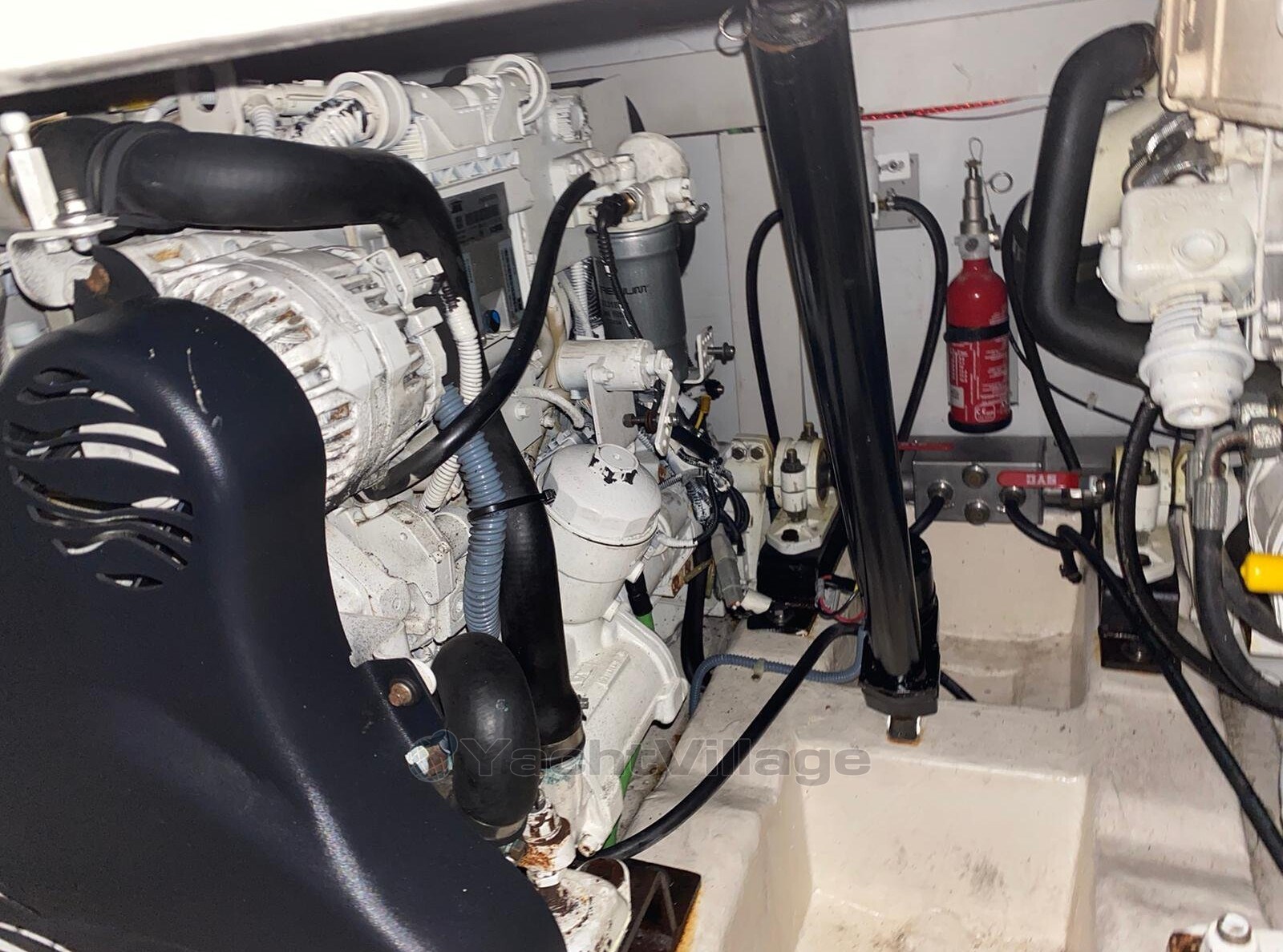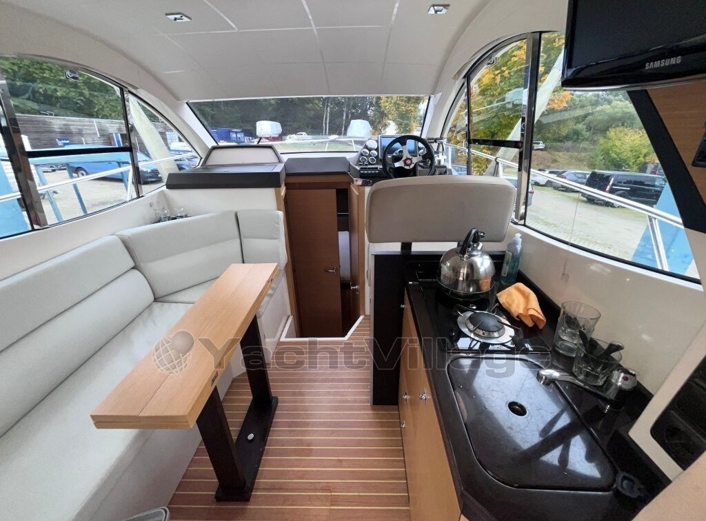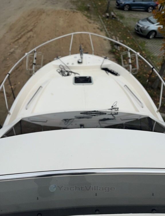 owner's cabin, guest cabin, saloon, 2nd steering position on fly, flybridge, refrigerator el., sink, toilet electr. + washbasin + shower, GPS with daughter, chart plotter, sumlog, compass with daughter, shore power supply 220 volts, battery, battery main switch, bow anchor windlass el., bilge pump, battery charger, camper canopy, flybridge cover, bimini top, stern door to bathing platform, bathing platform, swimming ladder, trim tabs el./hydr., pressurized water system, hot water system, stern shower hot/cold, bilge pump electric, heating, radio, other extras, underwater paint, bow thruster, stove gas 2-burner,