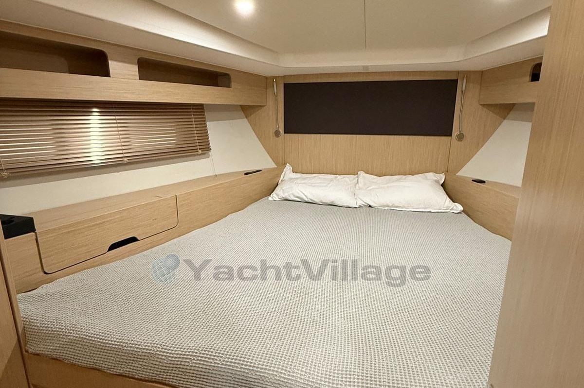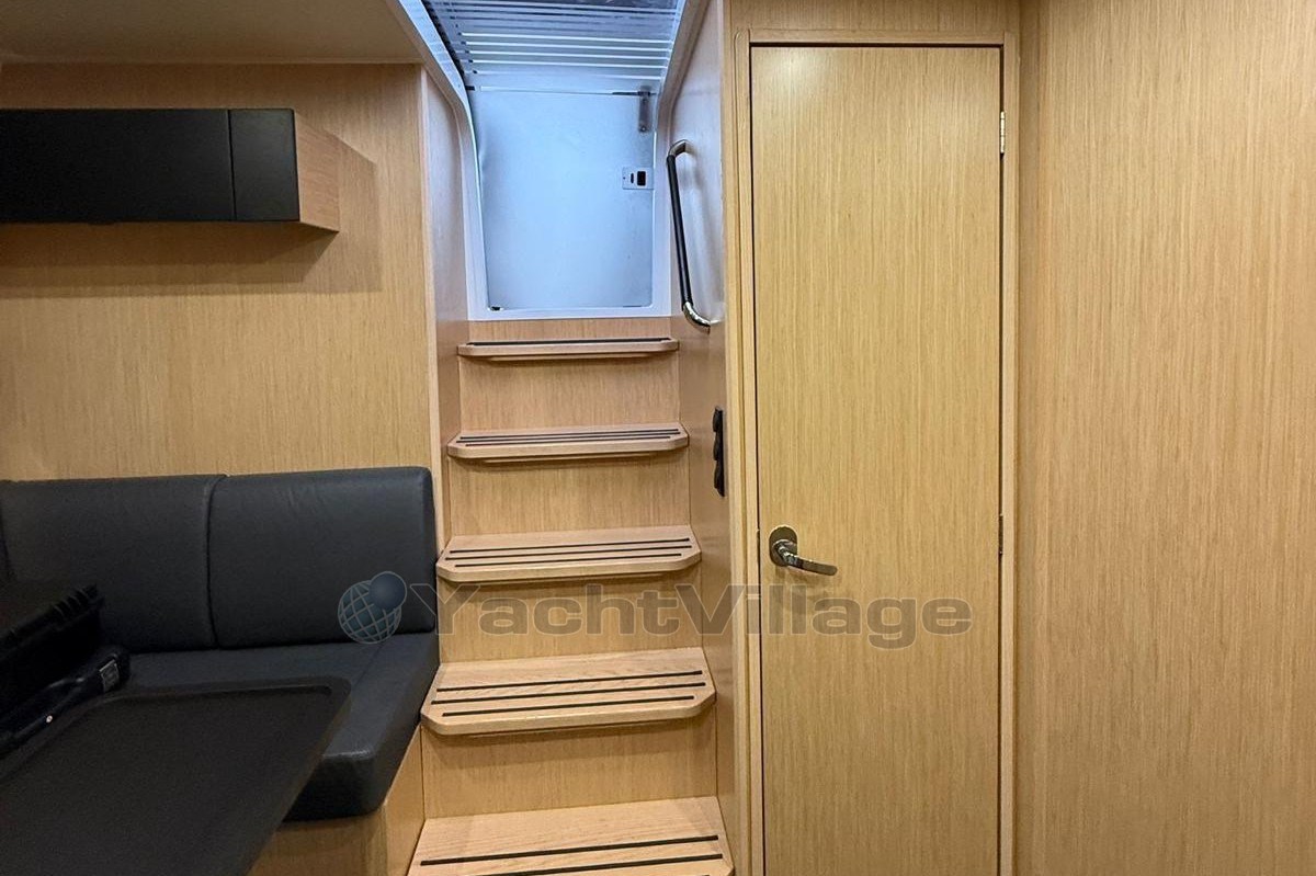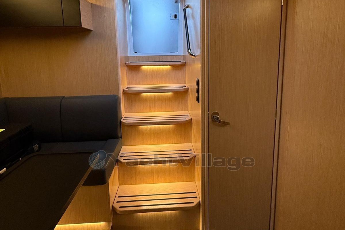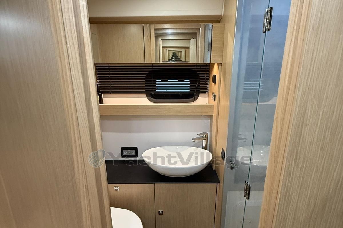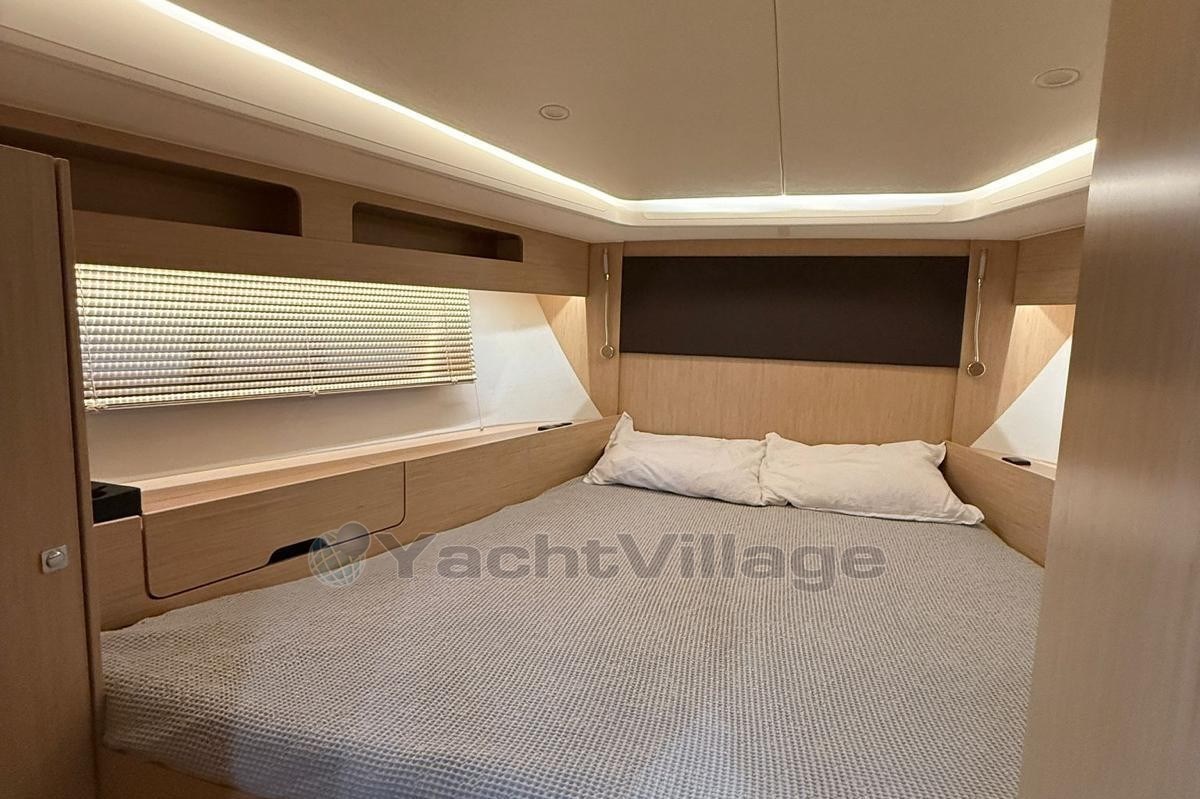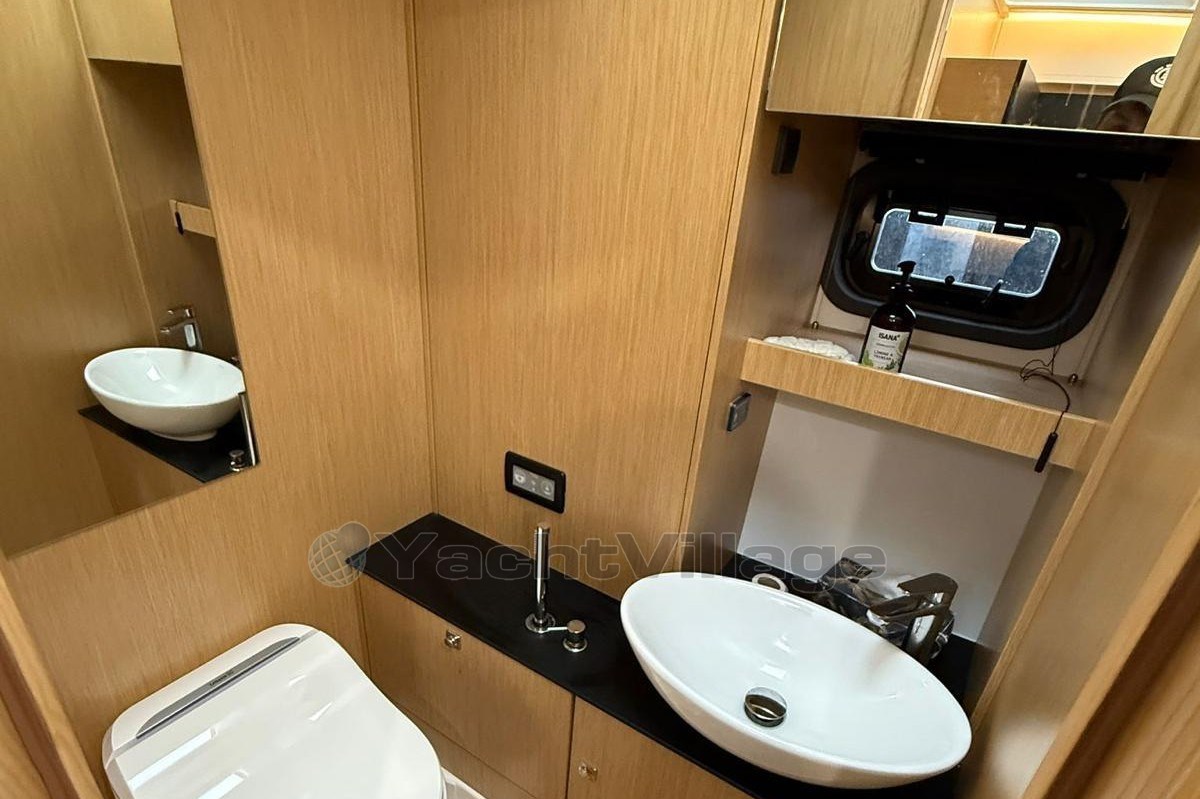 The spacious cockpit offers a wet bar with refrigerator, generous seating, electric fabric sunroof, black camper cover, and foredeck sun cushions. A hydraulically lowerable bathing platform enhances comfort at anchor.Below deck, the elegant Nordic Oak interior includes two cabins with upgraded cold foam mattresses, two Sea Breeze toilets, gray upholstery, galley refrigerator and TV preparation in the saloon.