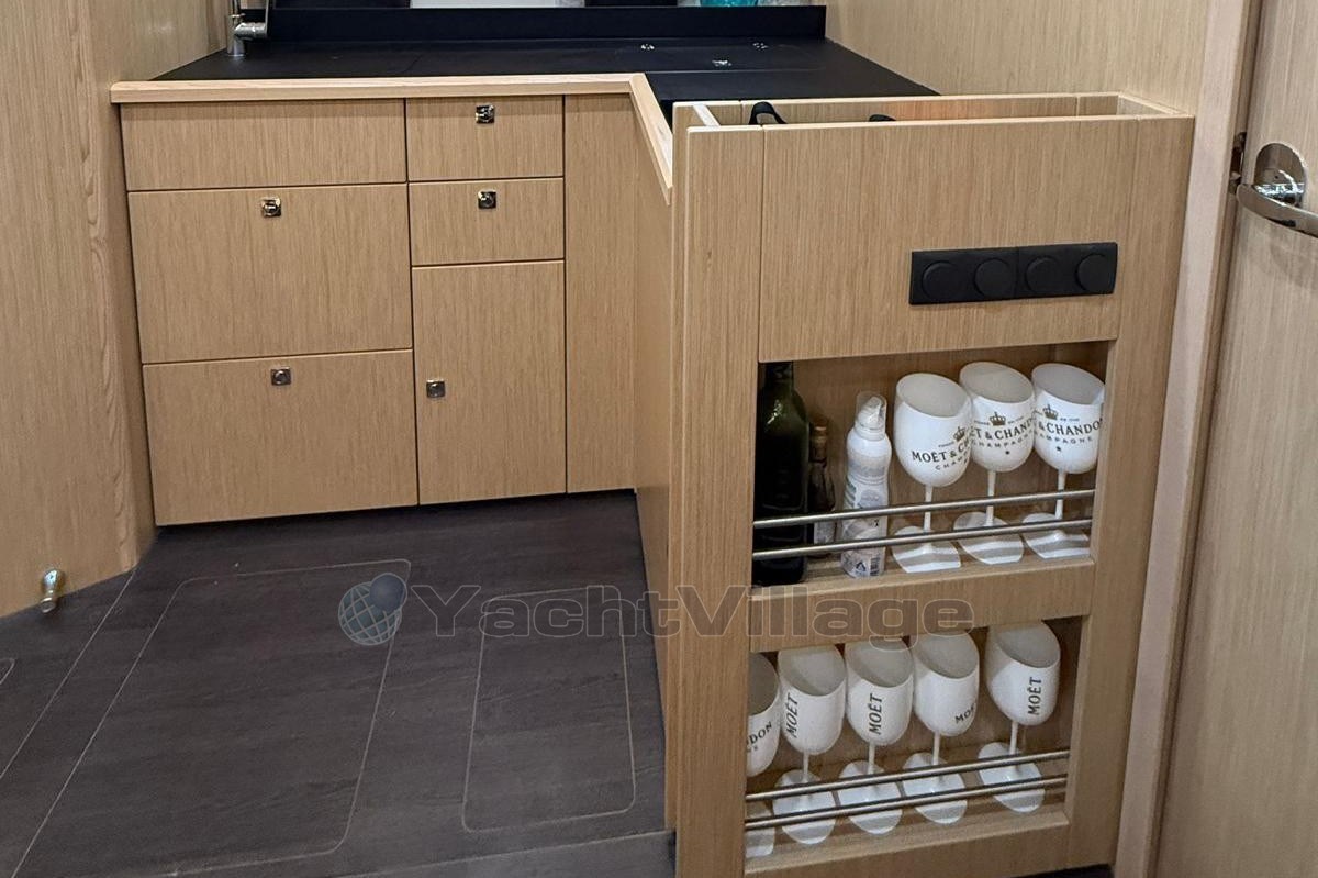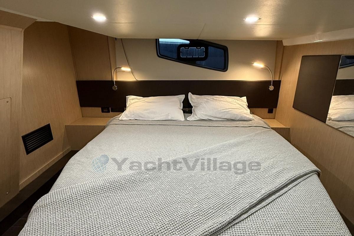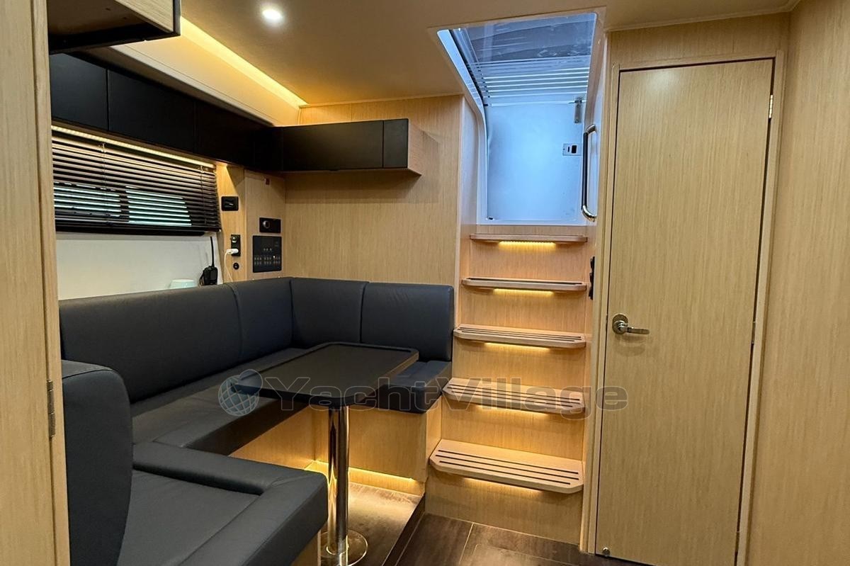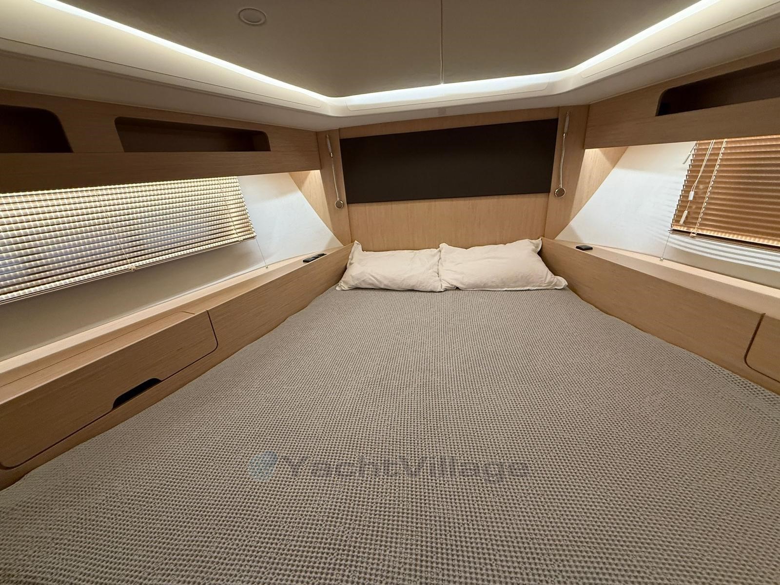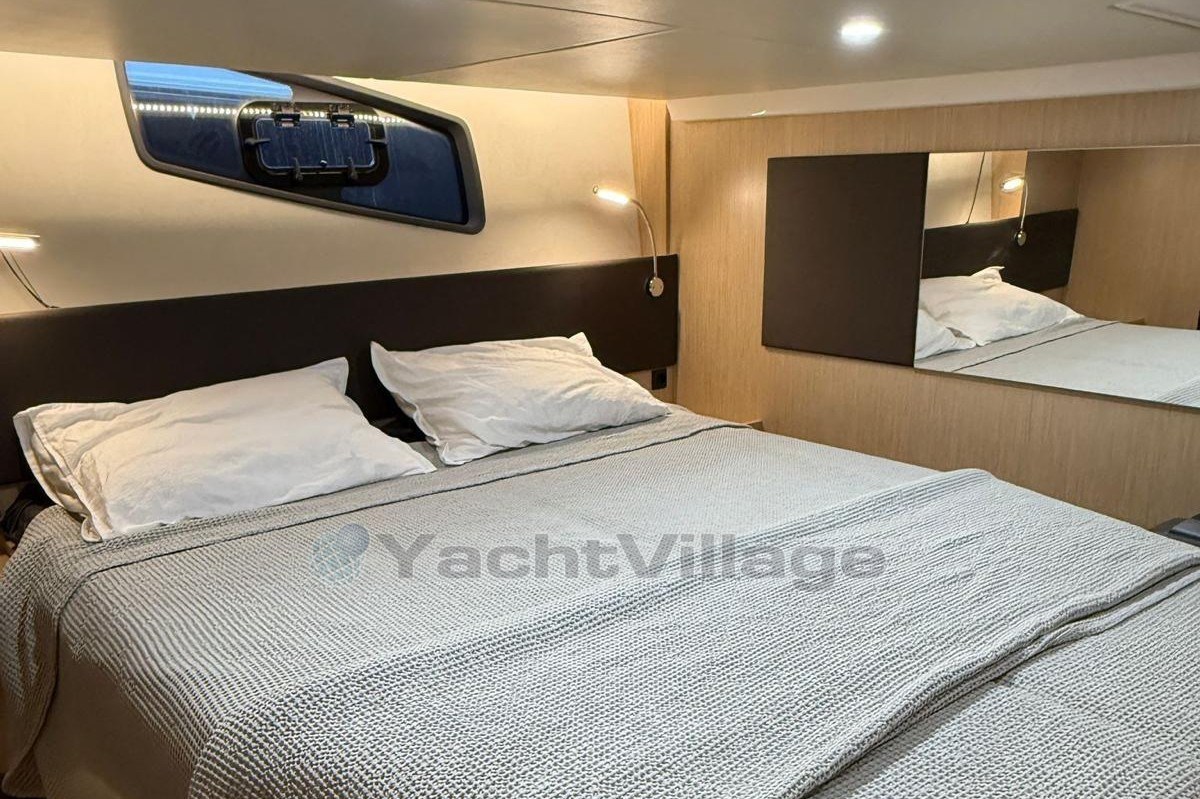 The spacious cockpit offers a wet bar with refrigerator, generous seating, electric fabric sunroof, black camper cover, and foredeck sun cushions. A hydraulically lowerable bathing platform enhances comfort at anchor.Below deck, the elegant Nordic Oak interior includes two cabins with upgraded cold foam mattresses, two Sea Breeze toilets, gray upholstery, galley refrigerator and TV preparation in the saloon.