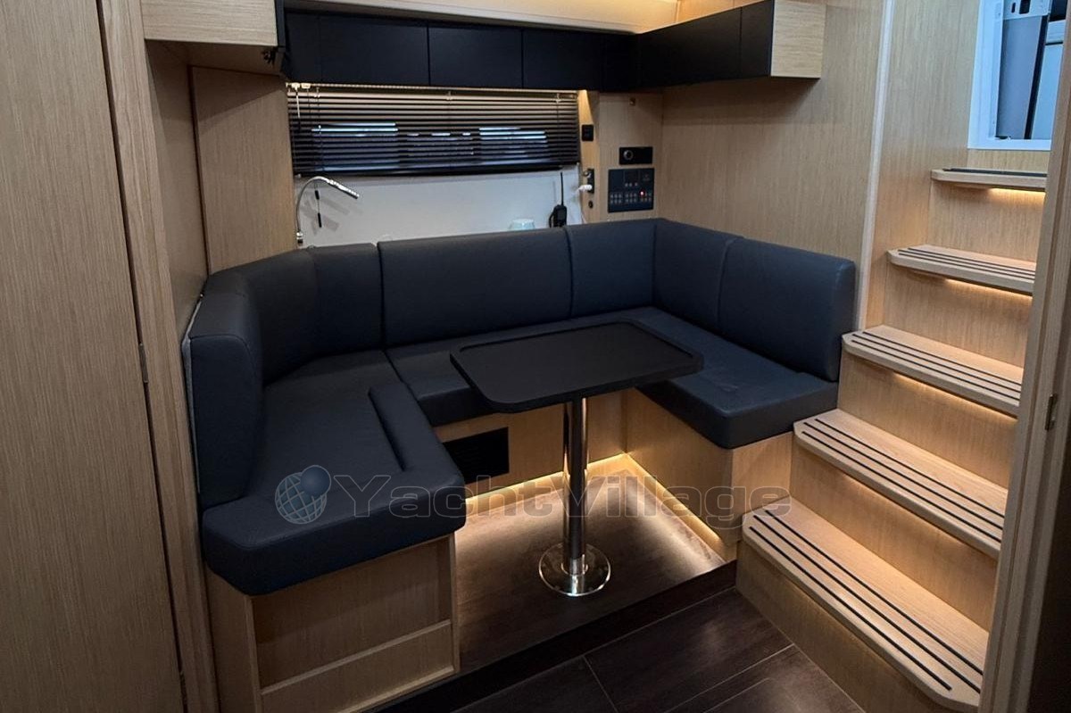 Major highlights include an 8 kW diesel generator, powerful 55,000 BTU air conditioning, Aquamatic joystick, bow thruster, and Dockmate Twist remote docking system by Dockmate — ensuring effortless handling in tight Mediterranean marinas.