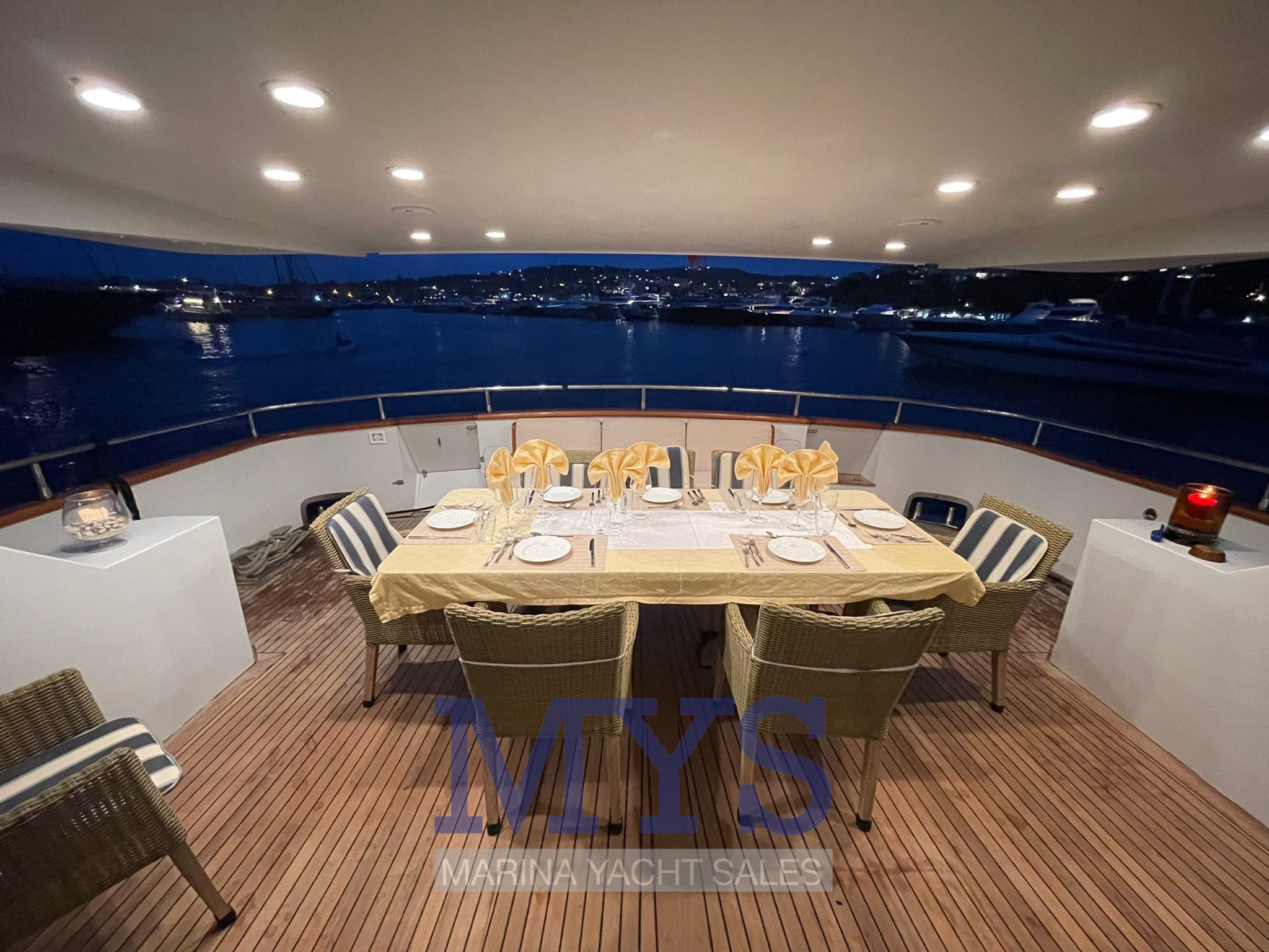 The main deck offers a large and bright living area where you will have a relaxation area with a large "U" shaped sofa, corner bar, Samsung smart LED TV in 4K-ultra HD with 55" curved screen, home theater, Play-station 4 PRO, DVD / Blu-ray player and "YAMAHA" stereo system with bluetooth function, mobile phone charging platform and an area dedicated to lunch / dinner with a large and elegant table to comfortably accommodate 8 people.