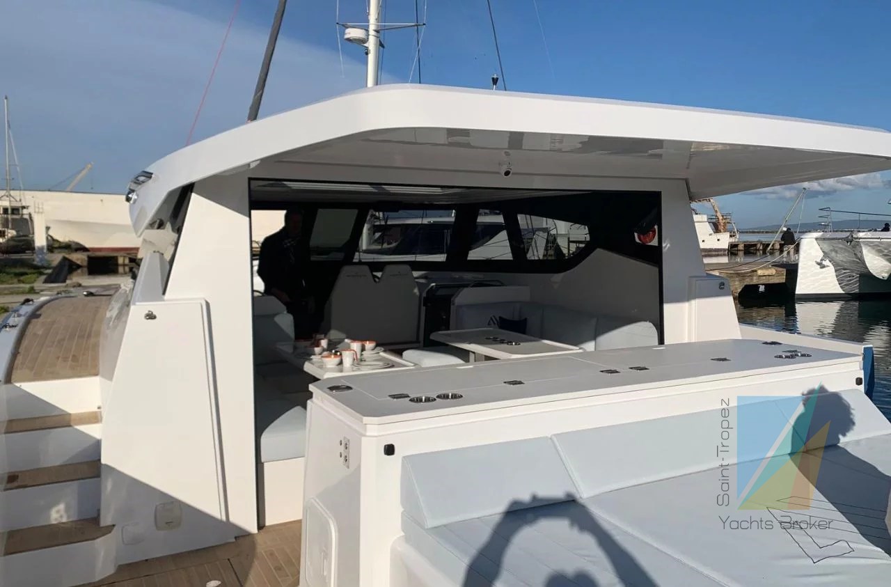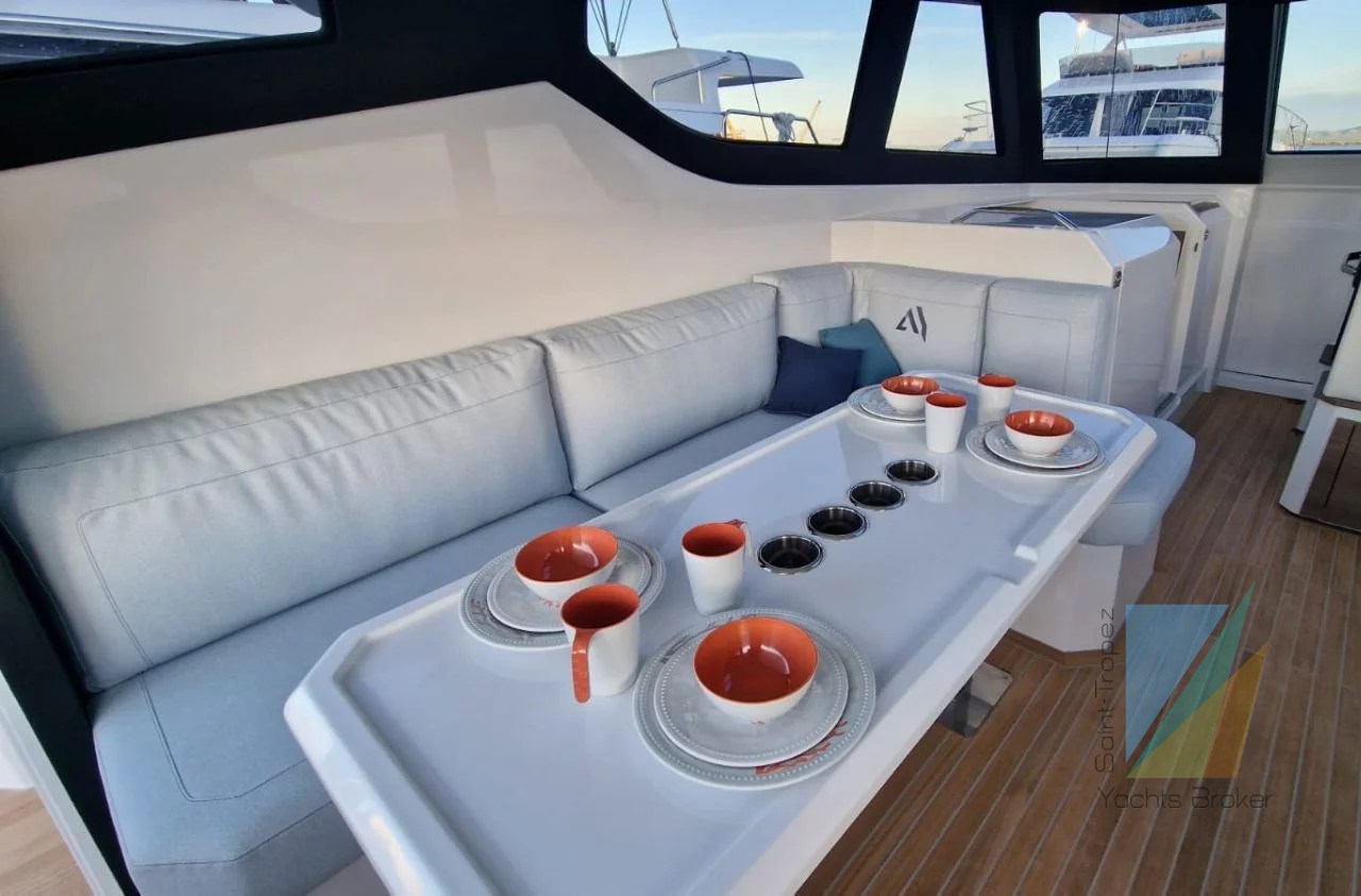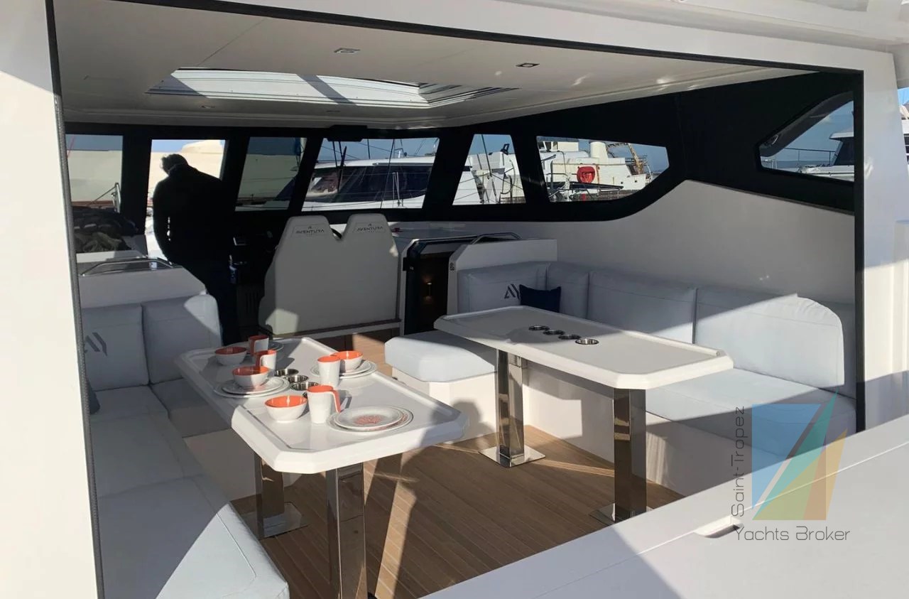 The superstructure is open to the aft decks, with the galley just in front of the sunpad. At the front is a two-seater helm station and a sliding door that gives access to the forward cockpit. Further back are the stairs leading to the hulls. The aft part of the superstructure has a sofa and a table on each side.