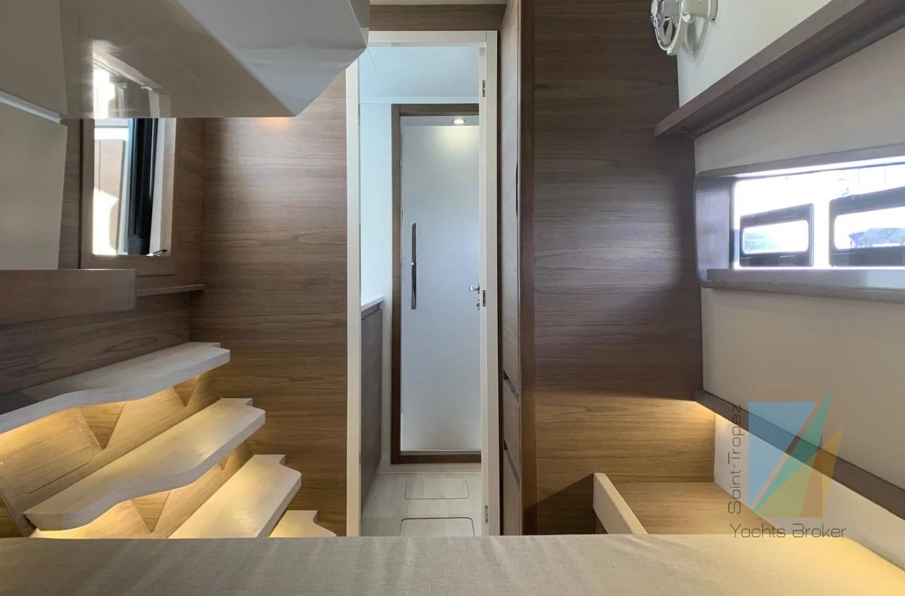 The hulls are beautifully appointed with double aft cabins and forward bathrooms with separate showers. The planing hulls are expected to offer a cruising speed of 17 knots and a maximum speed of 25 knots.