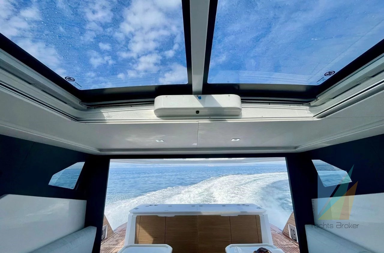 A huge aft sundeck and a lift-up aft platform add to the comfort. A roll-up bimini extends to the rear of the roof to provide shade. The forward cockpit is accessible both from the side decks and through a door in the superstructure and offers a 360-degree view.