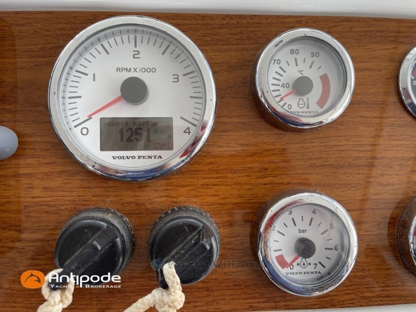 SWIFT TRAWLER 42, 2009, VOLVO D4, 2 x 300 hp (1248 hrs), Bow thruster, 1 forward owner cabin, 1 guess cabin (1 double bed & 1 bunk removable single bed), 2 heads (toilets + shower), Laminated floorboards, Altra Chanvre saloon upholstery, Saloon table convertible in double bed, Teak slatted cockpit, Flying bridge canvas (from 2023), Electric windlass - LEWMAR, Flying bridge & wheel house windlass remote controls, Flying bridge bimini top, Flying bridge cushions, Flying bridge seat cover, Full cockpit enclosure, Windscreen covers., Raymarine ST6002 in board autopilot , ST40 Raymarine wind captor, GPS and chartplotter (wheel house) - RAYMARINE E120, GPS and chartplotter (flying bridge) - RAYMARINE E80, Electronic navigation charts, Radar with radome radar fitted on mast - RAYMARINE, AIS Class B system - SIMRAD 50, DSC VHF (twin station) - RAYMARINE RAY240E, Radio CD AUX USB + speakers, Cockpit speakers (Radio CD), Television (saloon) & GLOMEX antenna, Fridge unit 12 V (front opening door), Water heater 220 V and engine heat exchanger, Hot and cold pressurized water, 3 burners cooker + oven, 220 V shore power + battery charger - Cristec 40A, Interior 220 sockets, Heating system WEBASTO (2 units), Holding tank, Electric toilets (owner head), Hot and cold cockpit shower, 6 men liferaft - Type 2, Kobra 25 Kg anchor + 90m lenght of chain (2017), Rope cutters on shafts (2017), Fenders and warps, Owner boat, never chartered, Located South Brittany - France, For more information or to make an appointment for a visit, contact : Jean-Baptiste Lemaire + 33 6 10 25 00 03 - jb@antipode-yachts.com