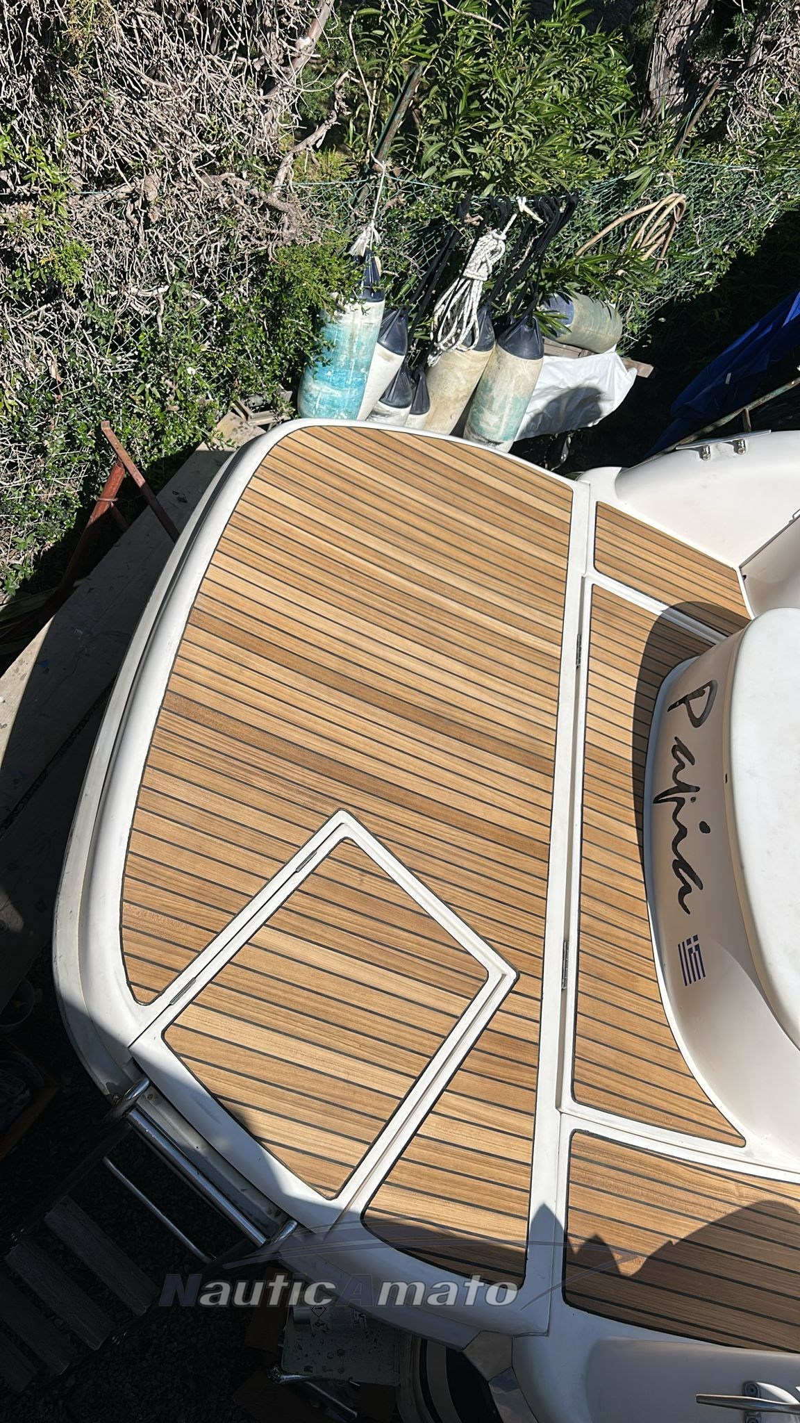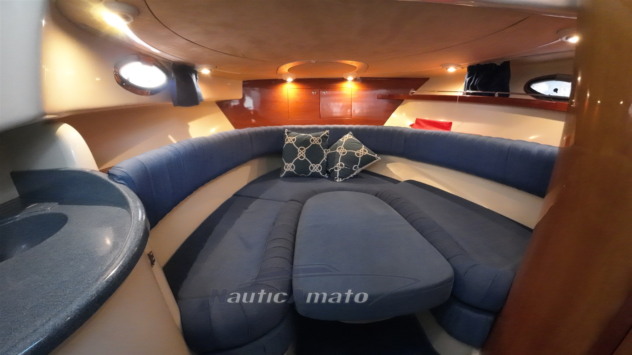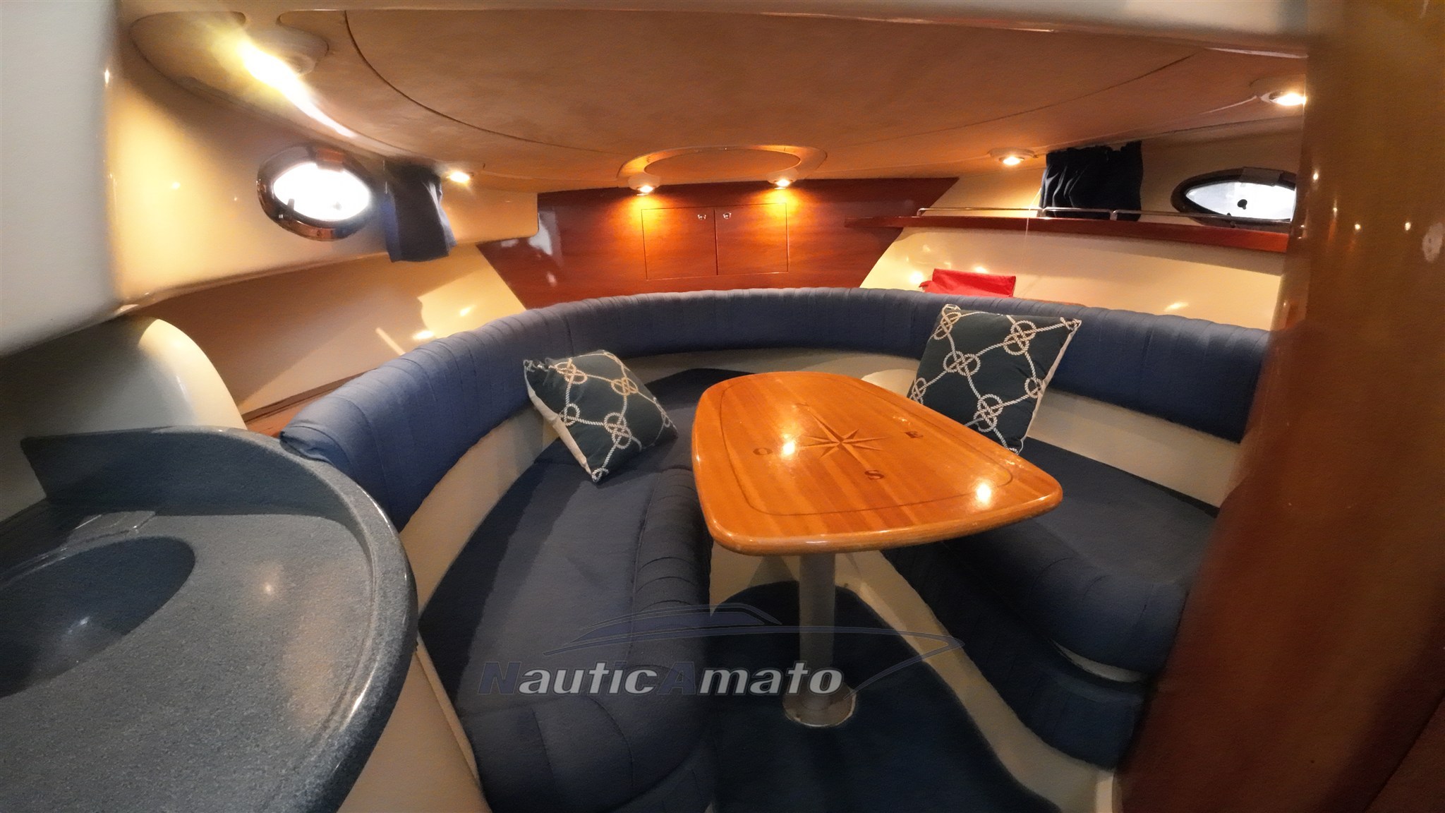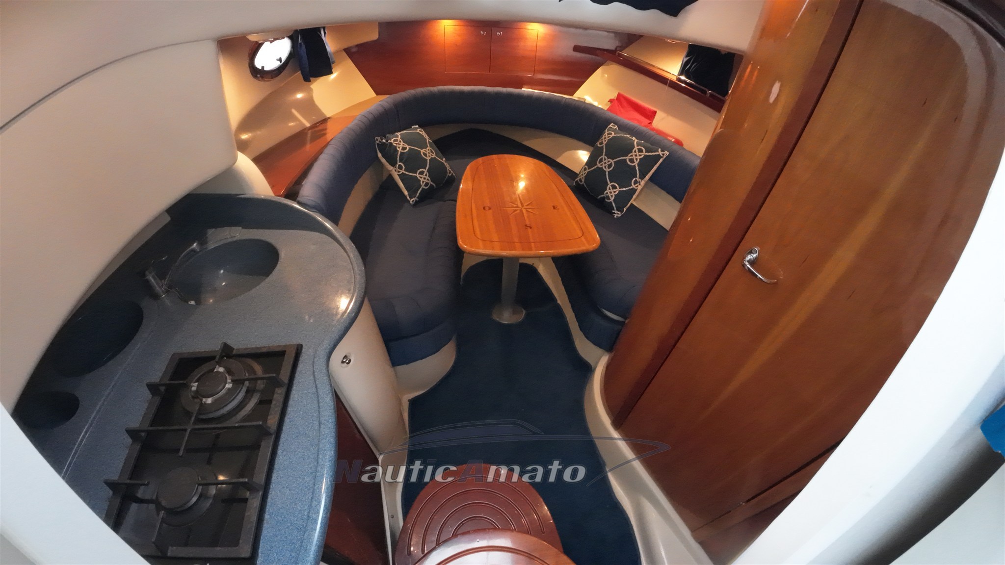 Walk around with 3 beds, equipped kitchen and marine toilet that boasts exteriors exploited in a very intelligent way, with the passage to the bow convenient and comfortable to go to the bow sundeck and cockpit characterized by an "L" shaped sofa and 360 ° swivel guide armchairs