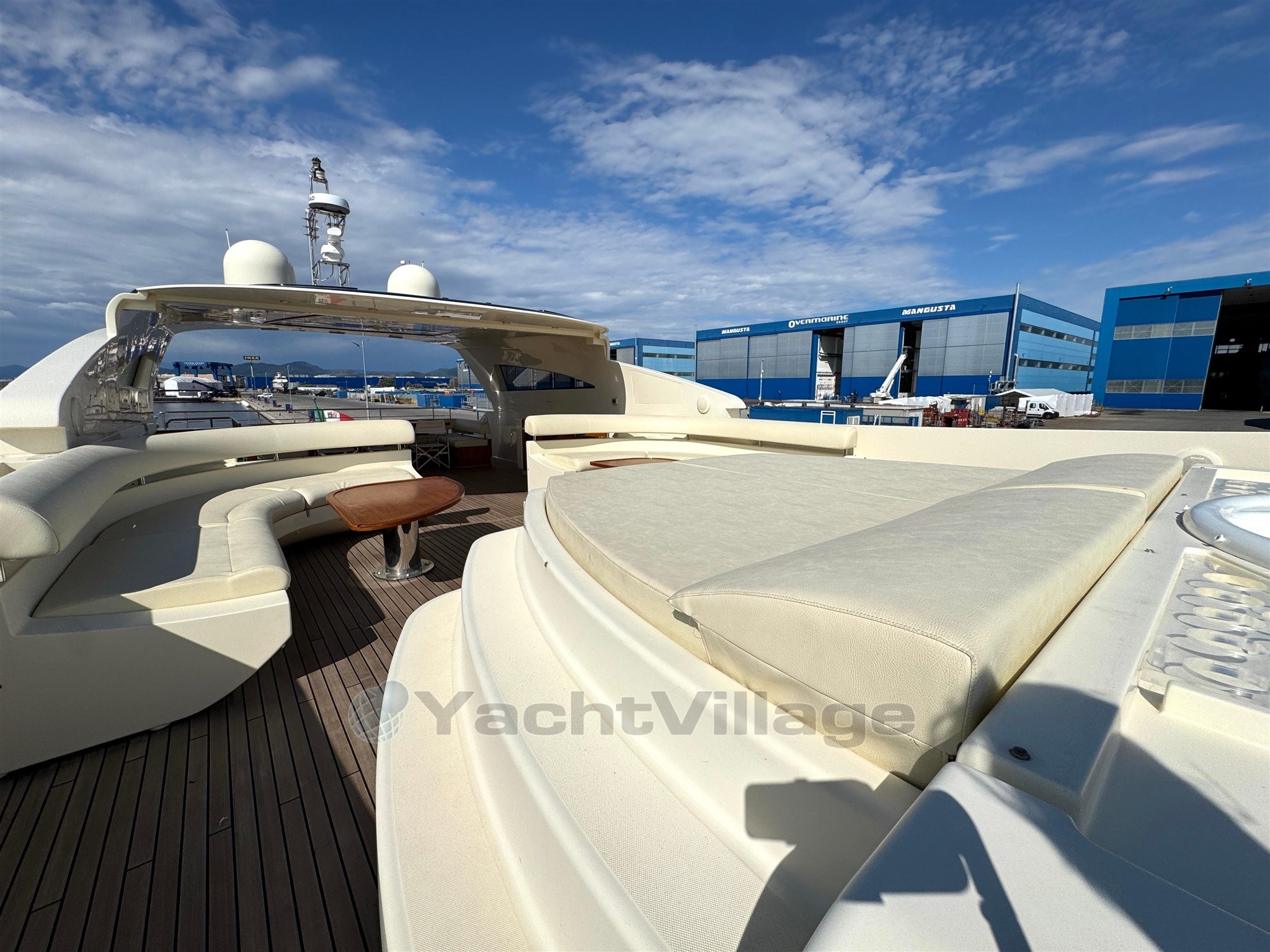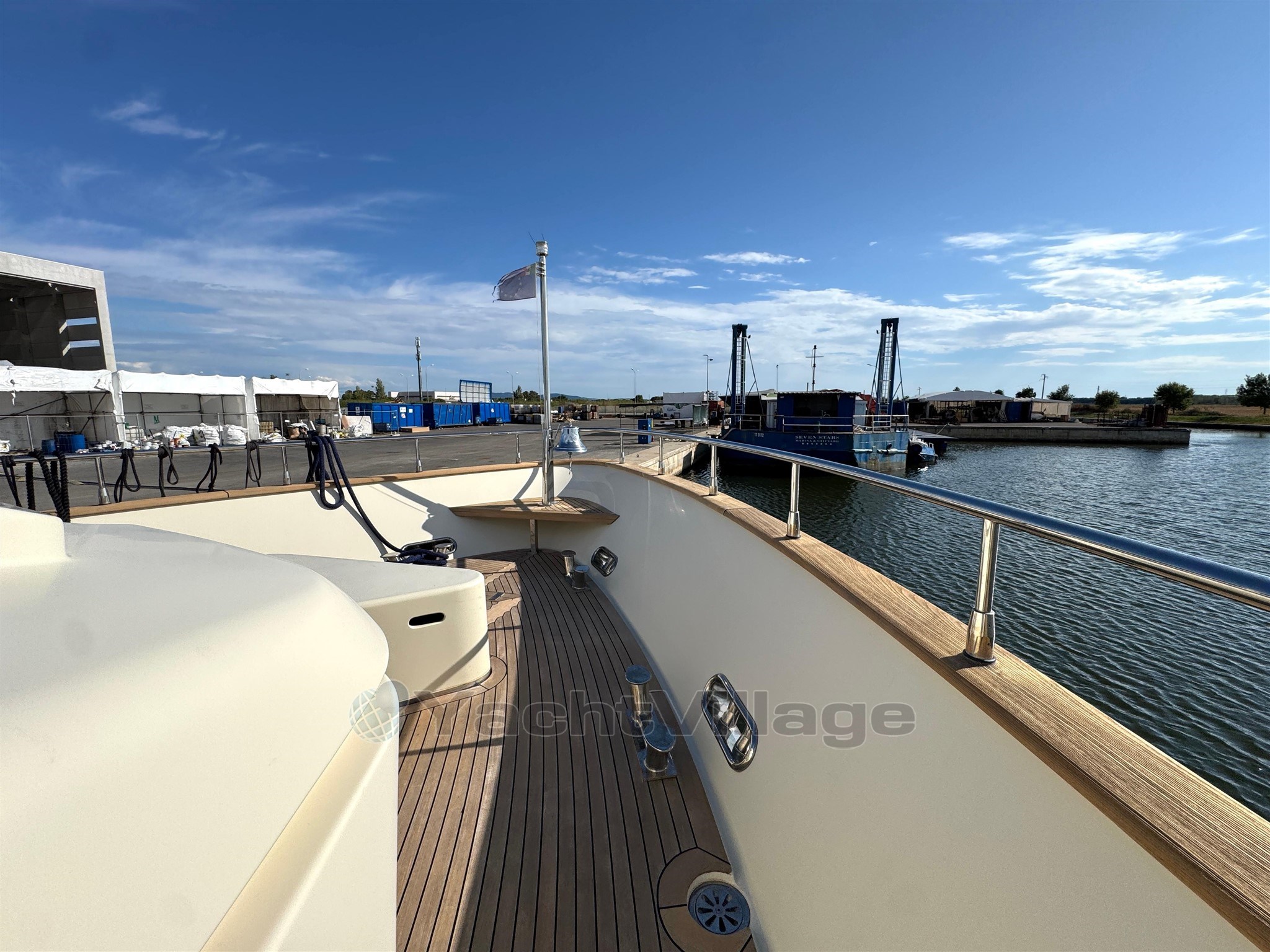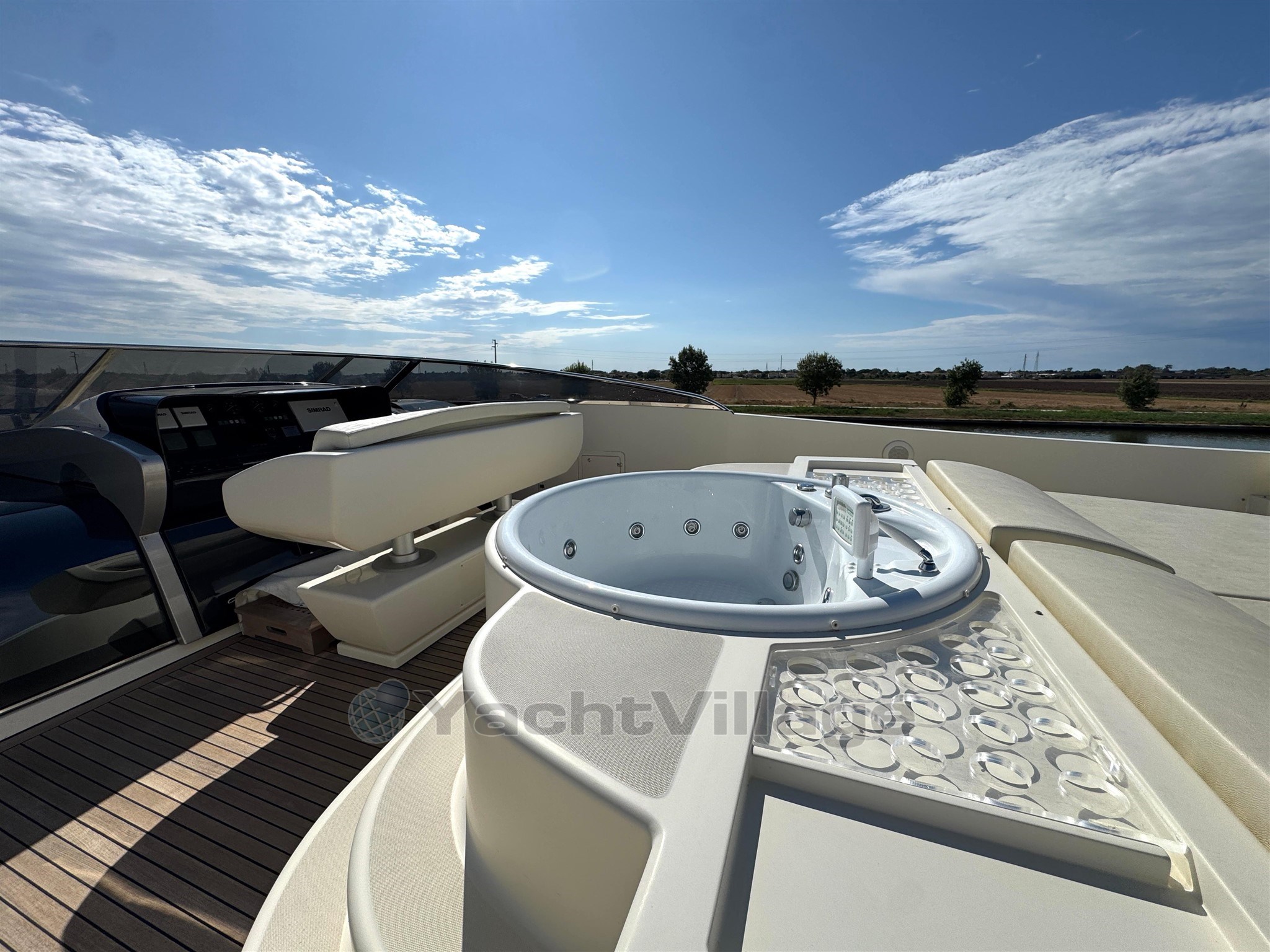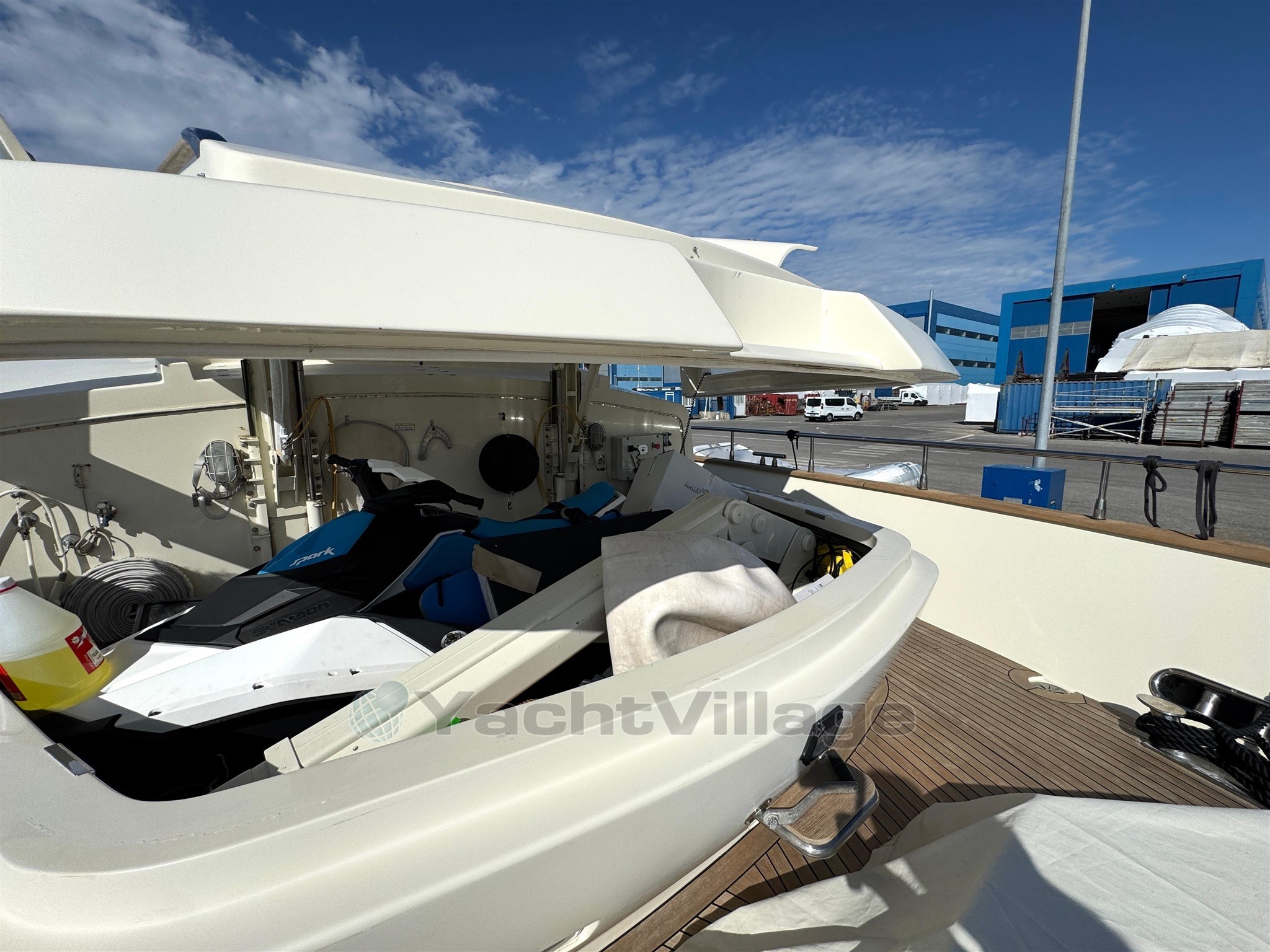 Alarma de humo/gas, alarma de motor, alarma de sentina, 2 anclajes (acero), 2 bombas de agua, 2 balsas salvavidas, baterías, alcantarillas, cubiertas laterales de teca, cargador de baterías, color especial (casco azul y estructura de superestructura), ducha externa, sistema de dirección doble, propulsor de popa (Idraulica), propulsor de proa (Idraulica), luces fijas en la popa, faro ajustable, flaps hidráulicos, garaje para tender (Tender da 4,20), daviones para motos de agua (A prora), Sistema de extinción de incen
