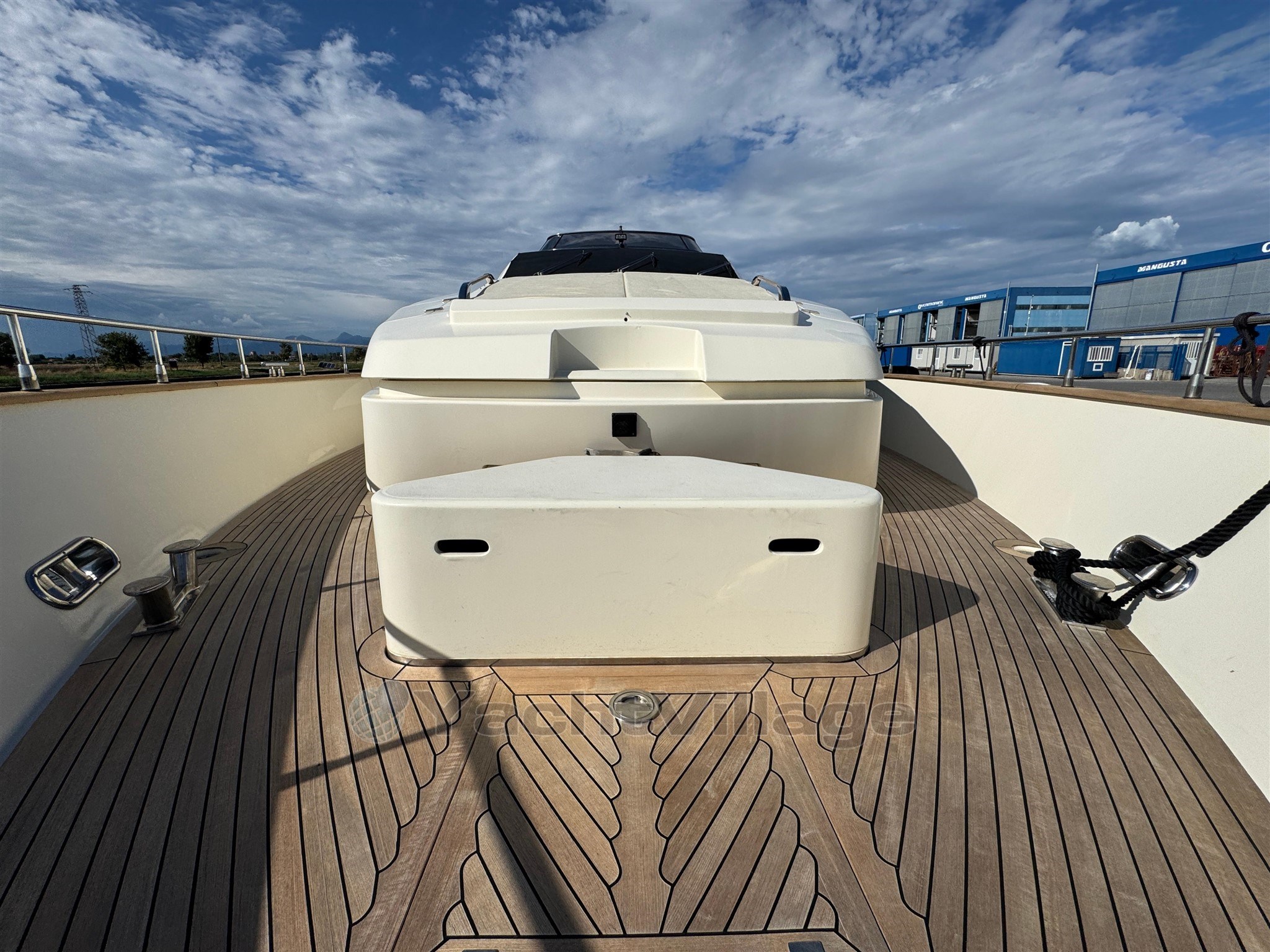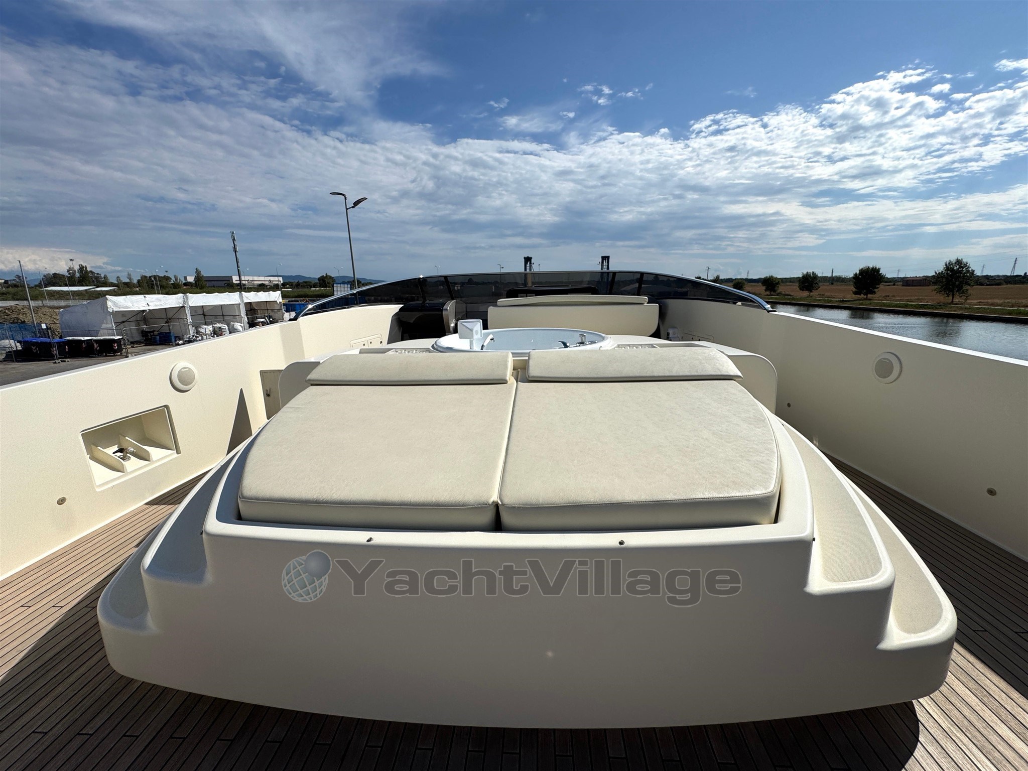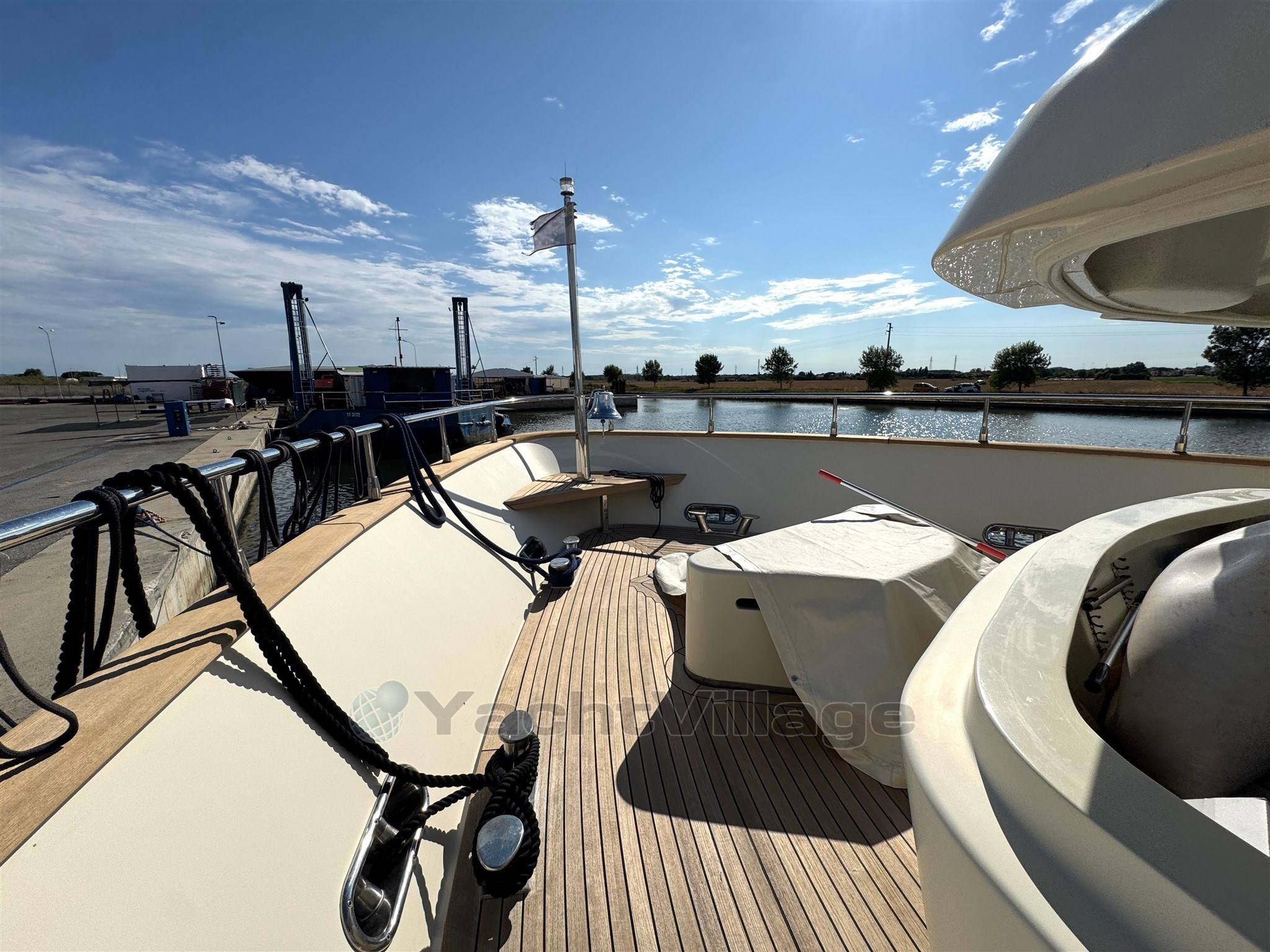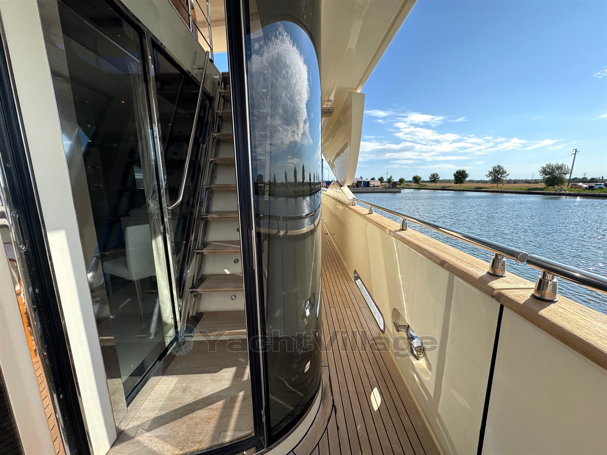 Alarma de humo/gas, alarma de motor, alarma de sentina, 2 anclajes (acero), 2 bombas de agua, 2 balsas salvavidas, baterías, alcantarillas, cubiertas laterales de teca, cargador de baterías, color especial (casco azul y estructura de superestructura), ducha externa, sistema de dirección doble, propulsor de popa (Idraulica), propulsor de proa (Idraulica), luces fijas en la popa, faro ajustable, flaps hidráulicos, garaje para tender (Tender da 4,20), daviones para motos de agua (A prora), Sistema de extinción de incen