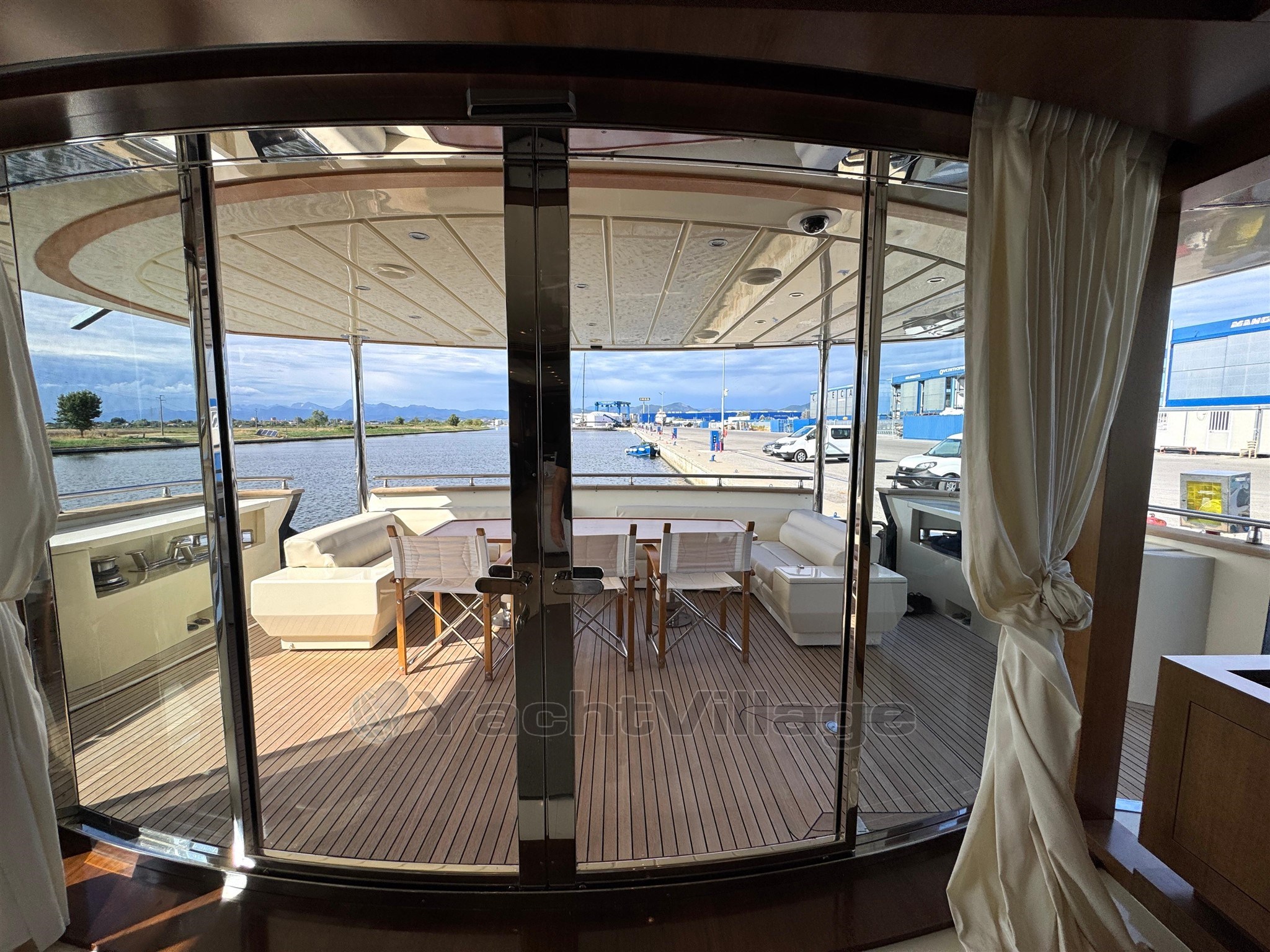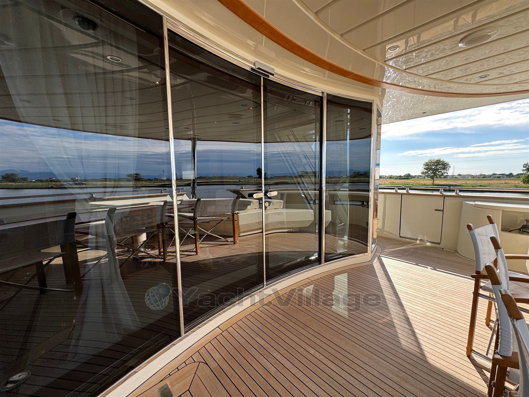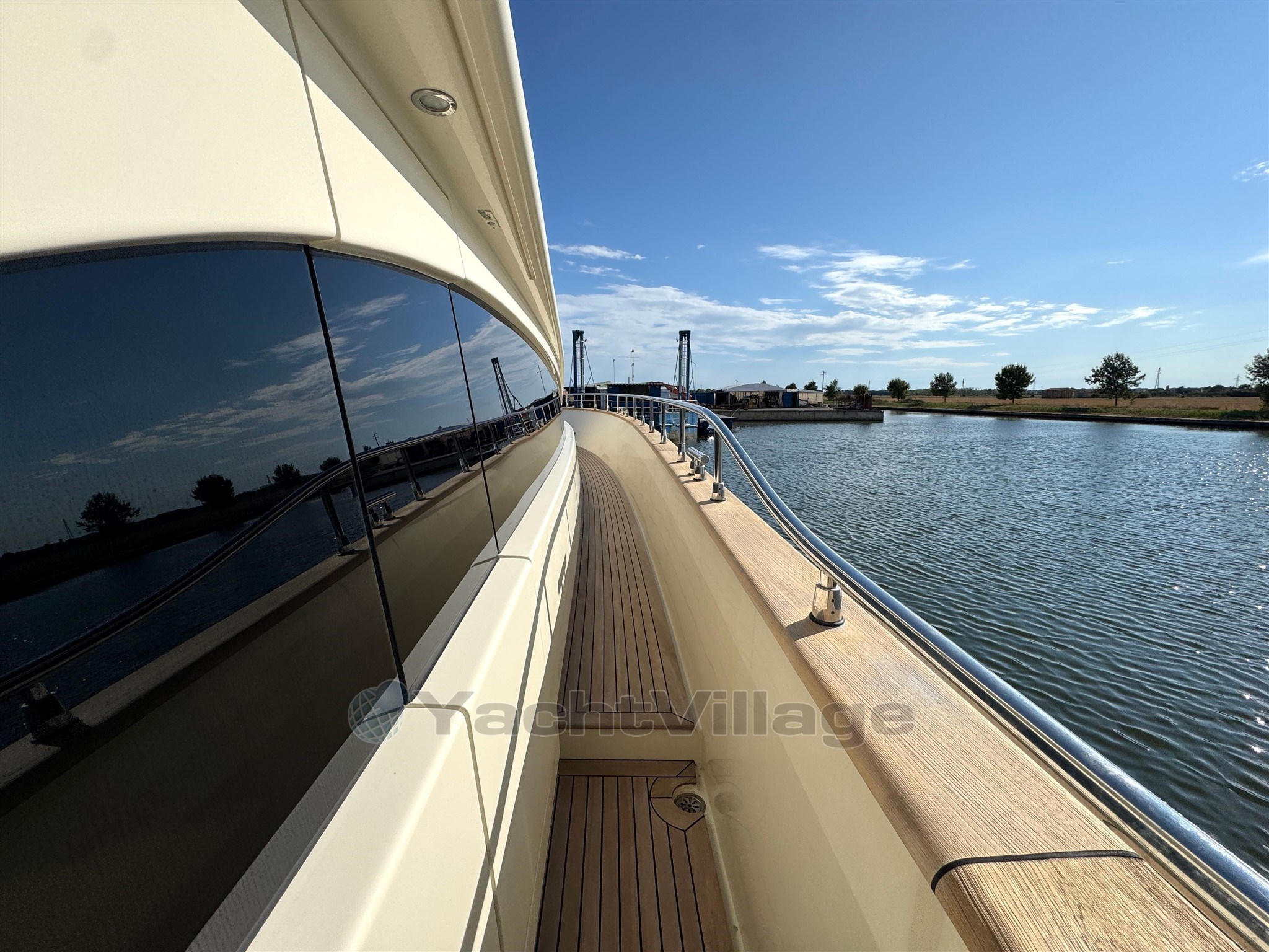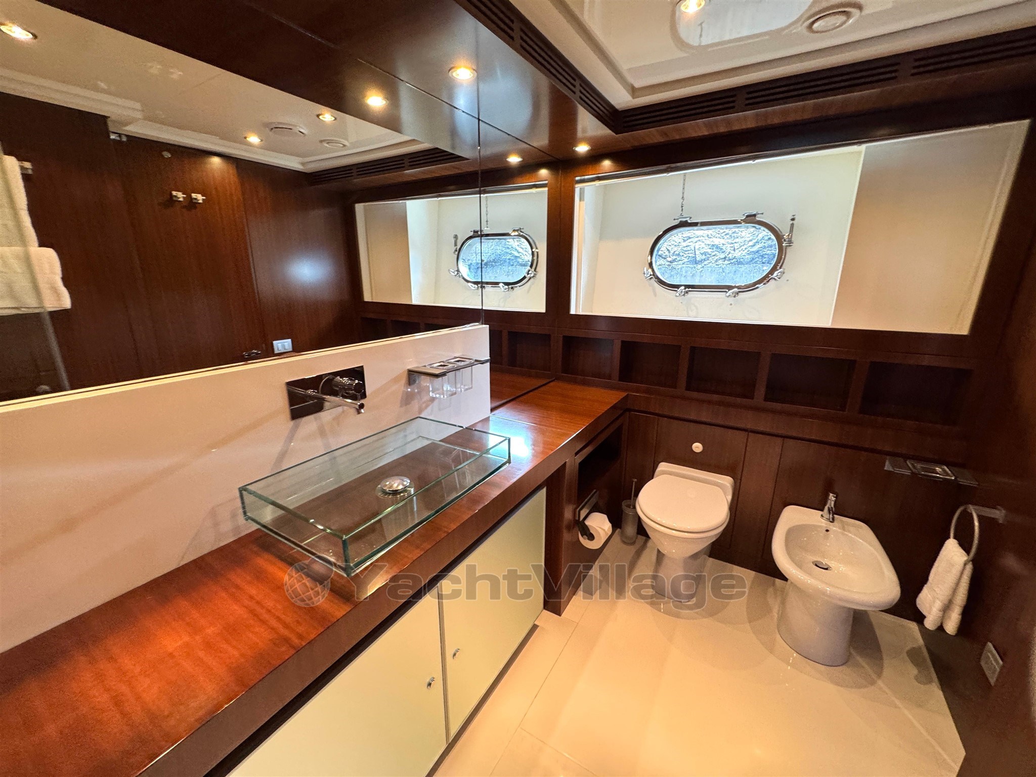 Alarma de humo/gas, alarma de motor, alarma de sentina, 2 anclajes (acero), 2 bombas de agua, 2 balsas salvavidas, baterías, alcantarillas, cubiertas laterales de teca, cargador de baterías, color especial (casco azul y estructura de superestructura), ducha externa, sistema de dirección doble, propulsor de popa (Idraulica), propulsor de proa (Idraulica), luces fijas en la popa, faro ajustable, flaps hidráulicos, garaje para tender (Tender da 4,20), daviones para motos de agua (A prora), Sistema de extinción de incen