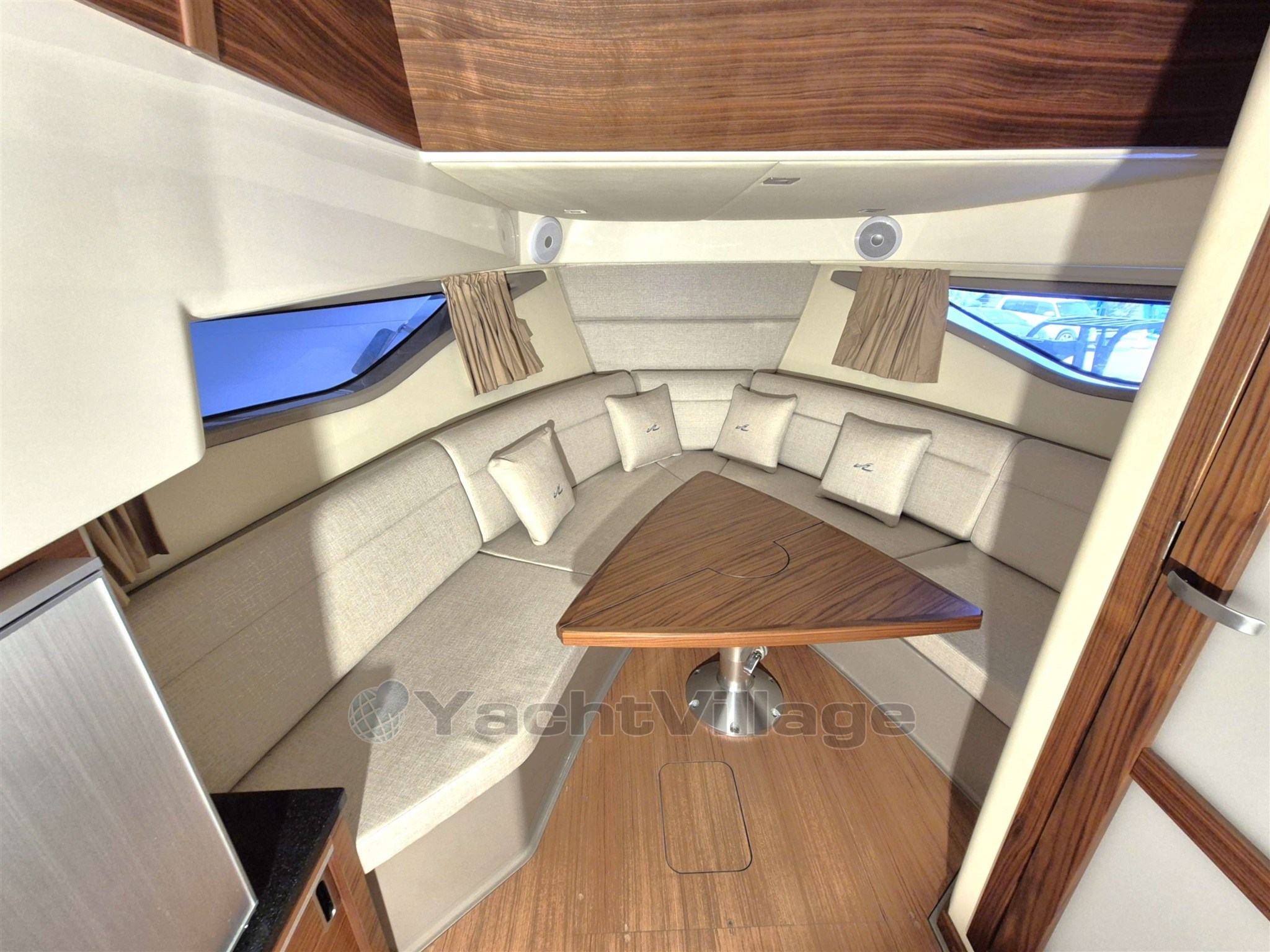 Avec une longueur de 9,80 mètres et une largeur de 3,25 mètres, il offre de beaux espaces de vie. L’intérieur, soigneusement aménagé, permet d’accueillir jusqu’à 5 couchages. Vous y trouverez notamment un réfrigérateur, un four micro-ondes, ainsi qu’une TV et un système stéréo Fusion avec haut-parleurs.