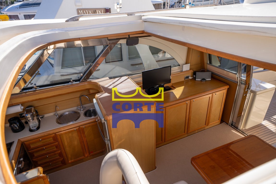 Apertura electrohidráulica y tapa de teca para alojar auxiliares, armario con fregadero y nevera