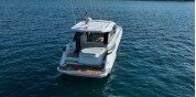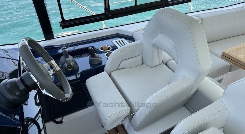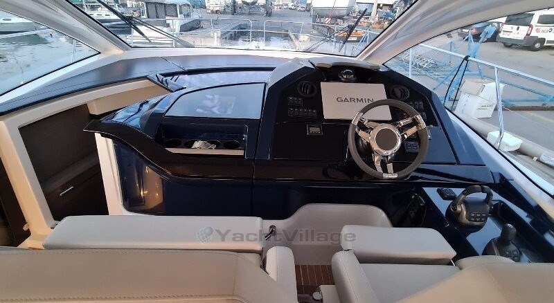 The owner's cabin with en-suite bathroom, a guest cabin at the bow with a second bathroom, a sociable saloon and a large, well-equipped kitchen. The elegant and warm atmosphere offered by the grey walnut wood characterises the new generation of express cruisers.