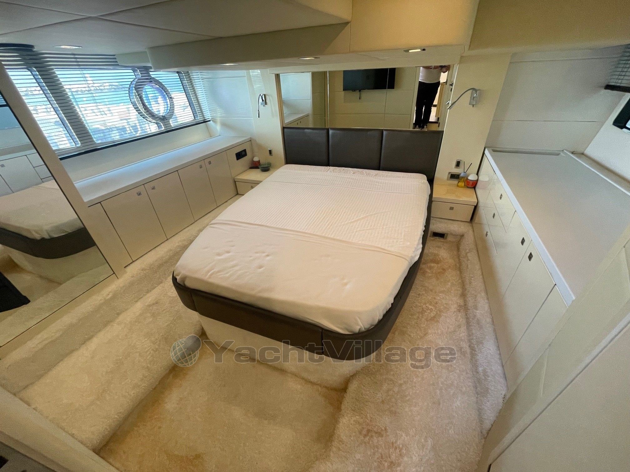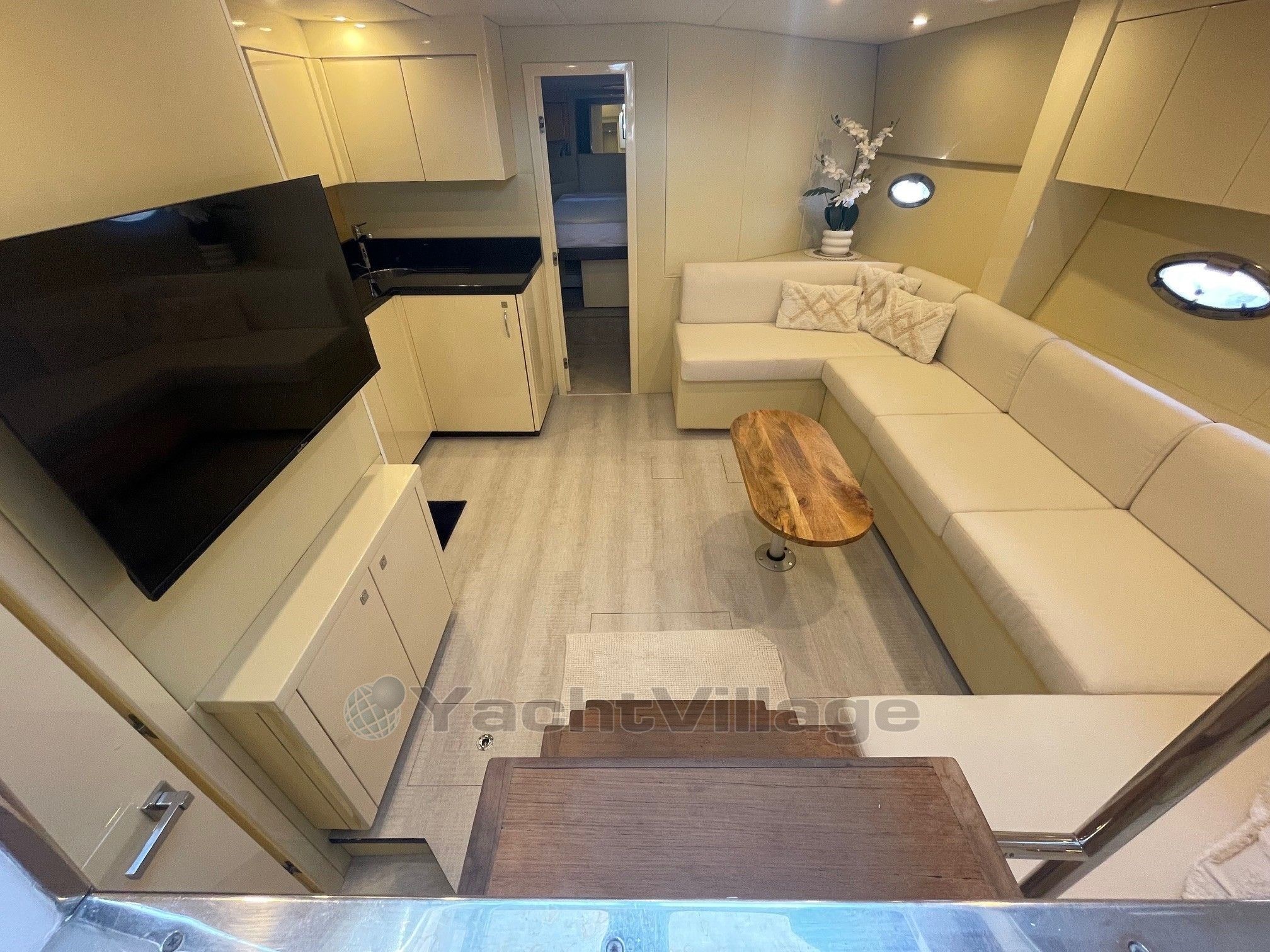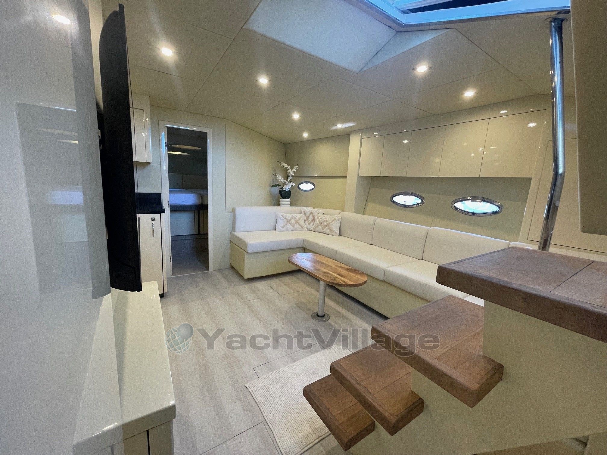 L’intérieur abrite un large salon avec TV et une cuisine équipée. L'hébergement se compose d’une cabine arrière-propriétaire et d’une cabine VIP avant avec un lit double séparable en deux couchettes. La salle d’eau avant a été supprimée pour agrandir le salon. Nous en retrouvons une seule, à double accès, avec douche séparée et WC électrique.
