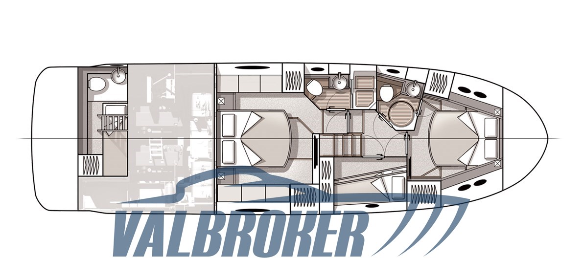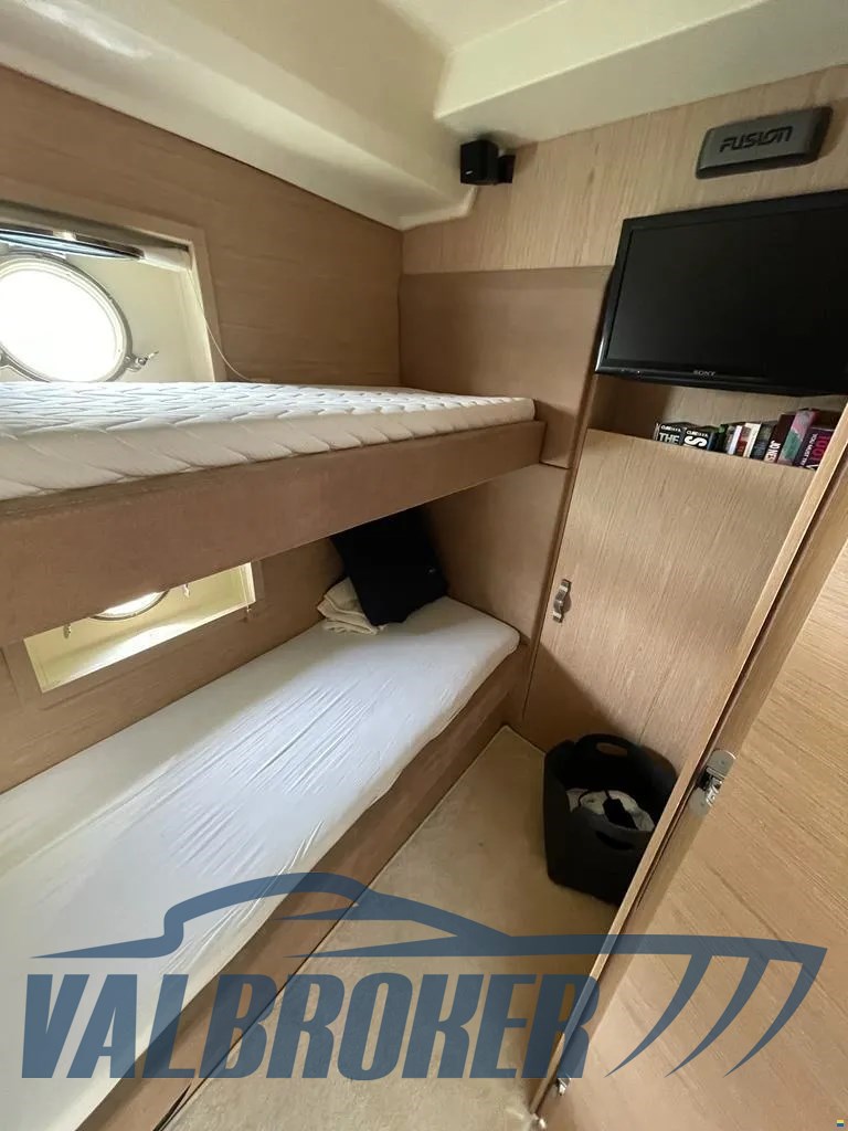 Flybridge qui se distingue par l’élégance de ses tissus, l’attention portée aux détails et le design italien parfaitement réussi. Trois cabines doubles avec deux salles de bain.
