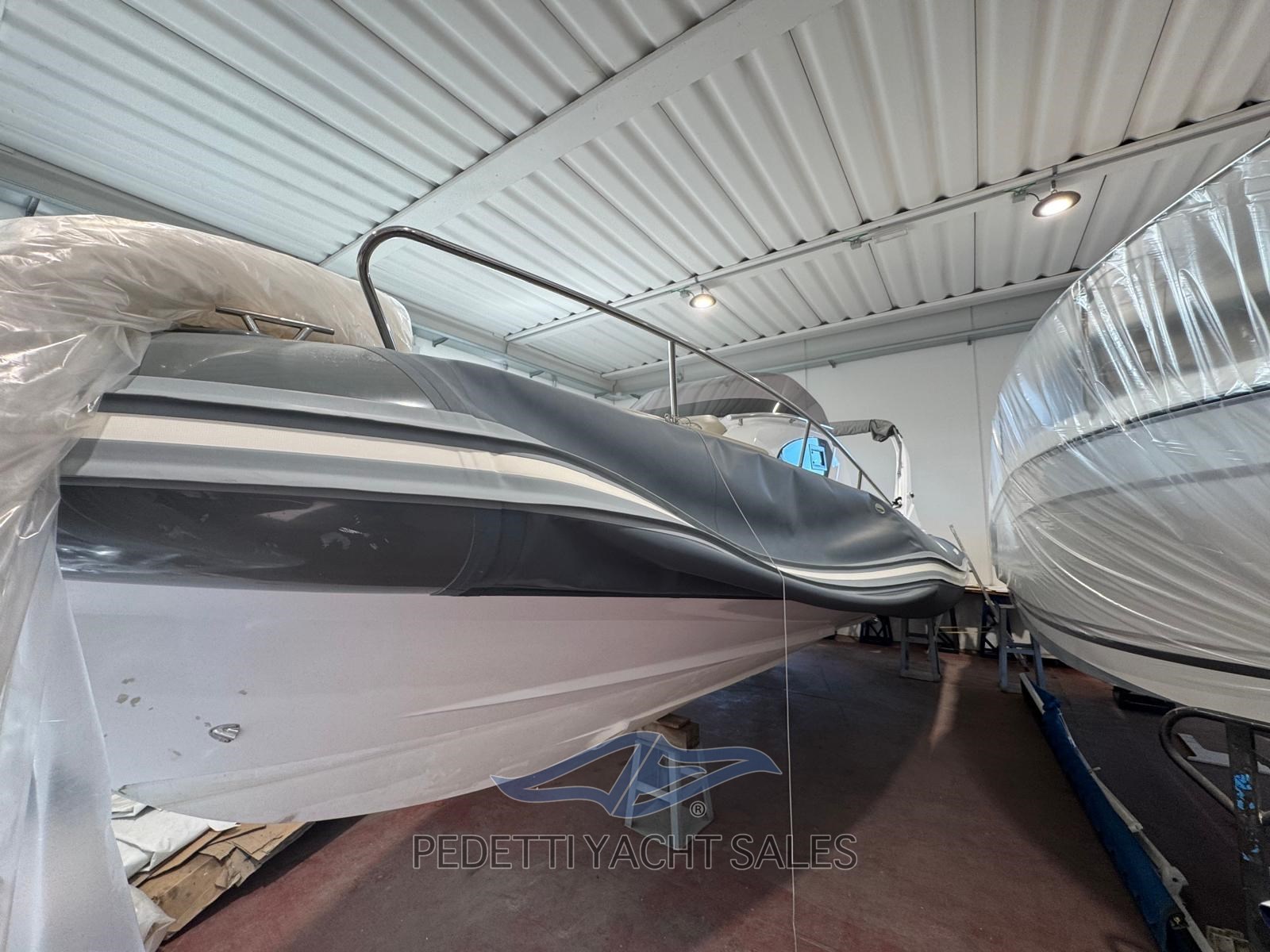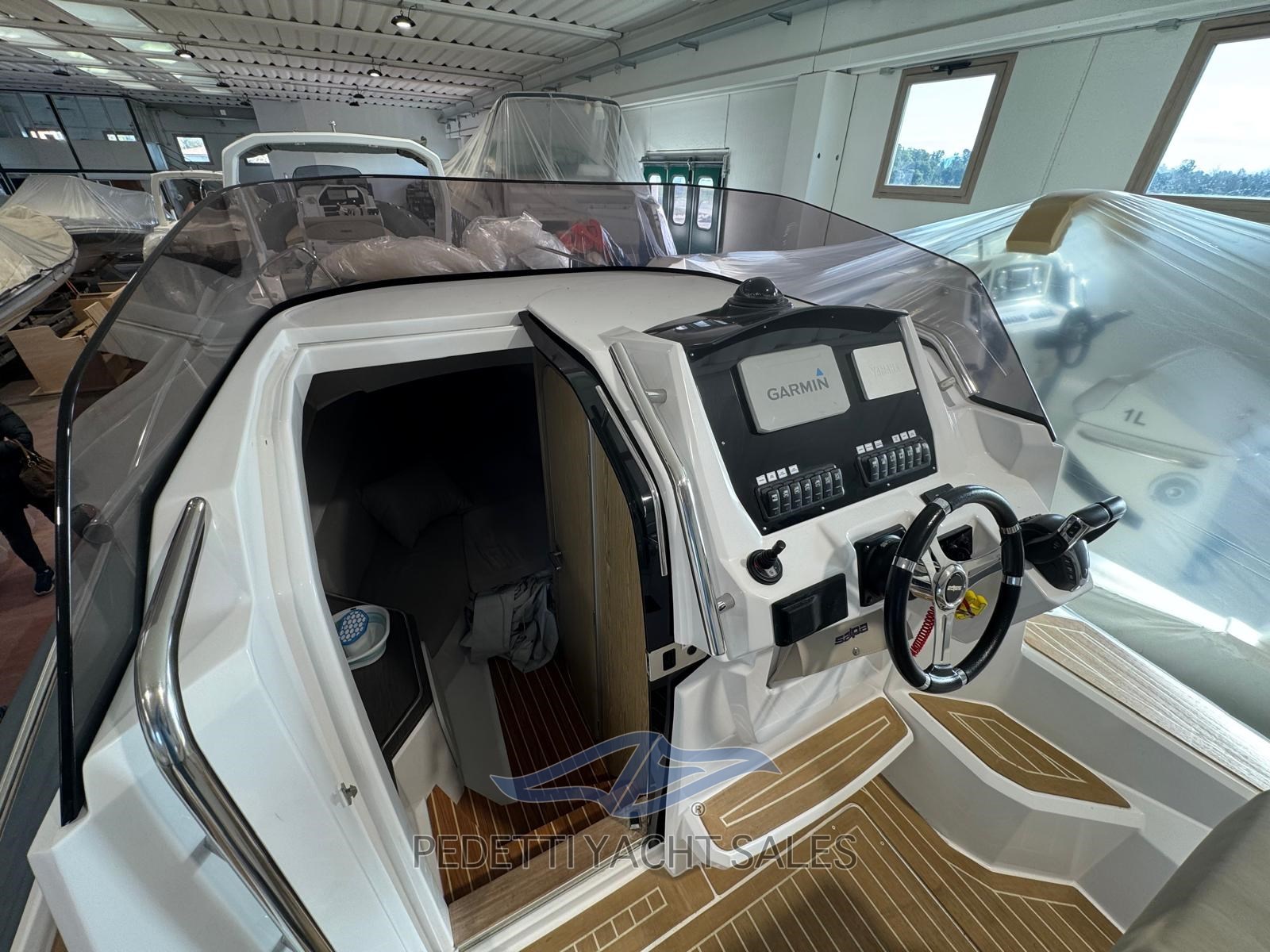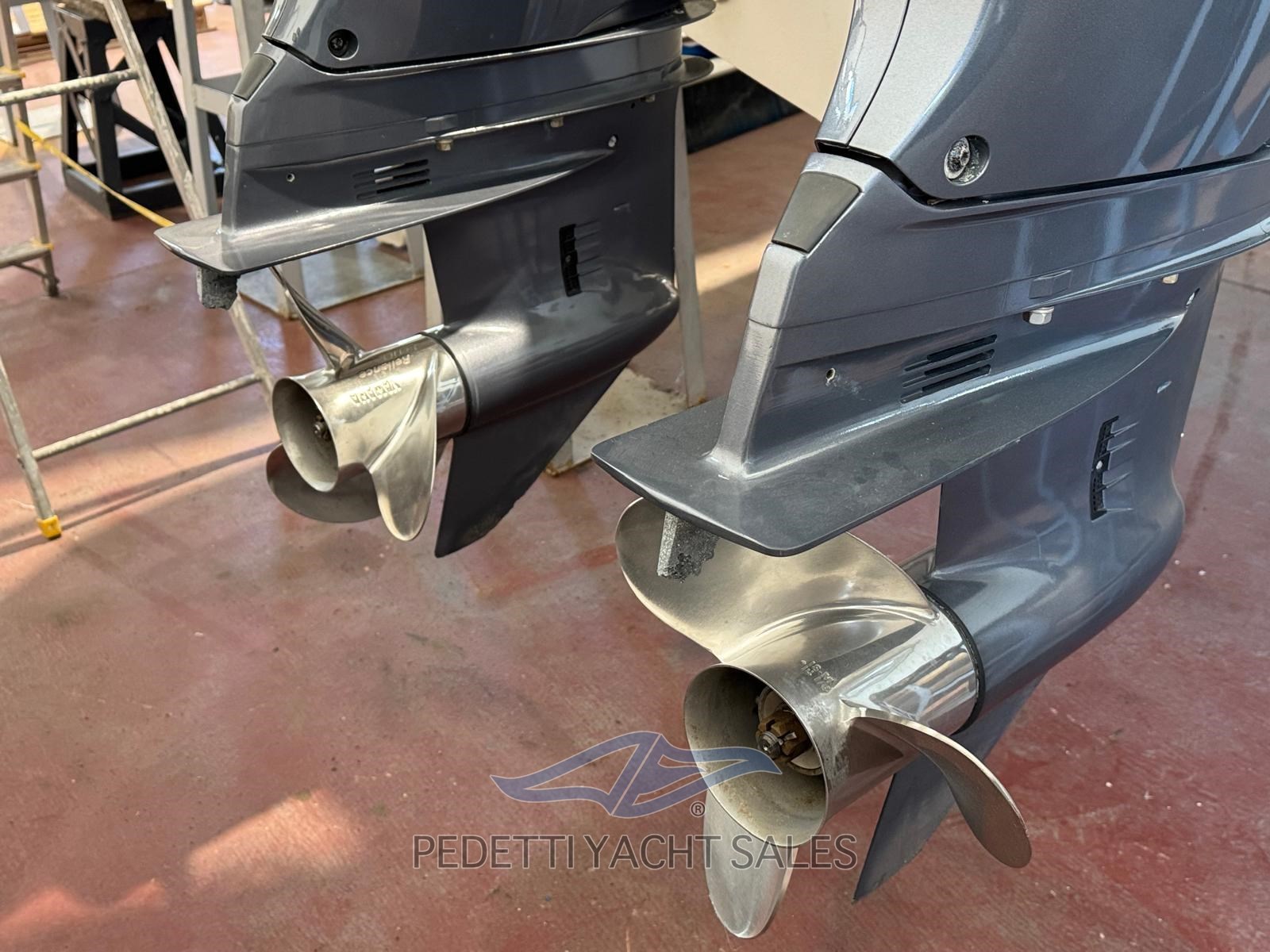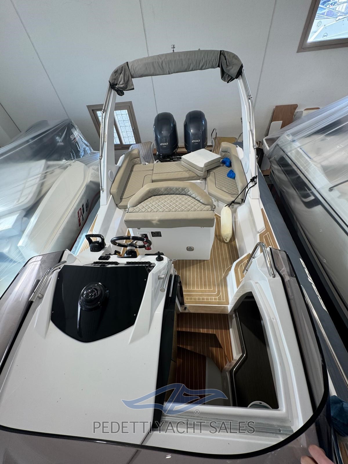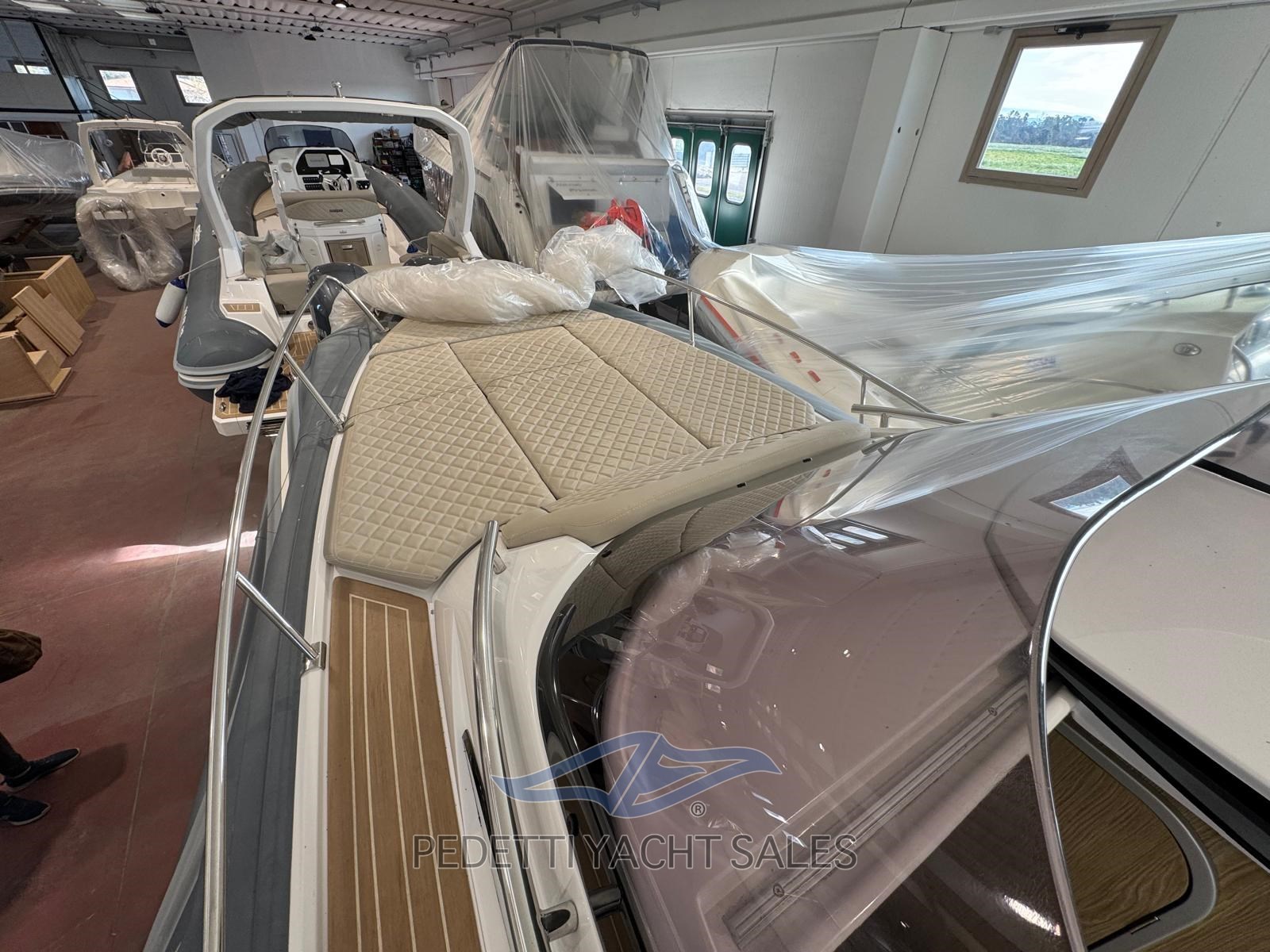 Cabine avec salle de bain séparée équipée de toilettes électriques. Il y a une barre de sécurité en fibre de verre avec auvent télescopique en acier inoxydable, un propulseur à proue, des cales rétractables, des plateformes sur le tableau arrière et un éclairage LED.