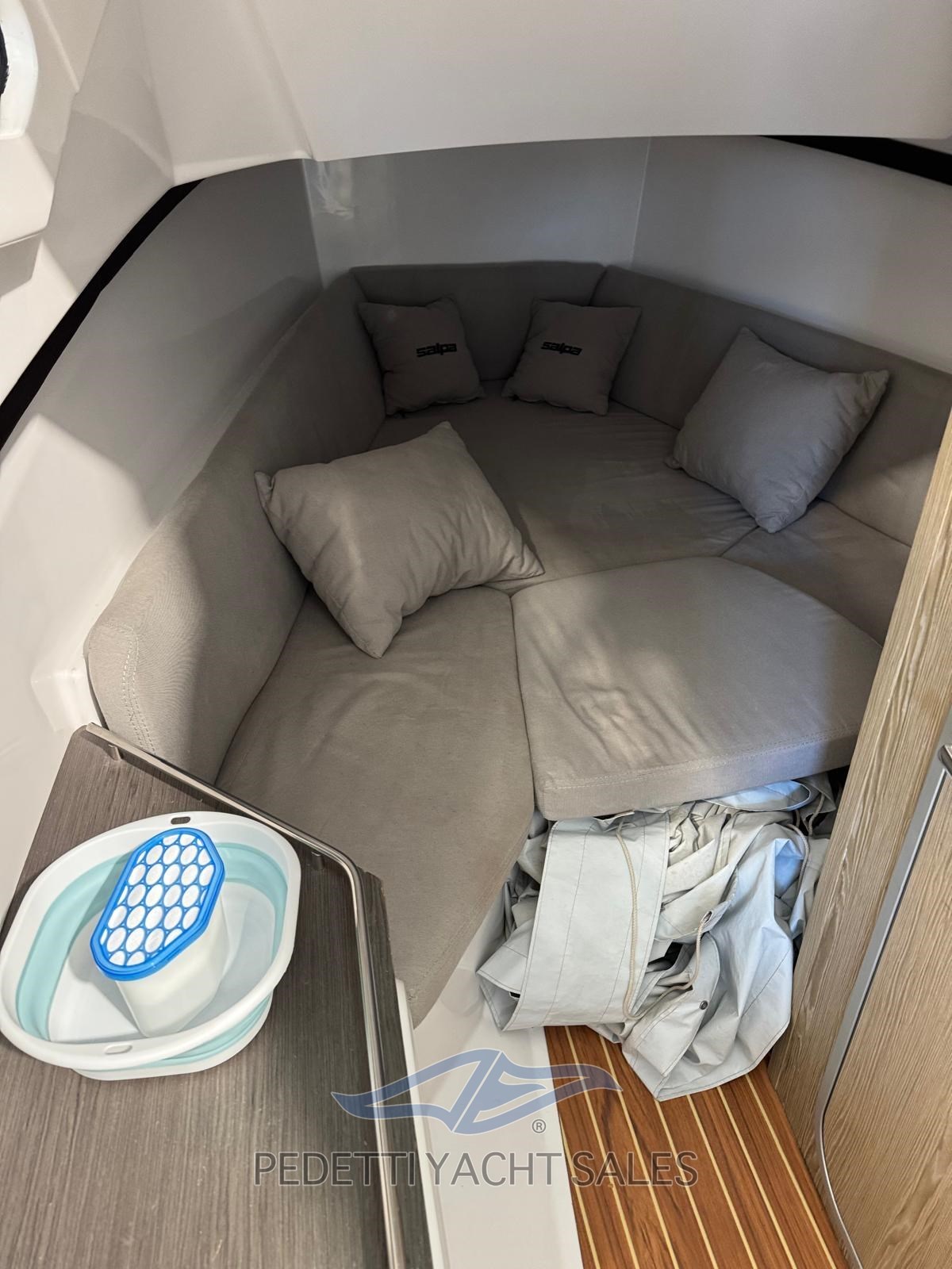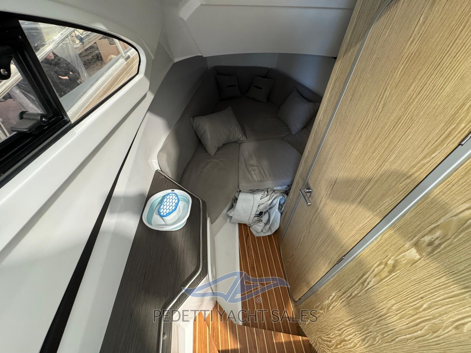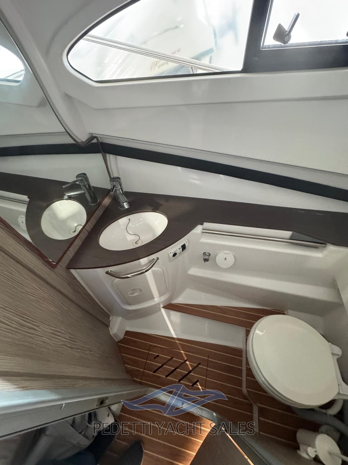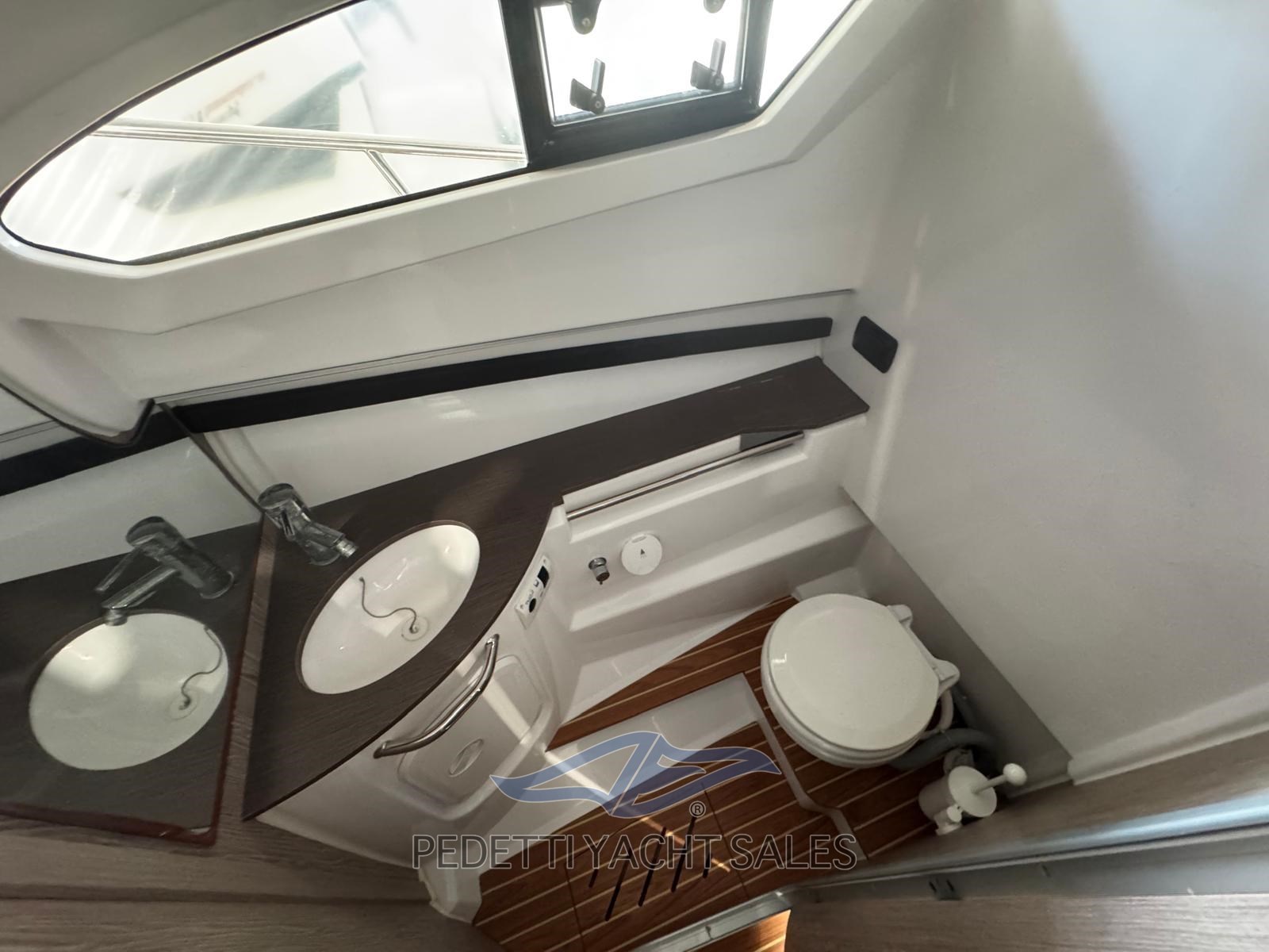 Cabine avec salle de bain séparée équipée de toilettes électriques. Le bateau est également équipé d’une barre de sécurité en fibre de verre avec bimini télescopique en acier inoxydable, d’un propulseur d’étrave, de cales encastrées, de plateformes arrière et d’un éclairage LED.