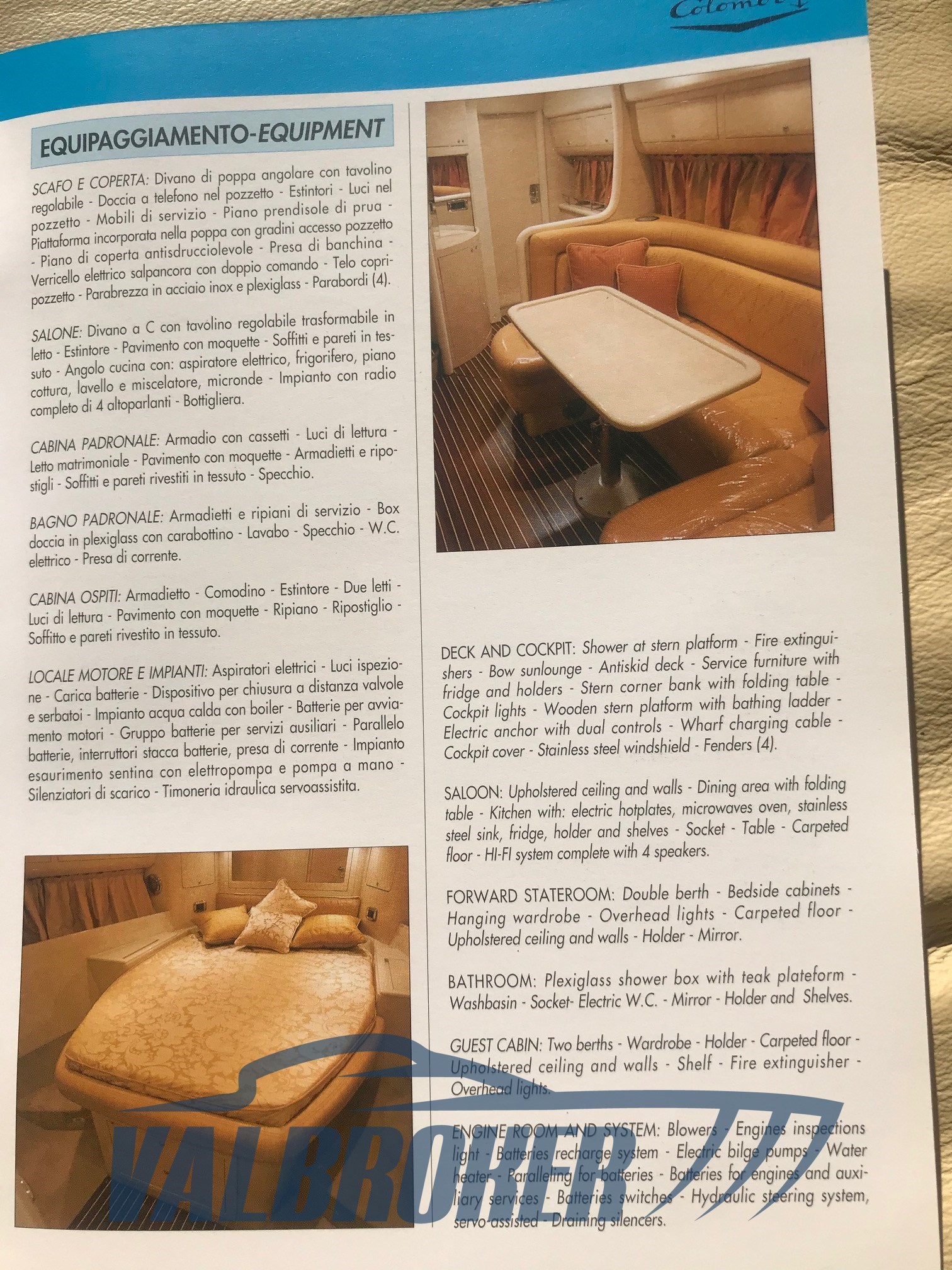 Colombo 44 propulsé par 2x450 HP Cummins 6 cylindres turbo diesel en ligne avec seulement 450 heures. Vendu neuf sur le lac de Côme, utilisé deux mois par an en Sardaigne puis toujours dans le hangar. Propriétaire unique jusqu'en 2021. Cabine principale à l'avant avec lit double et deuxième cabine avec lits superposés et salle de bain séparée. Refit complet réalisé sur le lac de Côme par Yacht Service de Paolo Meroni au printemps 2022/hiver 2023.