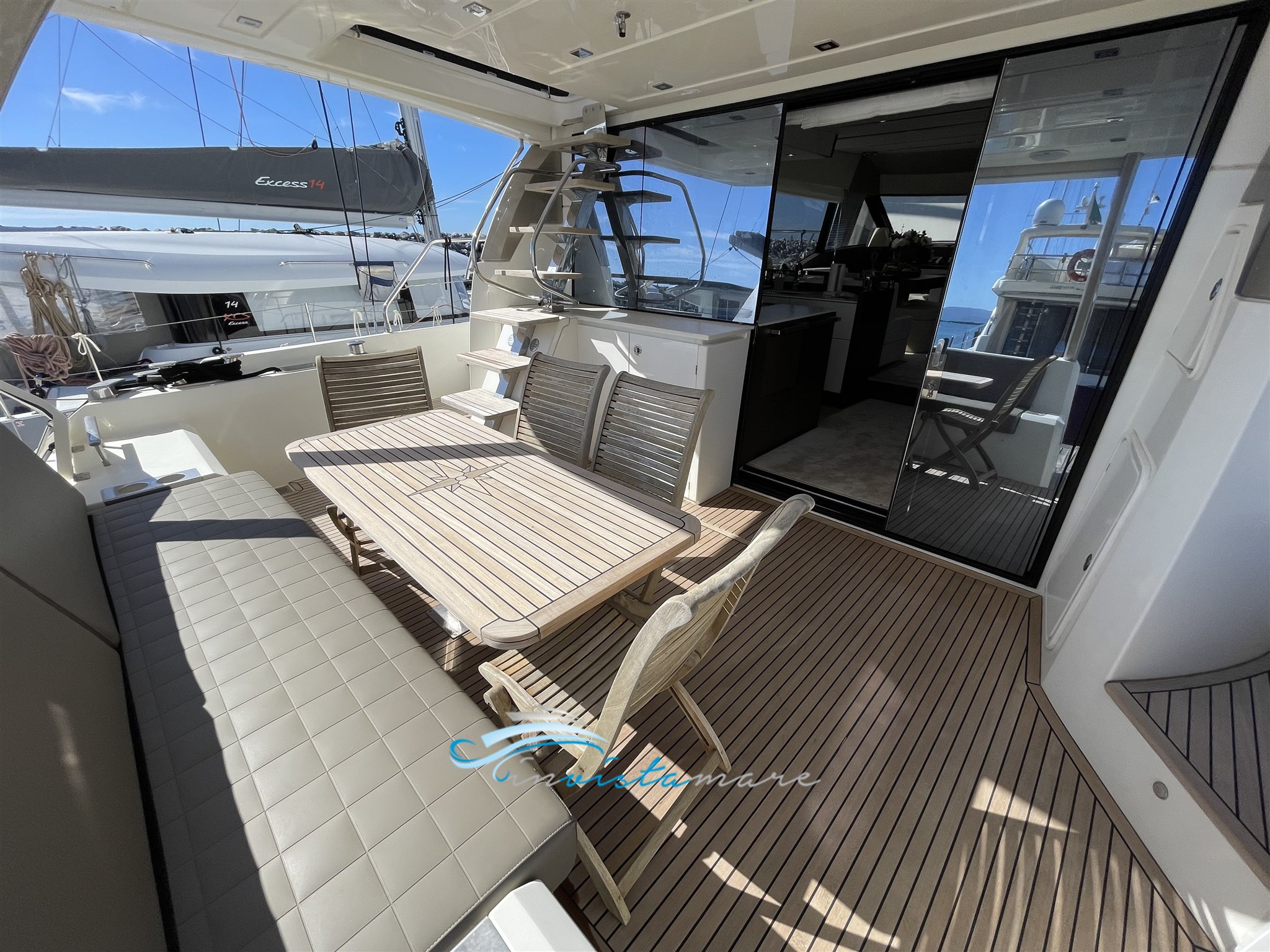 Flybridge : Teck, 2 frigos 2024, Coussins de table 2025, Toit électrique