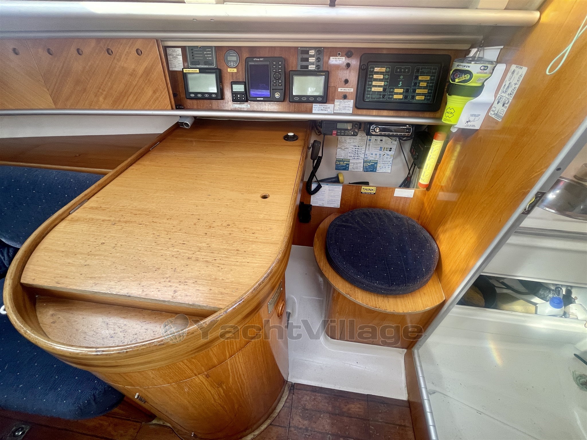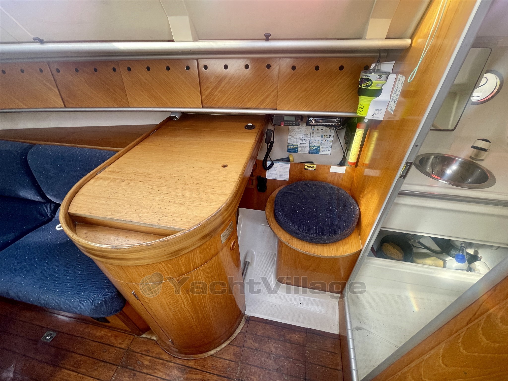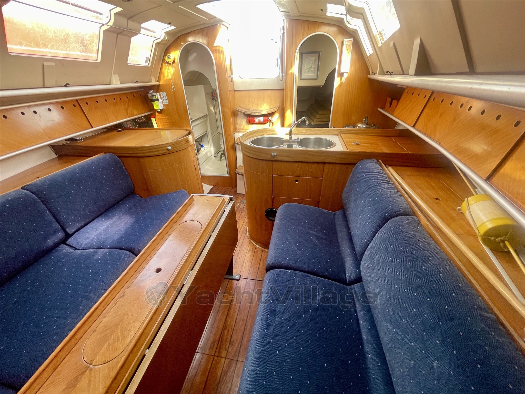 Saloon: 2 x bench seats/berths, adjustable table with bottle storage, storage lockers, clock/barometer, brass oil lamp, navigation station, deck hatch
